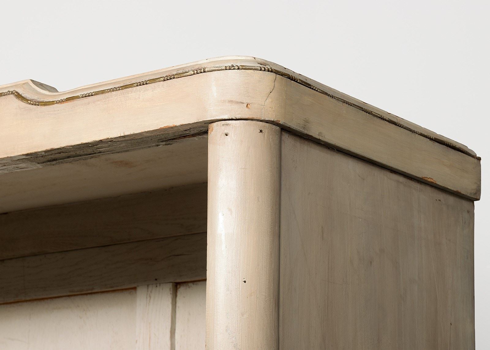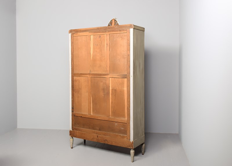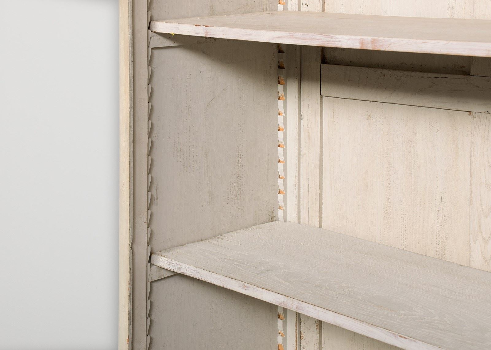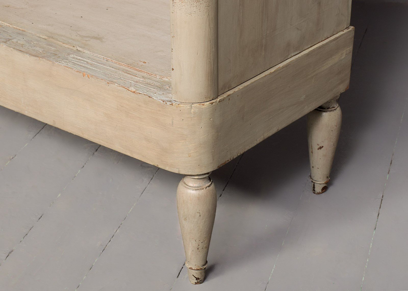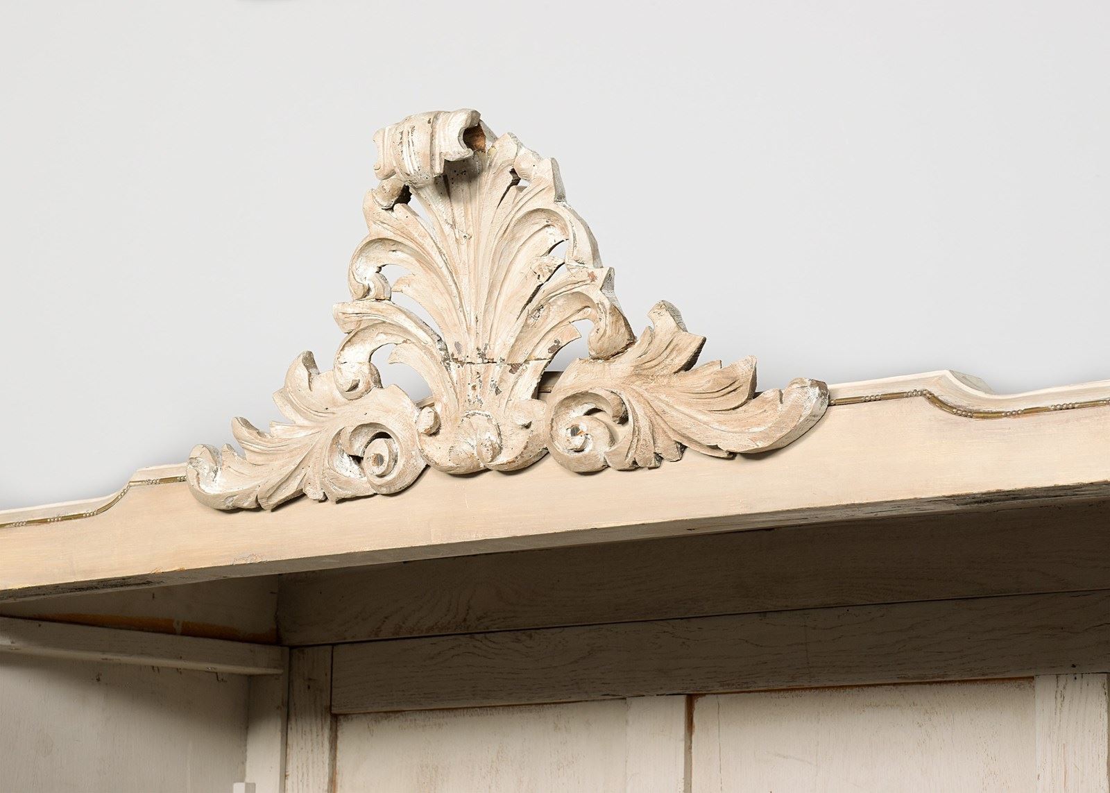 Circa 1880. A late Victorian painted French bookcase, the top surmounted by a carved and pierced foliate mount, with four adjustable shelves, beneath the bottom shelf, there is a simple frieze, all supported on four turned tapering feet.