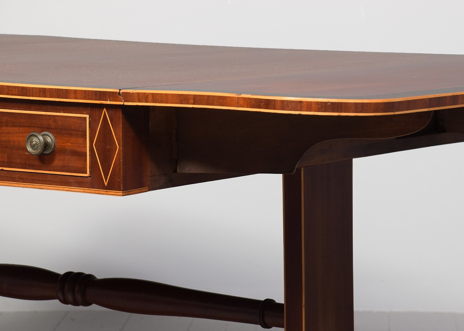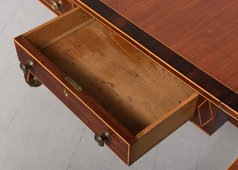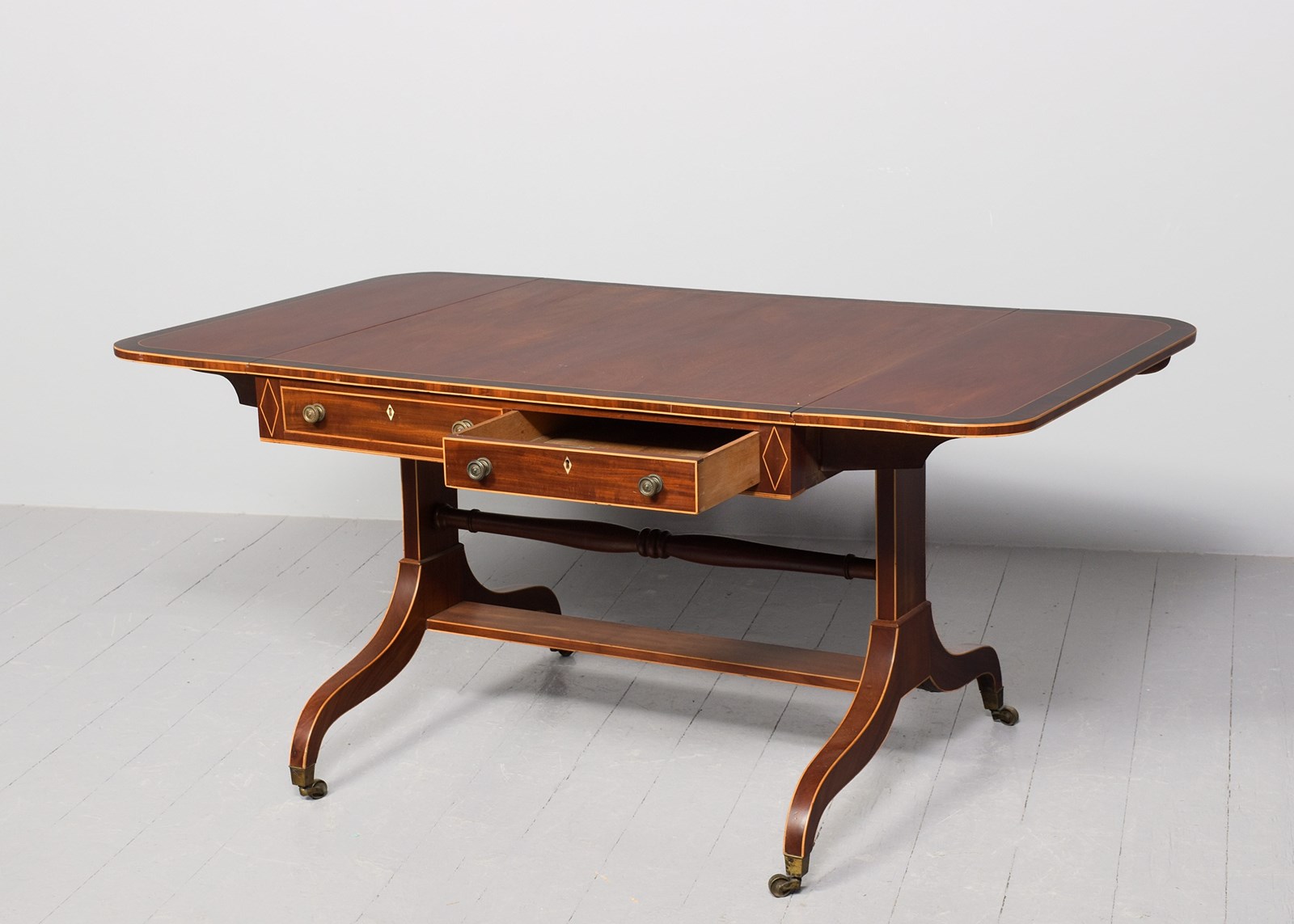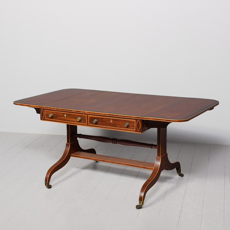 Circa 1810. A quality large Regency mahogany and inlaid sofa table of desirable proportions, the top in well-figured mahogany with boxwood string inlay and rosewood crossbanding, the two D-shaped flaps supported by wood hinges, the frieze with a pair of drawers in each side, one faux and each with heraldic escutcheons cast brass knob handles and ash liners indicating it could be Scottish, resting on a pair of inlaid trestle ends, braced by a turned stretcher and rectangular stretcher, issuing downward-facing saber legs, with string inlay on all the facings, terminating on a tapering brass cup with original brass castors.