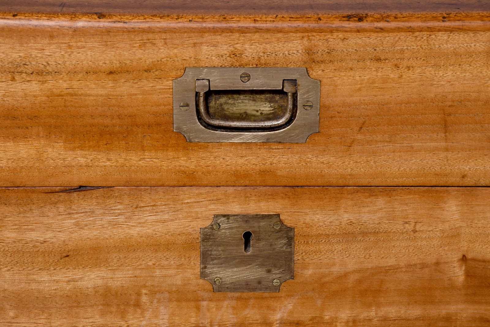Circa 1890. Large Victorian brass-bound solid camphorwood trunk with a renowned Hong Kong maker's label and in perfect condition. The top with brass corners and a central brass plaque, the sides with heavy cast brass carrying handles. The deep lid with inset military handle opens to an interior bearing the original label of Sui Kee Chan, Cabinetmaker, Queens Road East, Hong Kong and bearing The Prince of Wales Medal, awarded at the Colonial and Indian Exhibition of 1866.