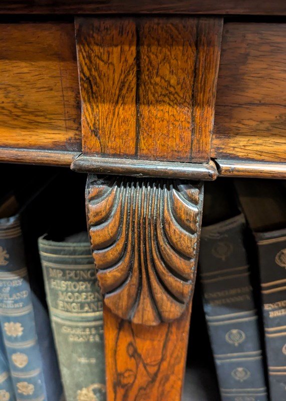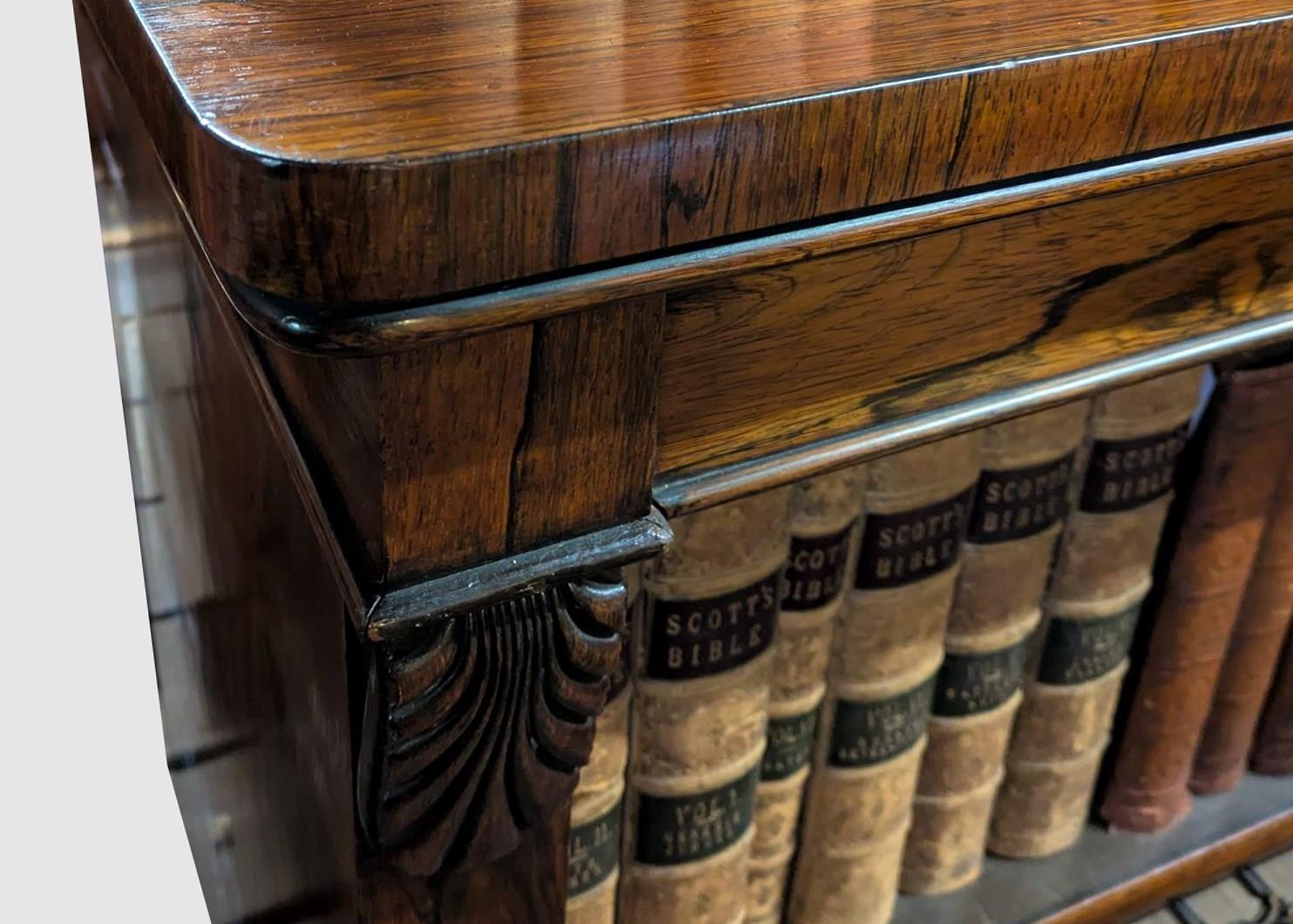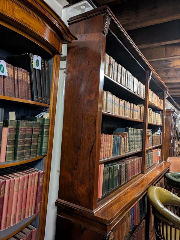 Circa 1840. Exceptional quality, large early Victorian Brazilian rosewood open bookcase. Surmounted by a simple moulded cornice, the upper sections in two parts, each with three adjustable shelves, flanked and divided by acanthus carved pilasters. The base with a beautiful figured-rosewood top with a lovely colour and patina above 4 shallow frieze drawers, over 2 deeper bookcases with single adjustable shelves. All over an enclosed moulded plinth base. In excellent condition.