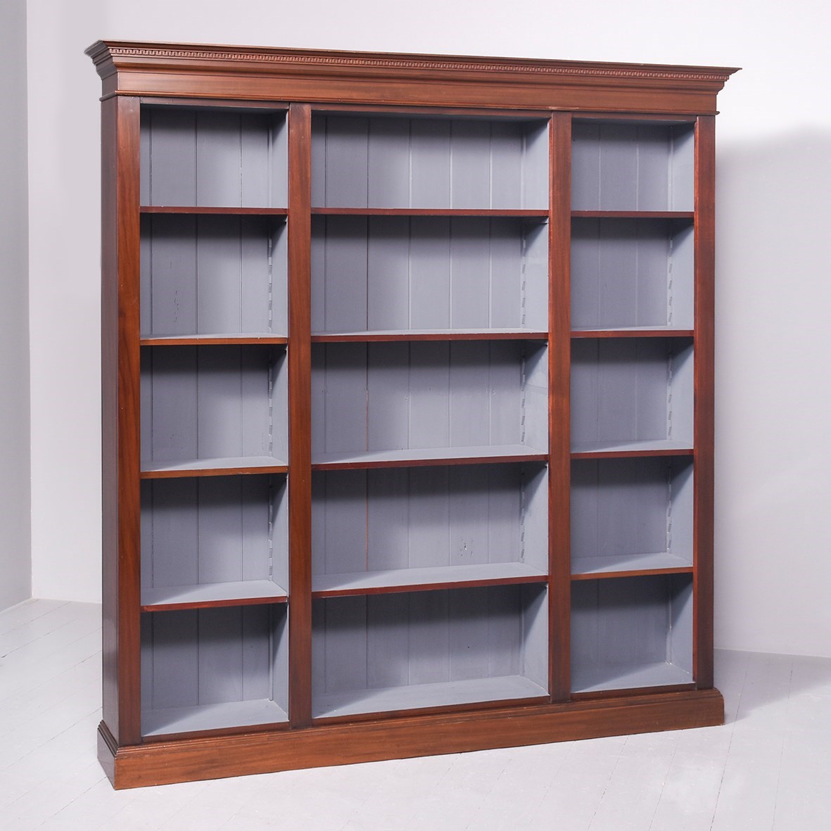 Circa 1880 with adaptations. Late Victorian tall mahogany open bookcase with clean lines. Surmounted by a Greek key cornice and a simple frieze, the three bookcase sections (wider in the middle) separated and flanked by vertical mahogany columns and each with four adjustable shelves, all sitting on an enclosed plinth base. In excellent condition.