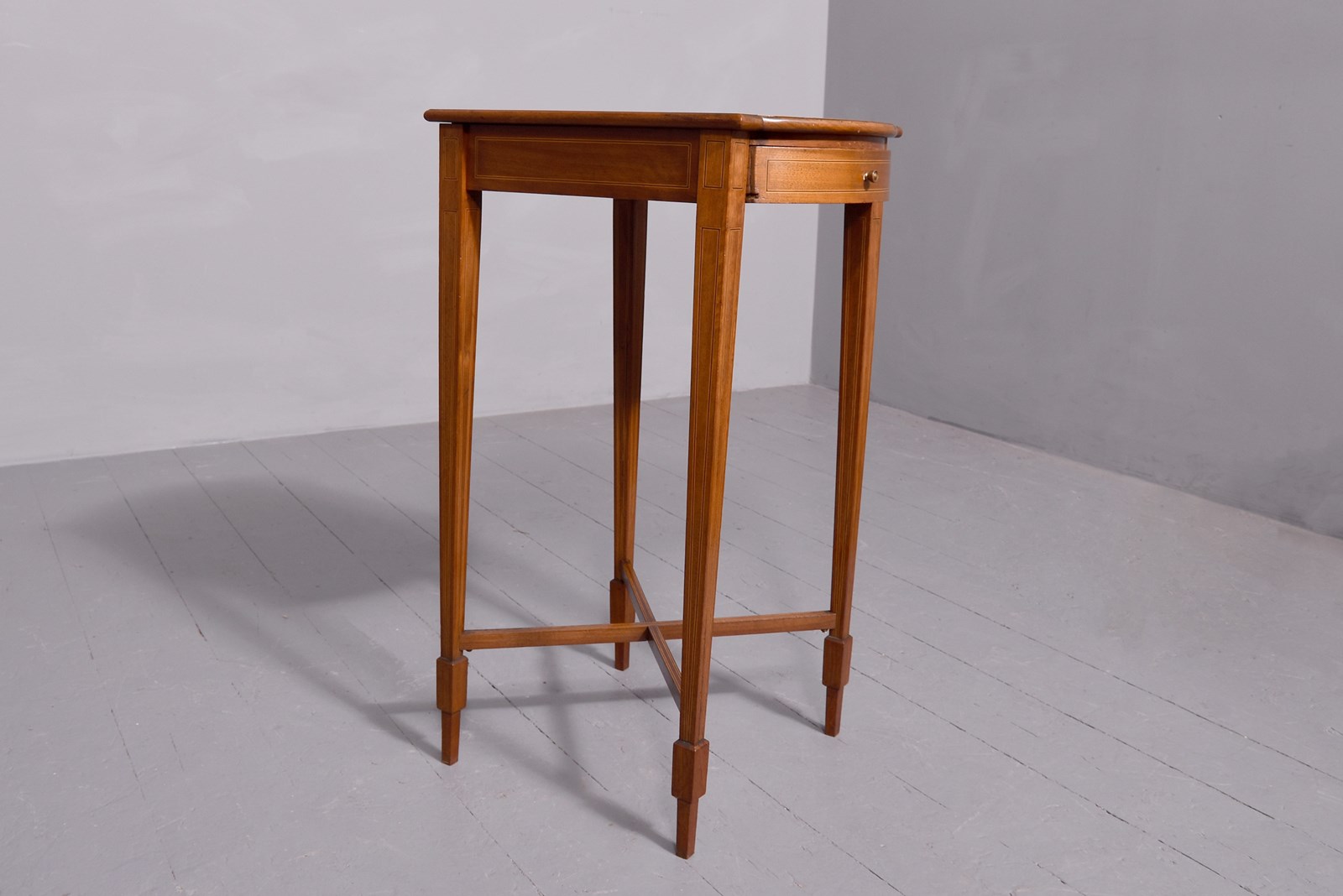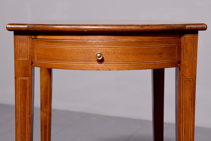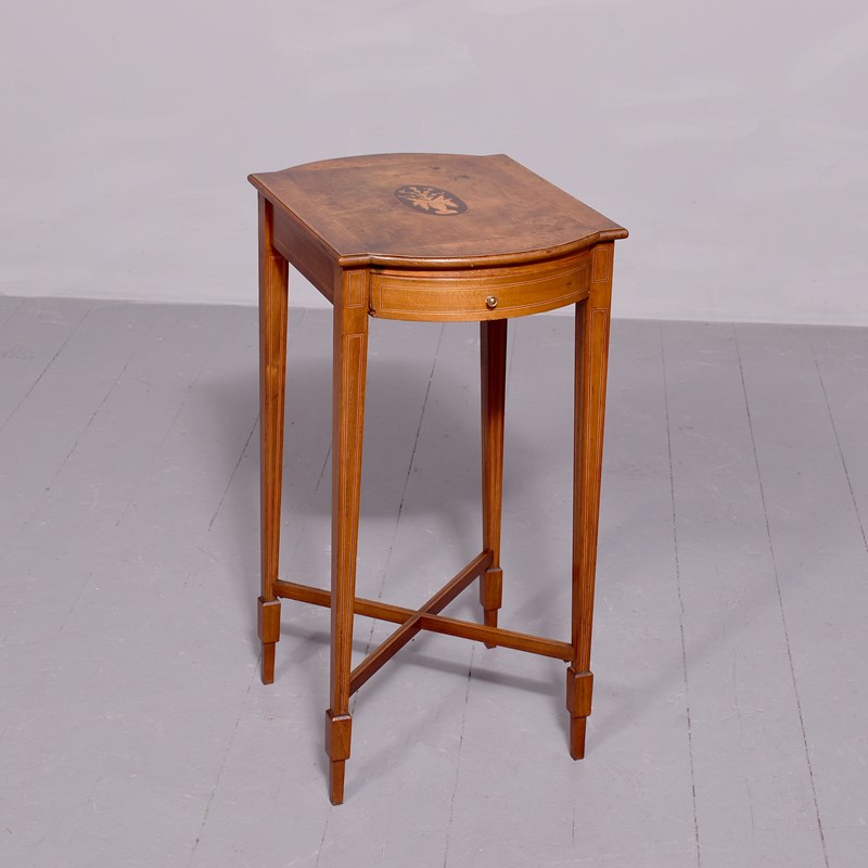 Circa 1890. Quality late Victorian Sheraton-style figured and burr walnut inlaid side table. The rectangular top with bow ends, extensive inlay and a central panel with vase and flowers. The full length bow-front drawer can open from either side. All supported on square inlaid tapering legs with X stretchers. Would make an attractive lamp or side table.