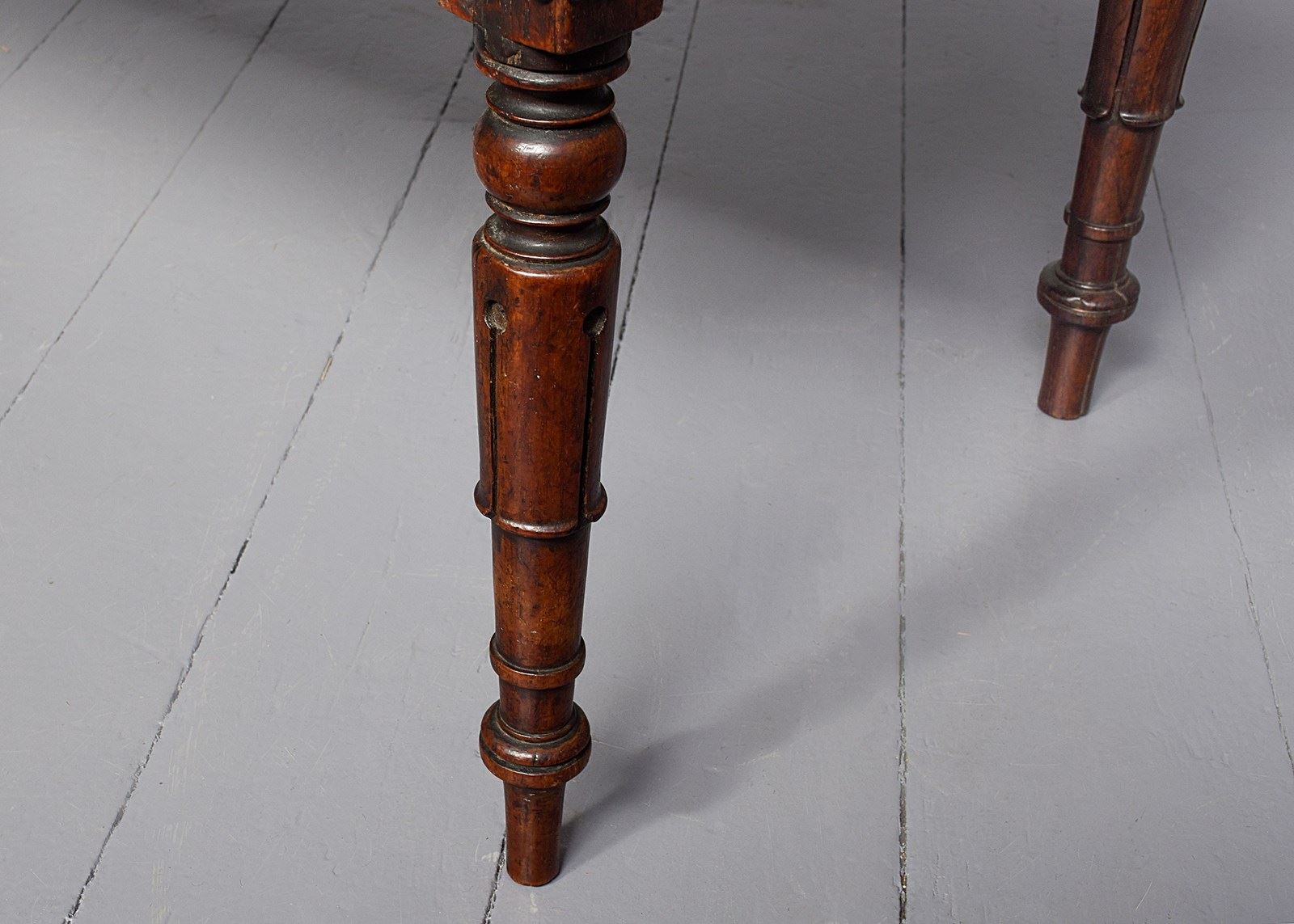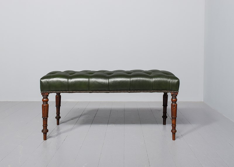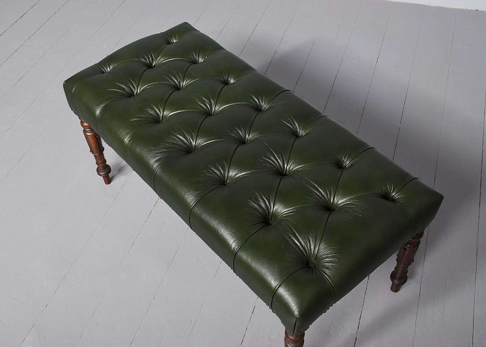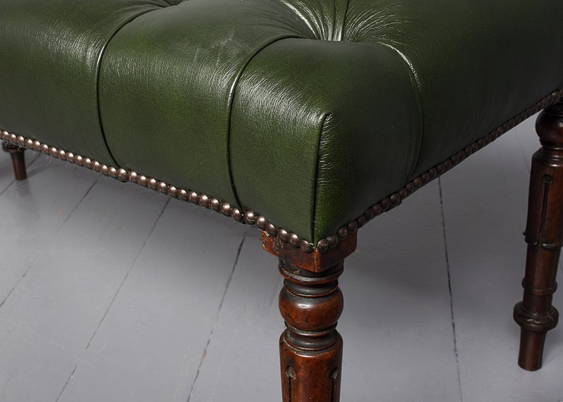 Circa 1840 with adaptations. Regency leather upholstered mahogany-framed long bench/stool. The top recently reupholstered in quality green buttoned hide with brass studding along the sides. All supported on tapering, ring turned, fluted legs with a lovely colour and patina.