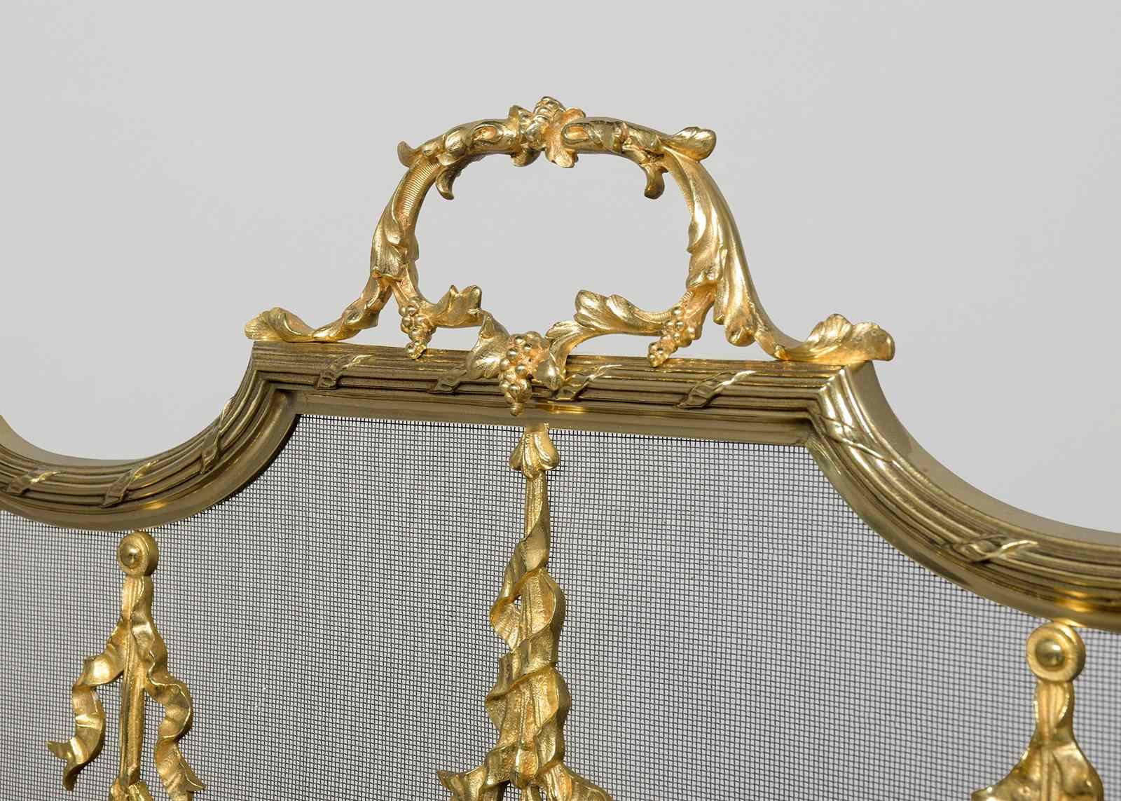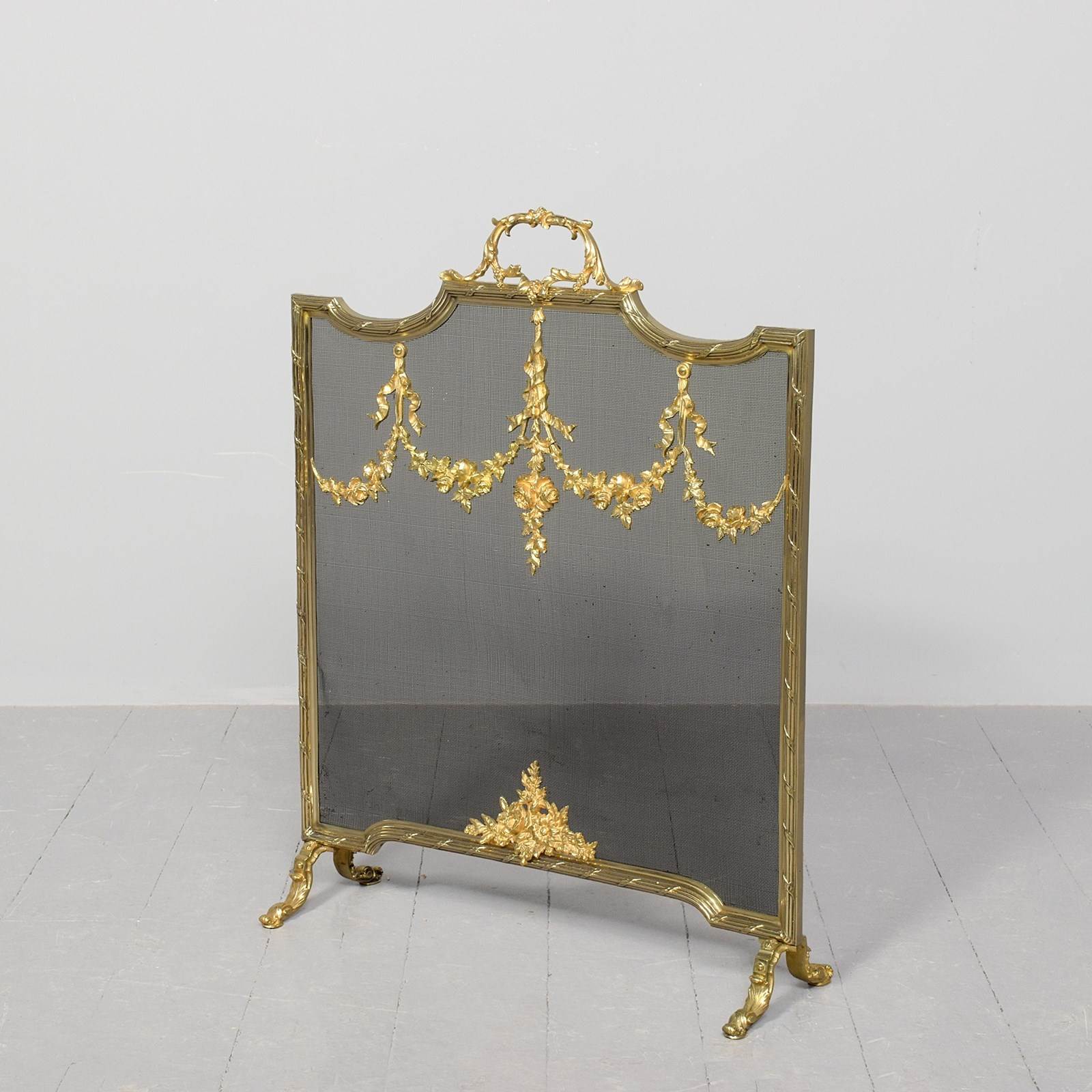 Circa 1900. A stylish Louis XV style cast brass and mesh fire screen, the top with an elegant lifting handle with foliate casting, the shaped frame which is ribbed with crossover patterns, with drapes including ribbons and foliate designs in cast brass laid on a fine mesh, the bottom has a small cluster of pierced brass of foliate casting, resting on four squat trestles end feet and a scrolling foliate toe.