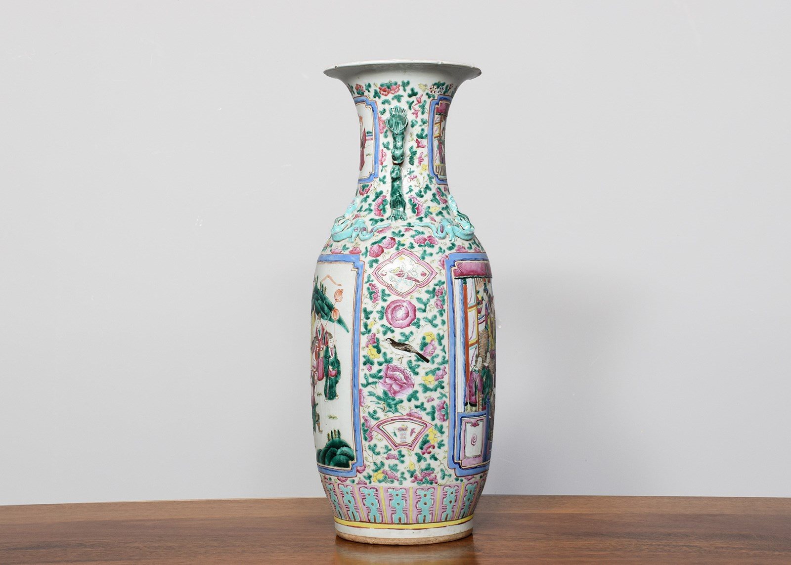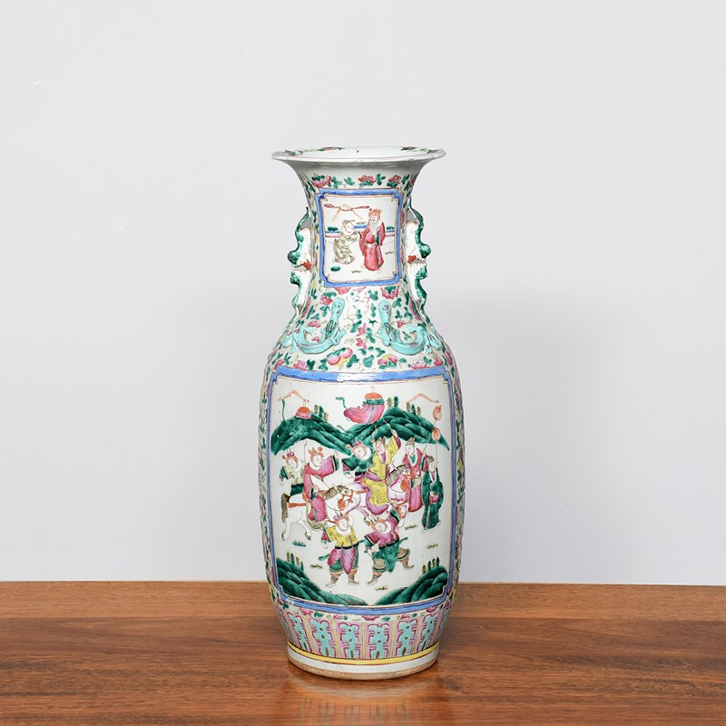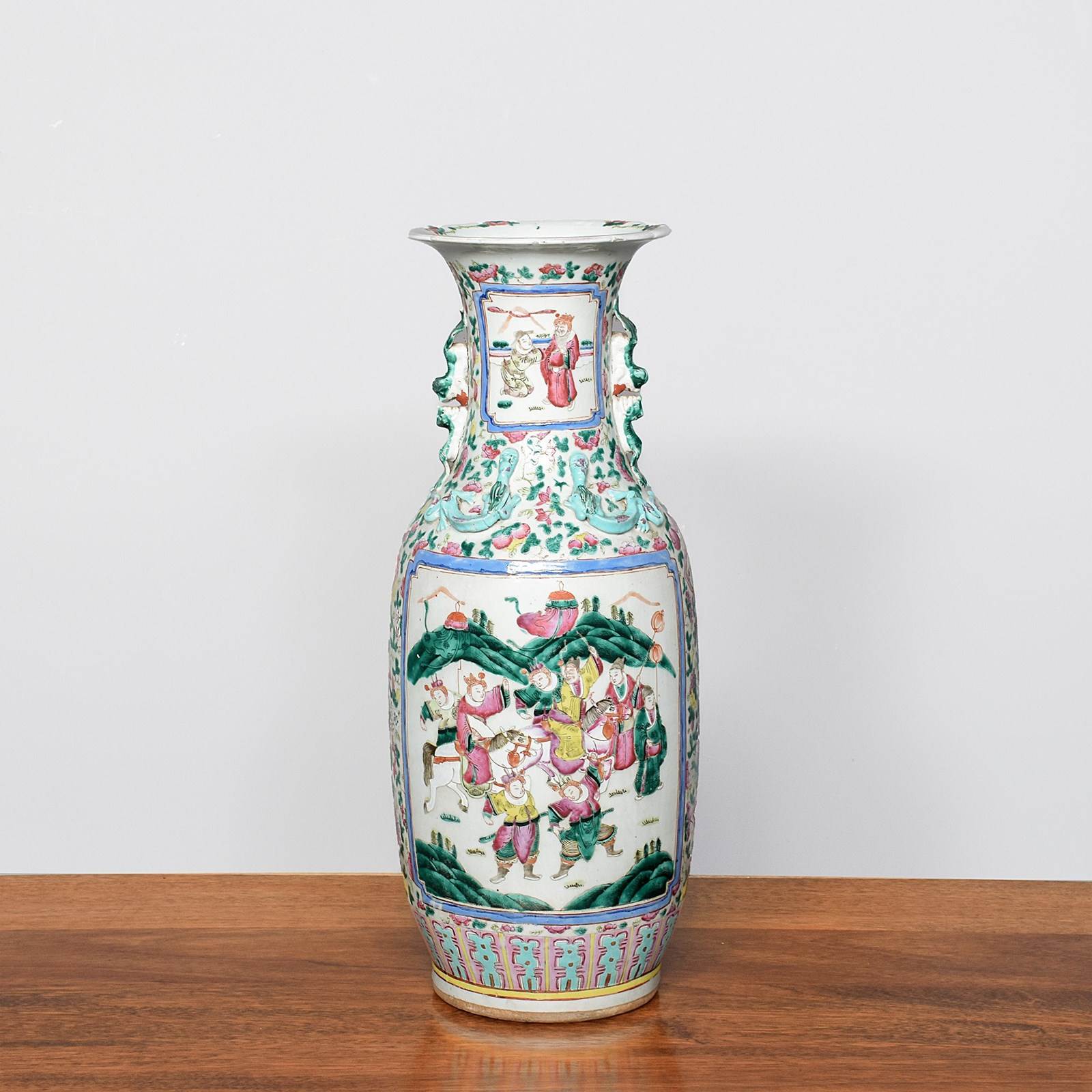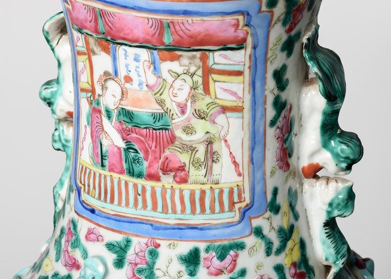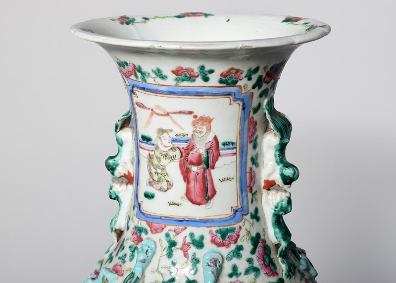 Circa 1870. Magnificent tall hand-painted Canton (Mandarin) vase in excellent condition. The tall vase with moulded dragon handles and applied lizards to the front has a large panel of groups of sitting figures with famille verte and famille rose colours. The sides with birds and chrysanthemum decoration, and the rear panel with a group of oriental horsemen and people celebrating. In overall excellent condition, some old minor chips to the rim.
