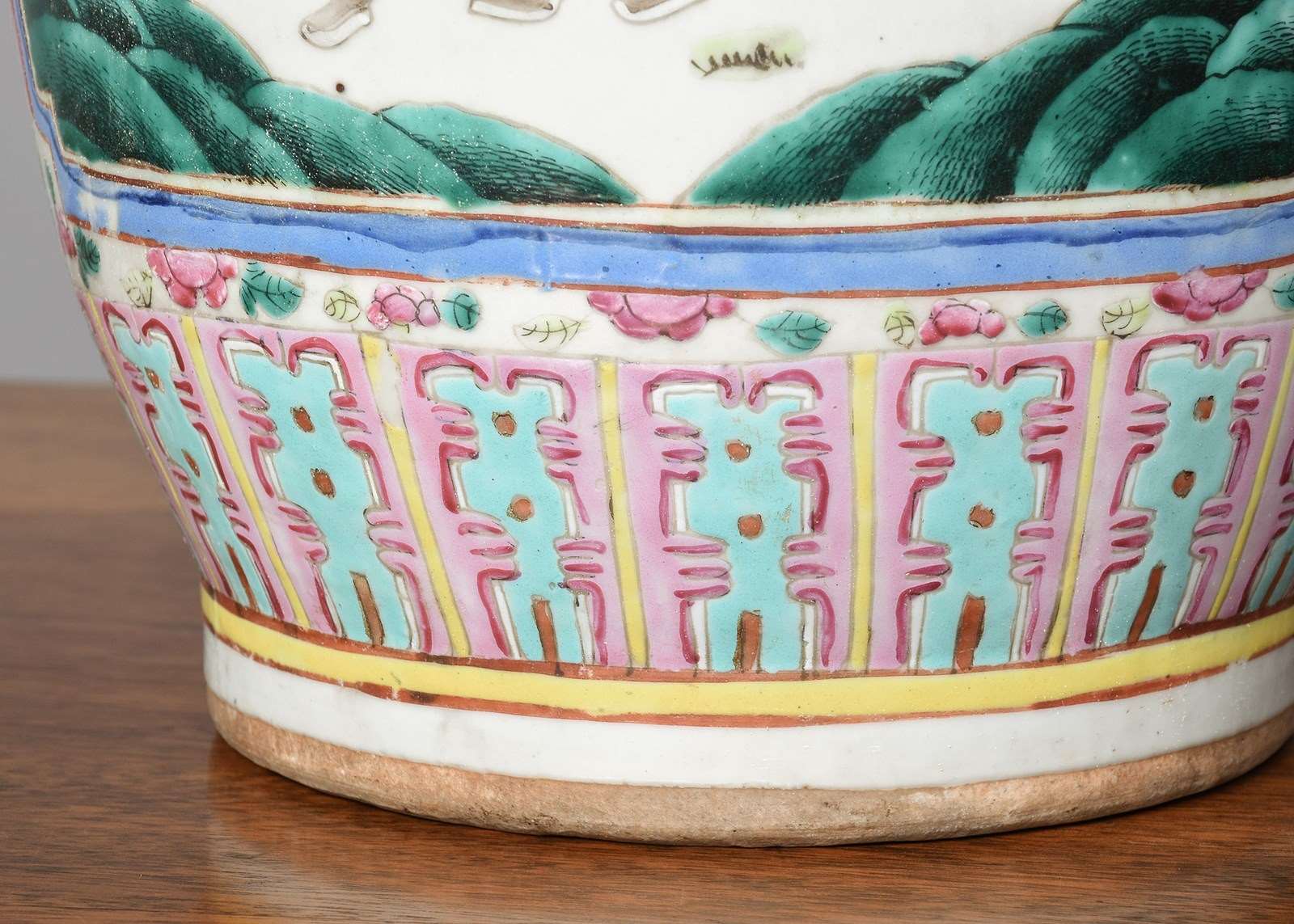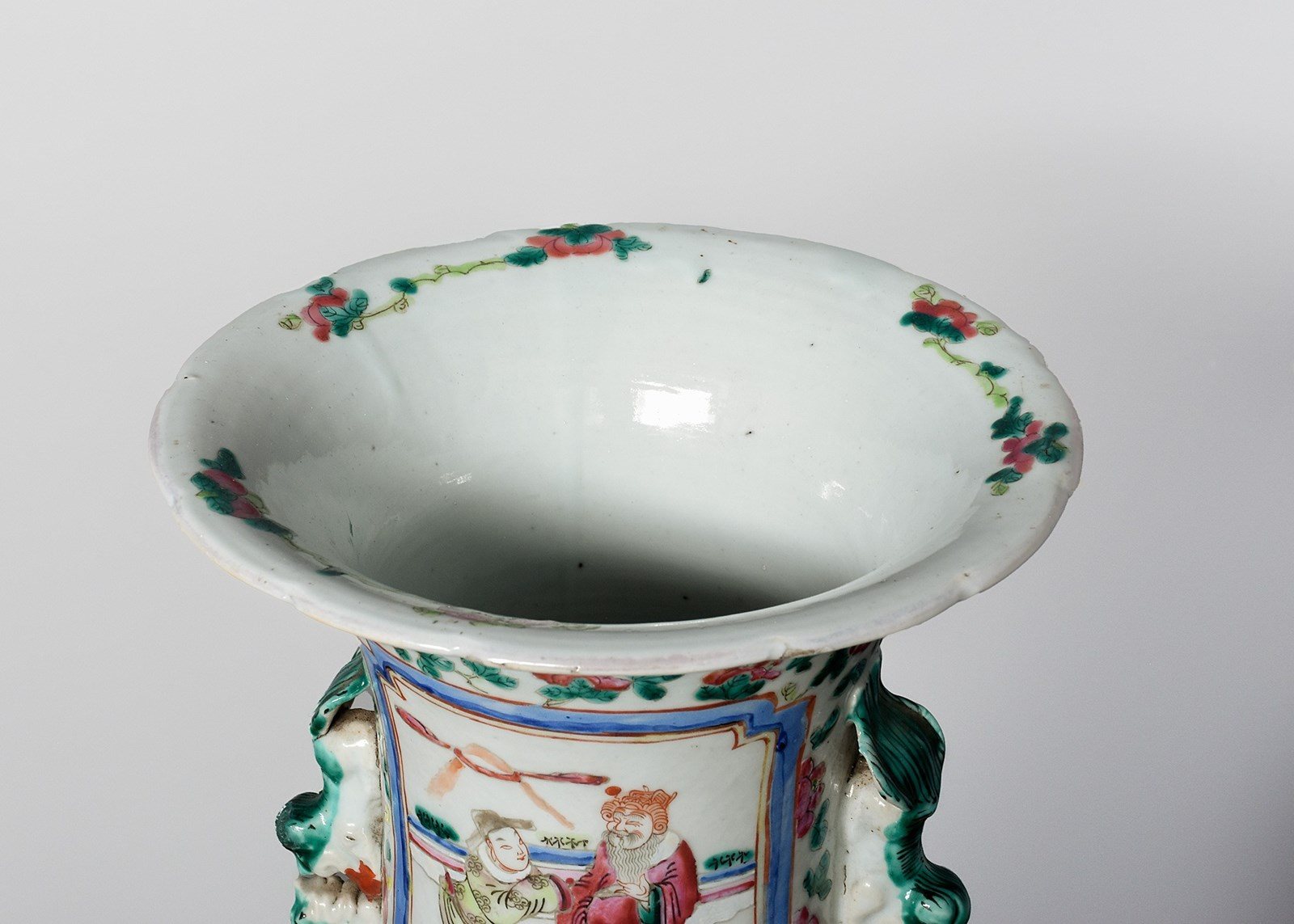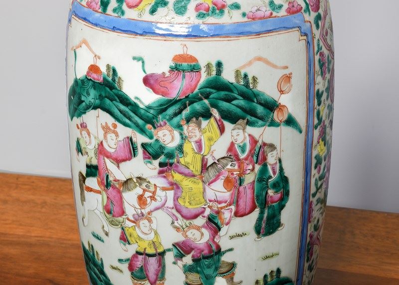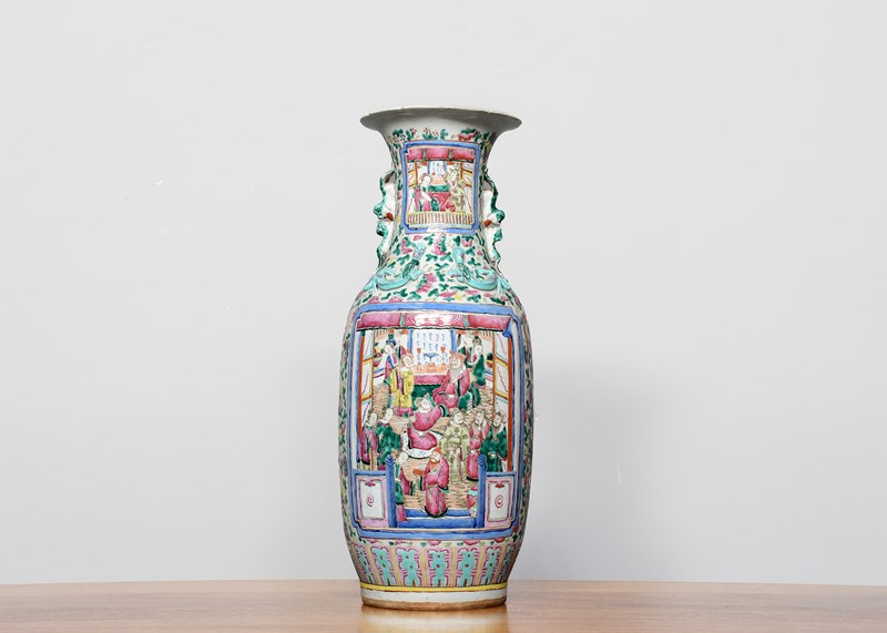 Circa 1870. Magnificent tall hand-painted Canton (Mandarin) vase in excellent condition. The tall vase with moulded dragon handles and applied lizards to the front has a large panel of groups of sitting figures with famille verte and famille rose colours. The sides with birds and chrysanthemum decoration, and the rear panel with a group of oriental horsemen and people celebrating. In overall excellent condition, some old minor chips to the rim.