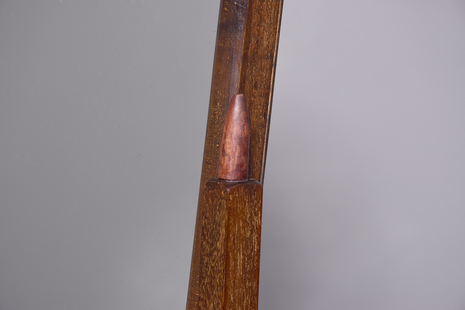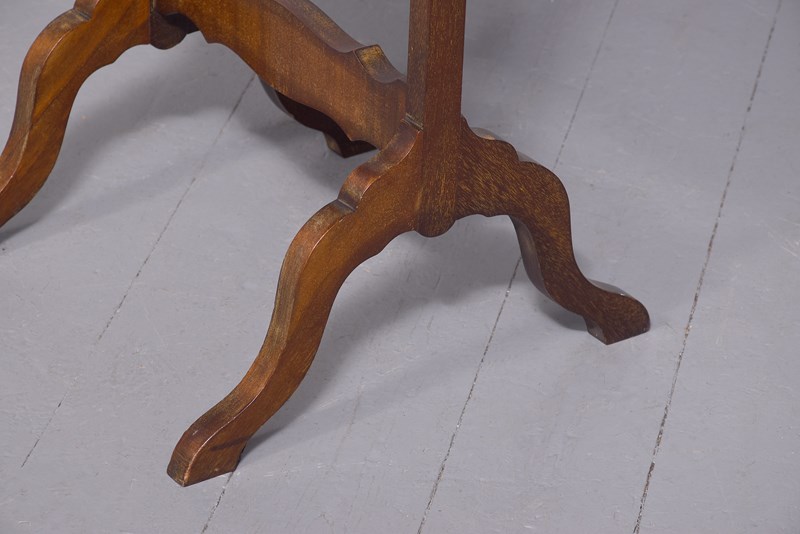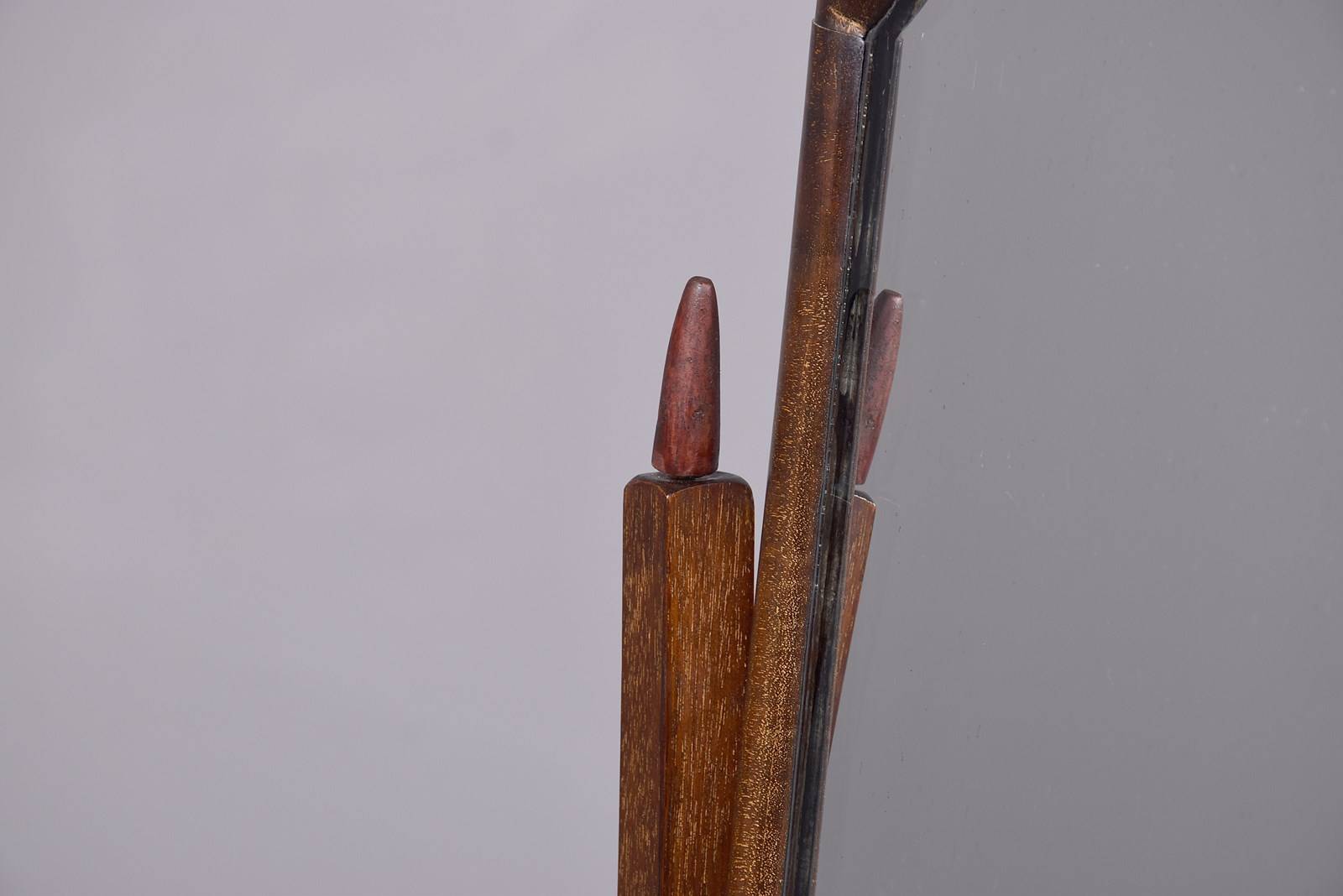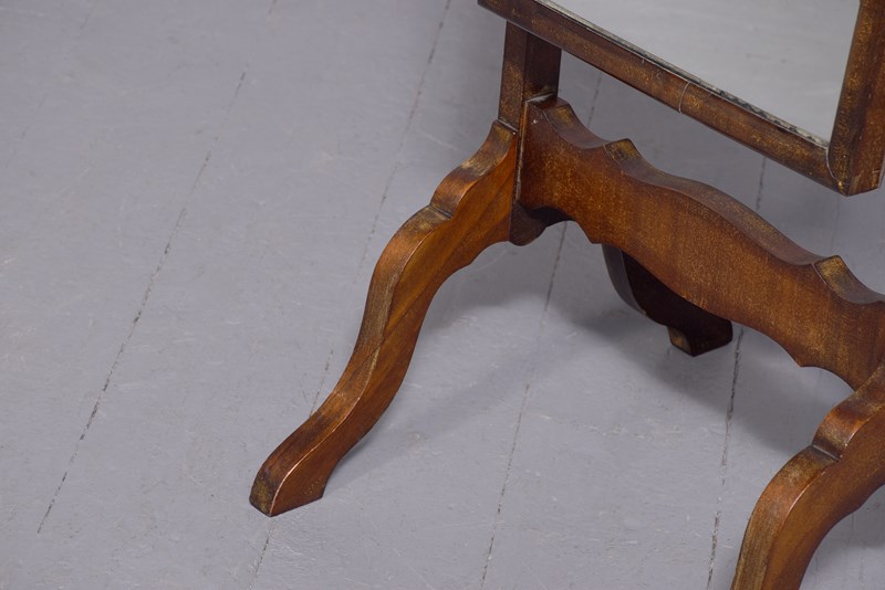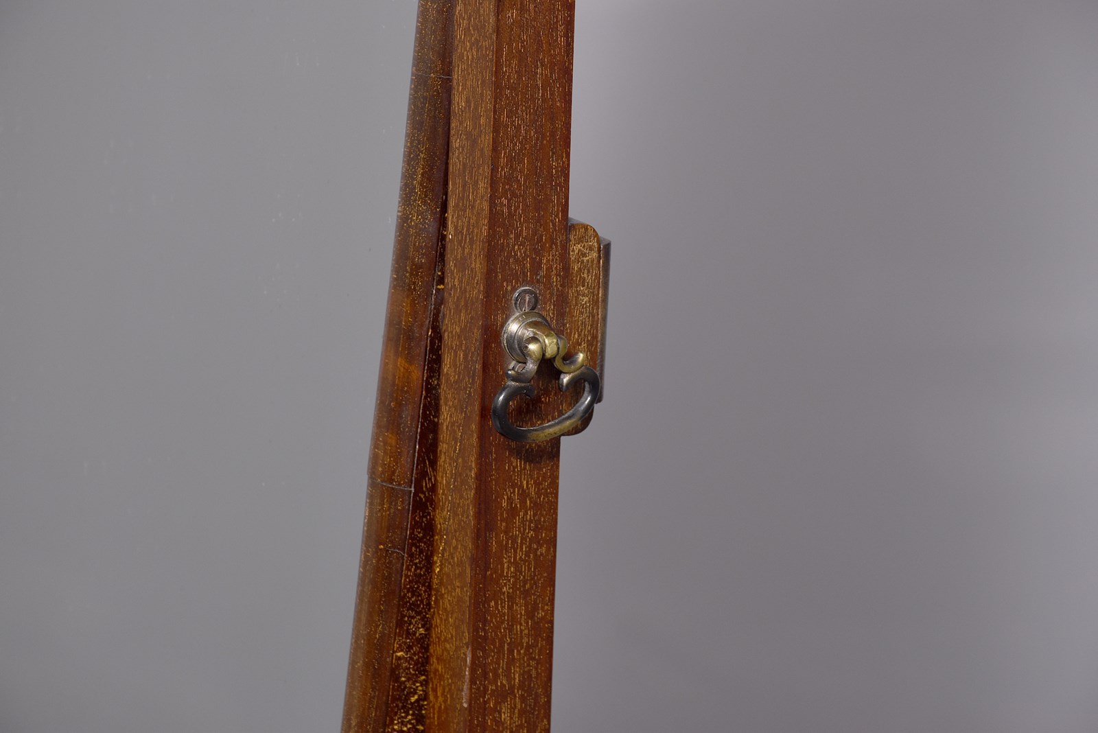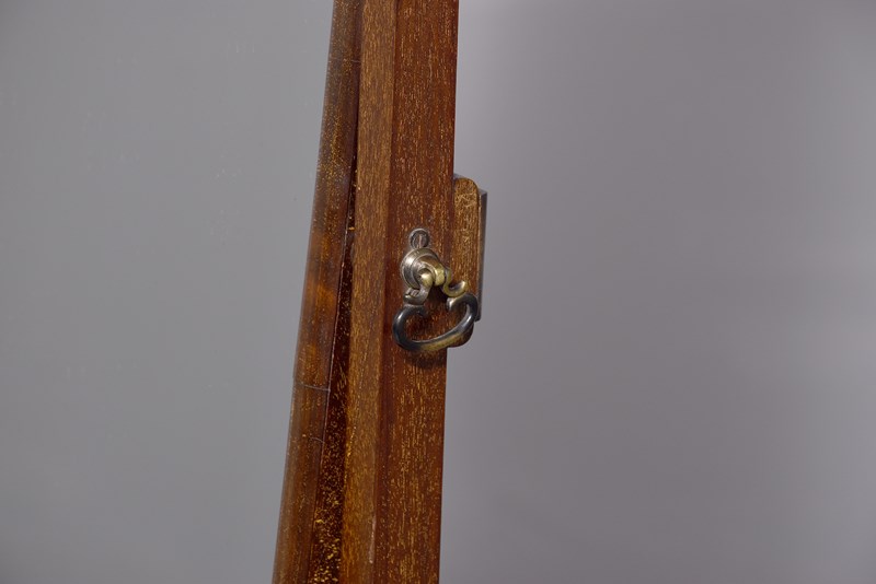 Circa 1930s. A Queen Anne style mahogany framed cheval mirror, the stylish shaped frame with rounded fore-edge, the mirror held in place by two tapering uprights surmounted by very elegant urn shaped finials, the frame held in position by a pair of cast brass axe-head drops, beneath the mirror is a shaped stretcher bracing the two uprights, all resting on four downward facing cabriole legs.