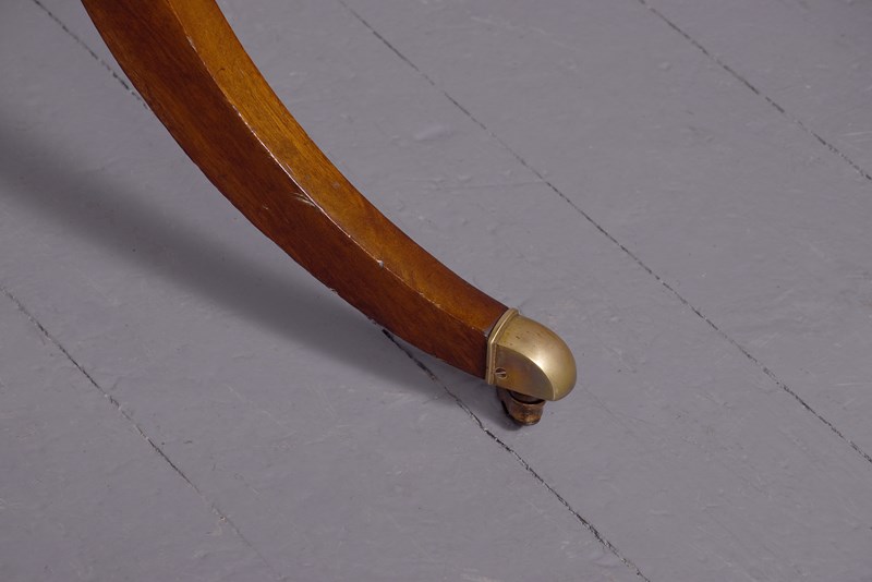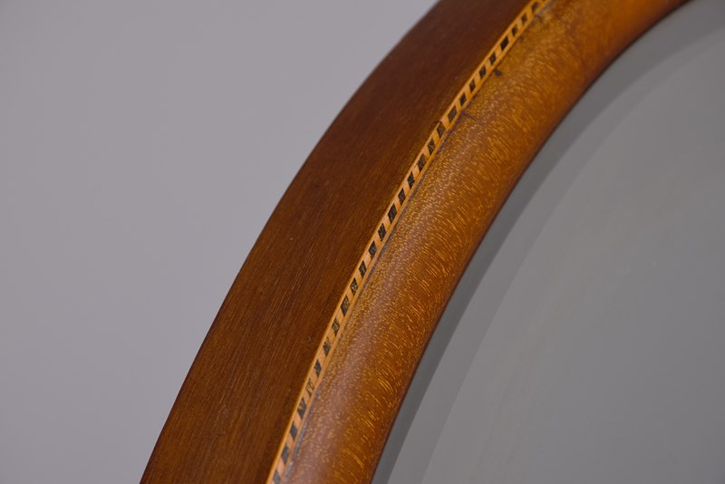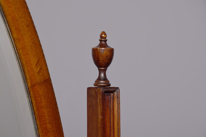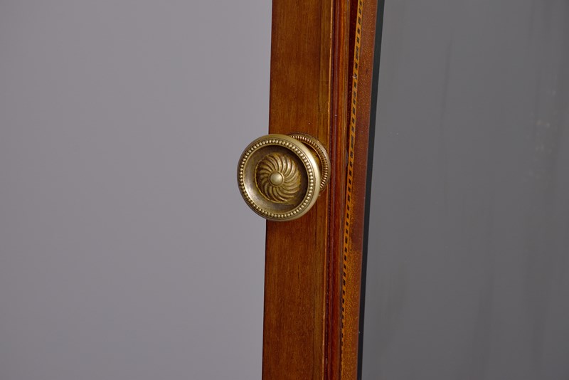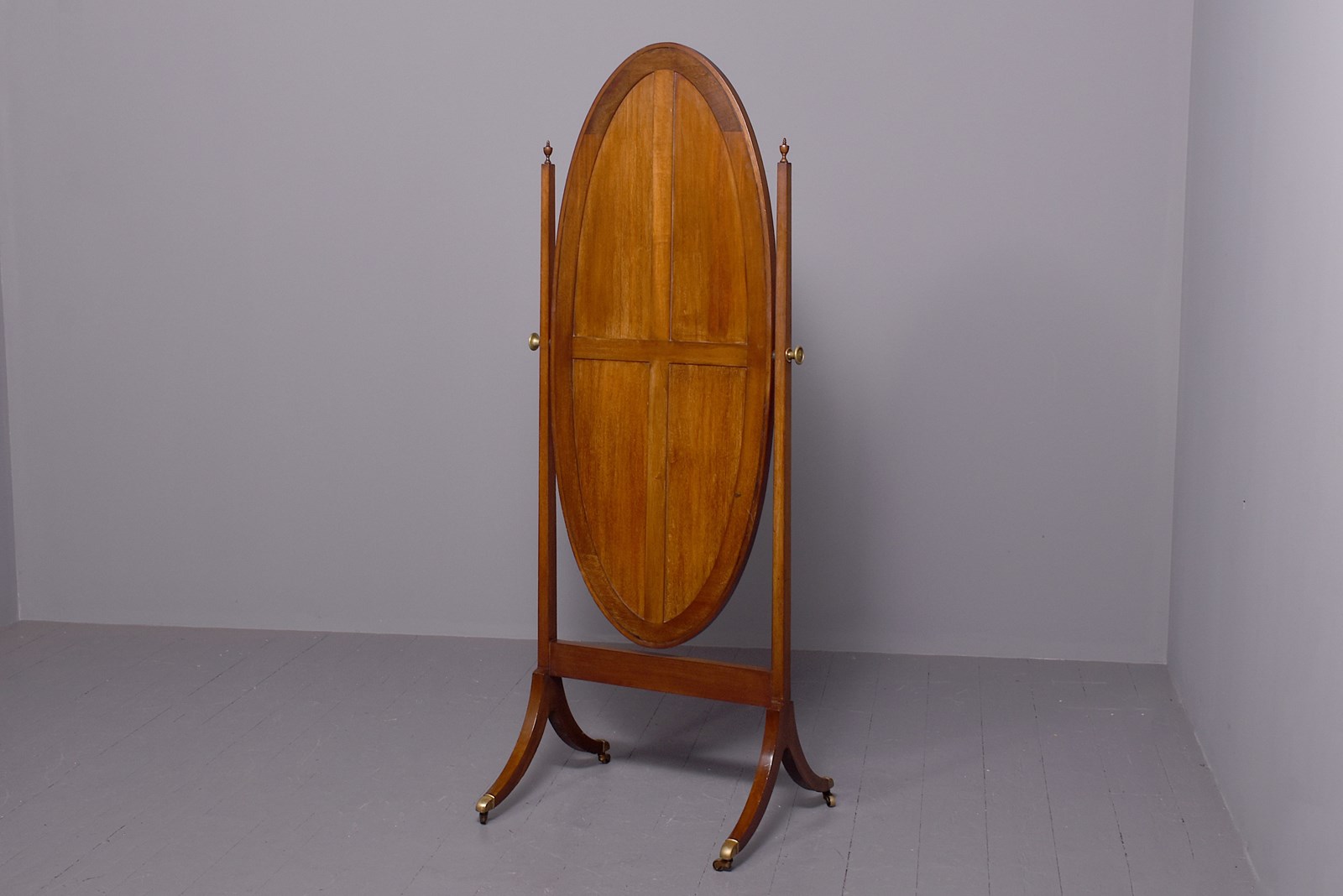 Circa 1900, a quality mahogany Sheraton-style inlaid cheval mirror, the large oval bevel edge mirror, containing the mahogany frame with rounded facing and checkered inlay on the fore-edge, supported on two moulded uprights, surmounted by an elegant finials with a pair of cast brass knobs to hold the mirror in place, beneath the mirror there's a polished stretcher bracing the uprights, all resting on four sabre legs finishing with a cast brass block with the original brass casters beneath, the back of the mirror is panelled and polished (sign of quality.)