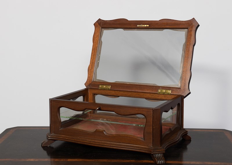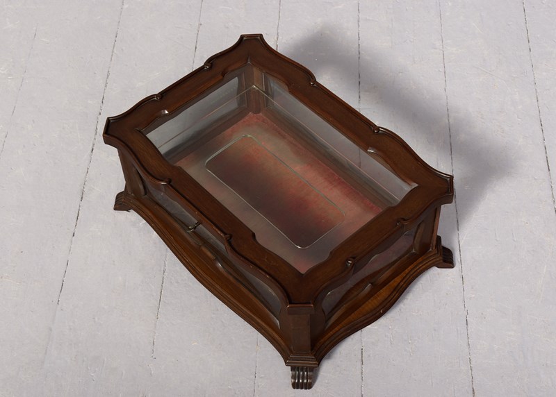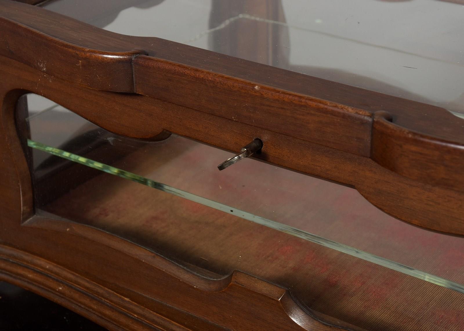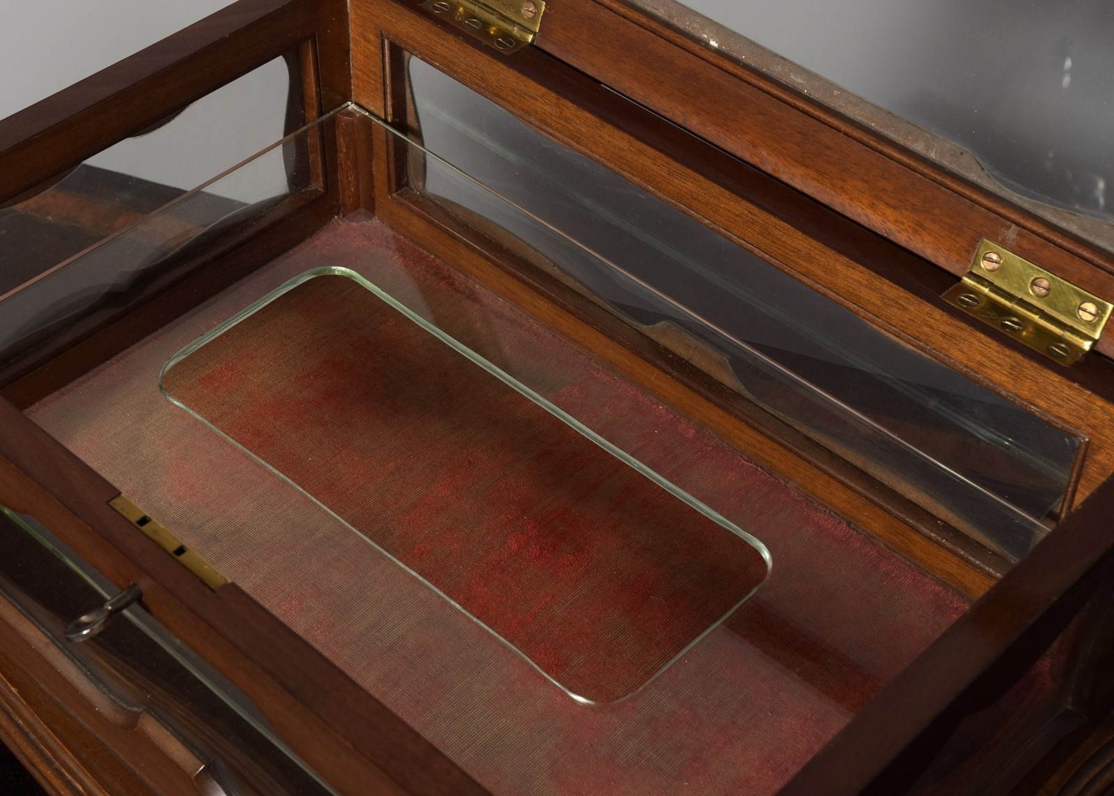 Circa 1900. A neat size mahogany and glazed tabletop bijouterie table, the top with shaped and raised gallery following the form of the top, with insert glass to the top and the sides, the interior with removable glass shelf with an aperture to the center and a velvet lined base, with the original working lock, glazed areas with shaped framing, resting on four ribbed scrolling feet.