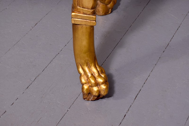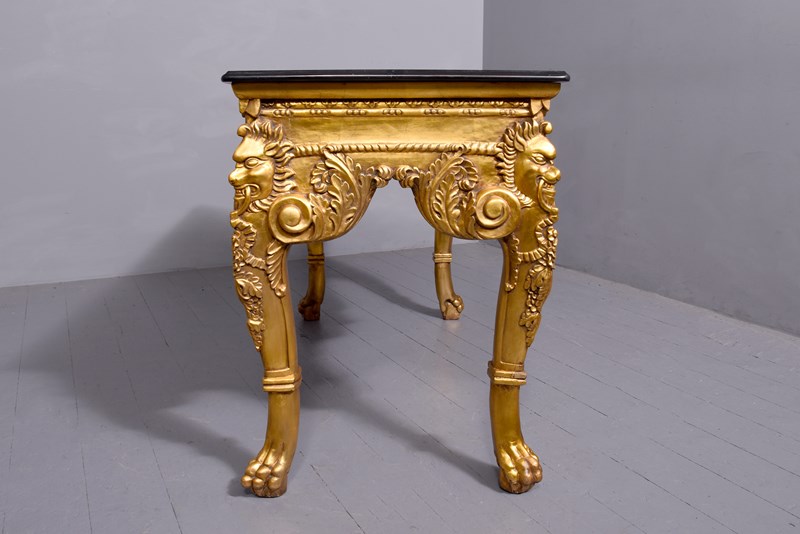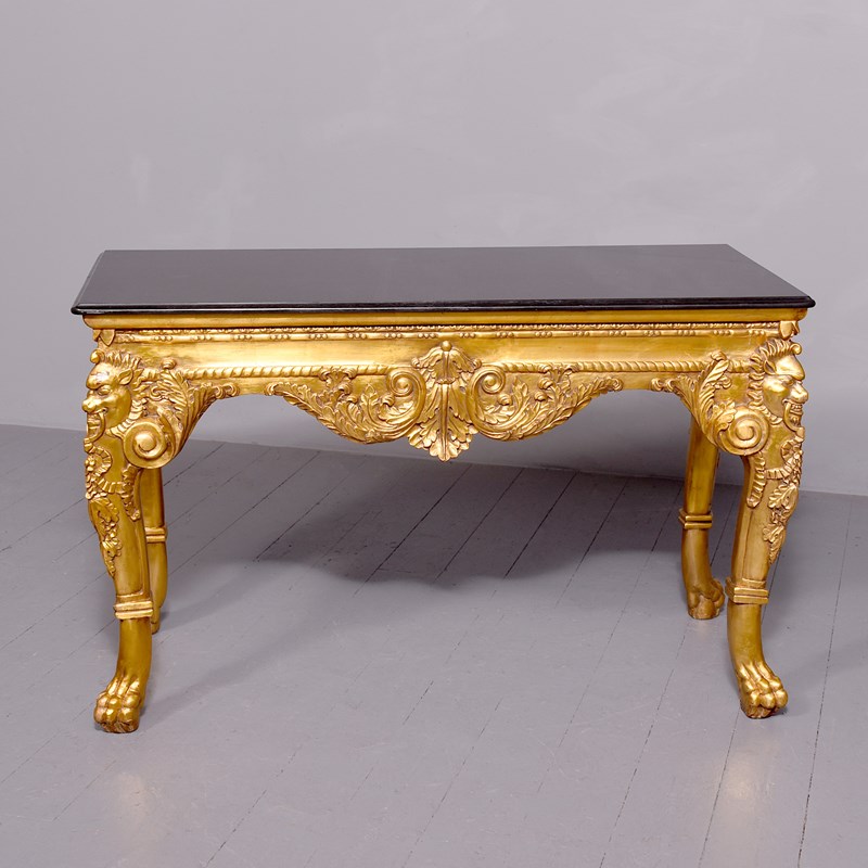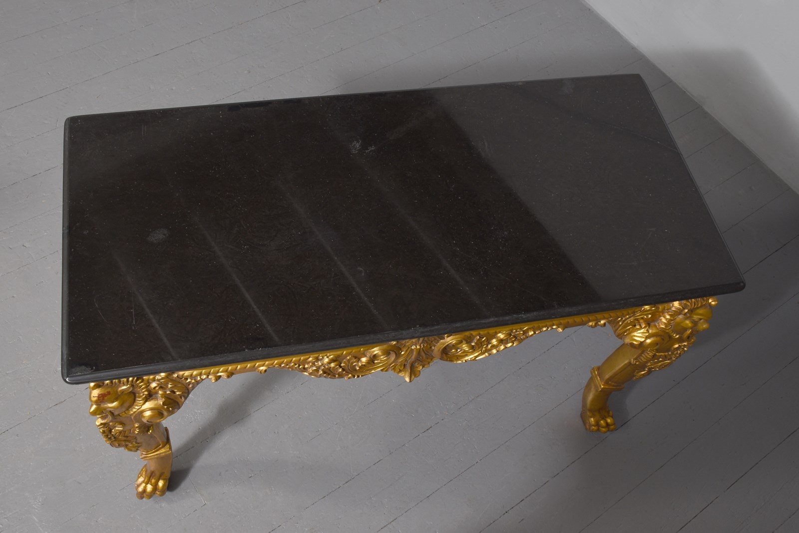 Circa 1970. The polished black marble top (repaired) with elegant fore-edge resting on the gilded base with carved frieze with foliate egg and dart decoration with profusely carved section, with foliate carving forming the shaped aprons, resting on four carved cabriole legs with mythical heads scrolling brackets with foliate carving on the knees and finishing on a well-carved ball and claw foot.