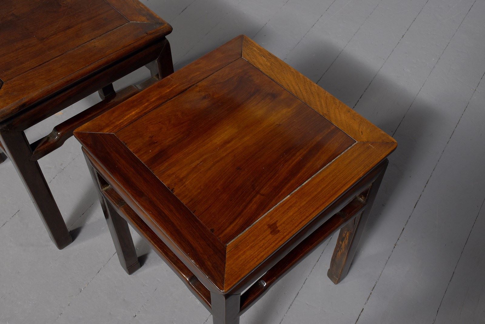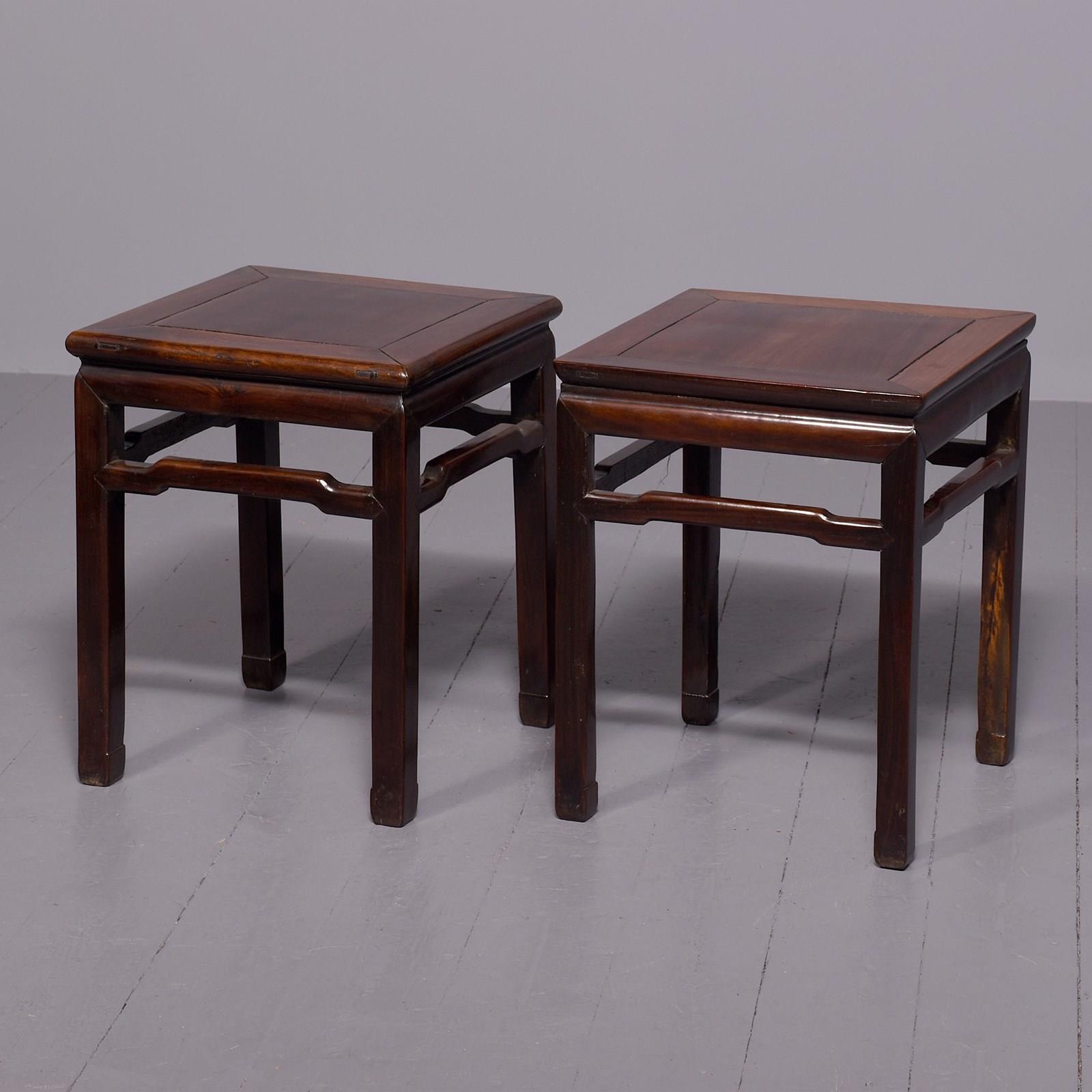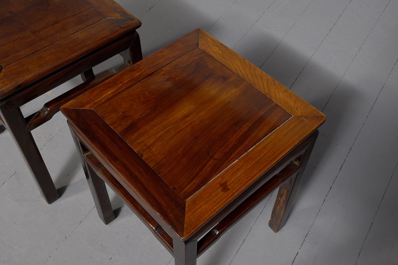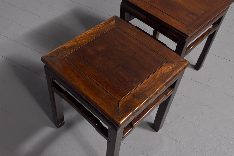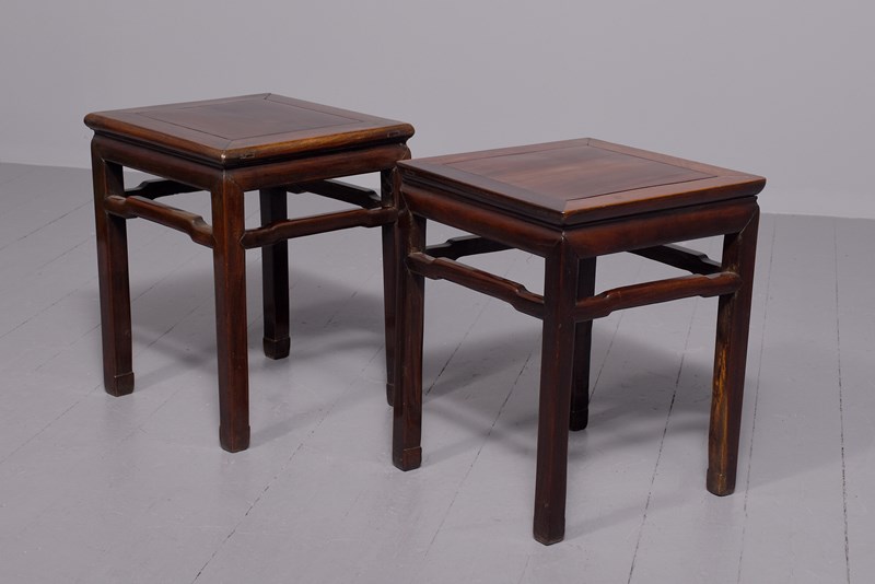 Circa 1880. Matched pair of Chinese Qing dynasty hongmu stands, the square tops with inset floating panels supported on square-section legs joined by humpbacked stretchers. In excellent condition with lovely rich colour and patina.