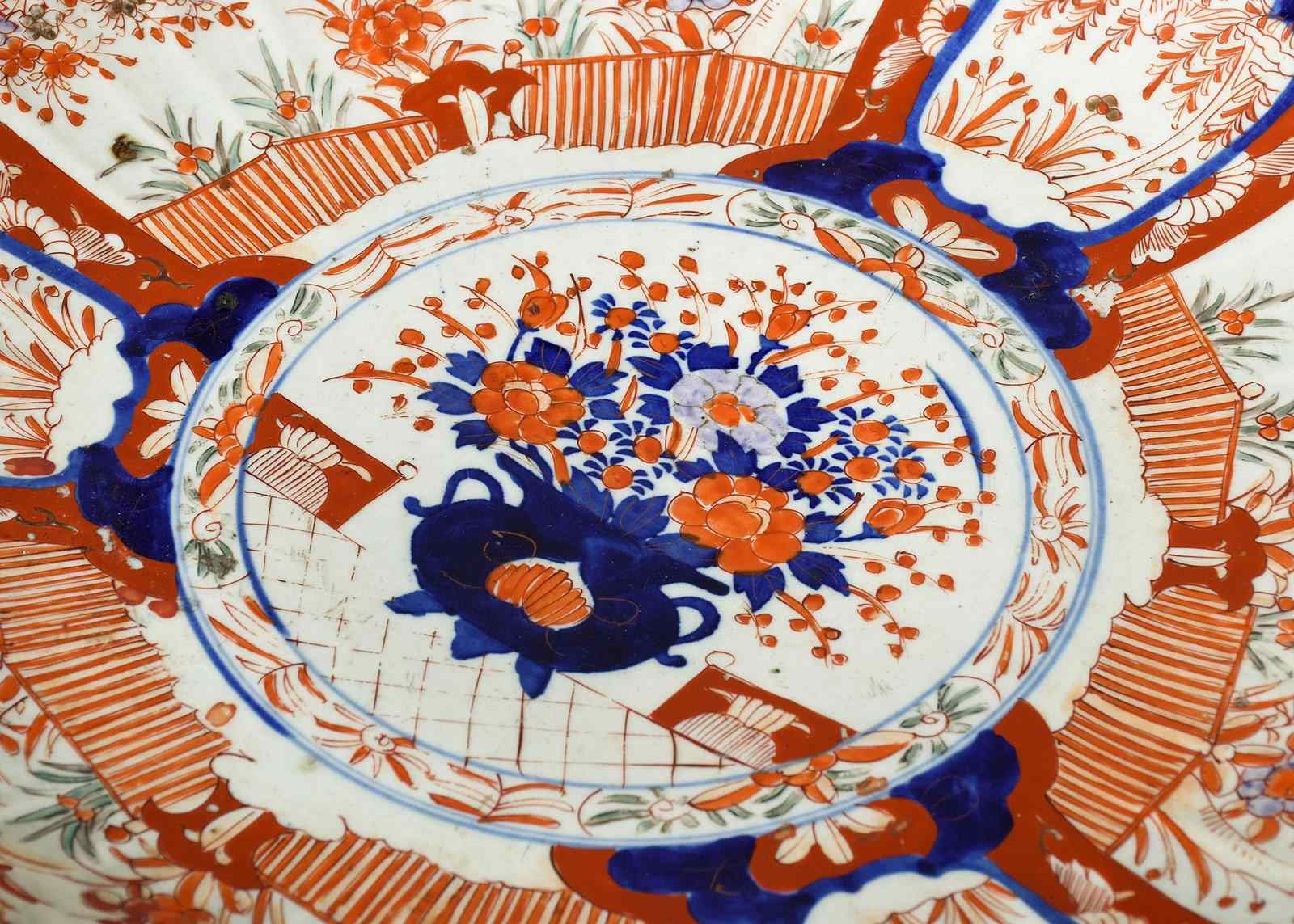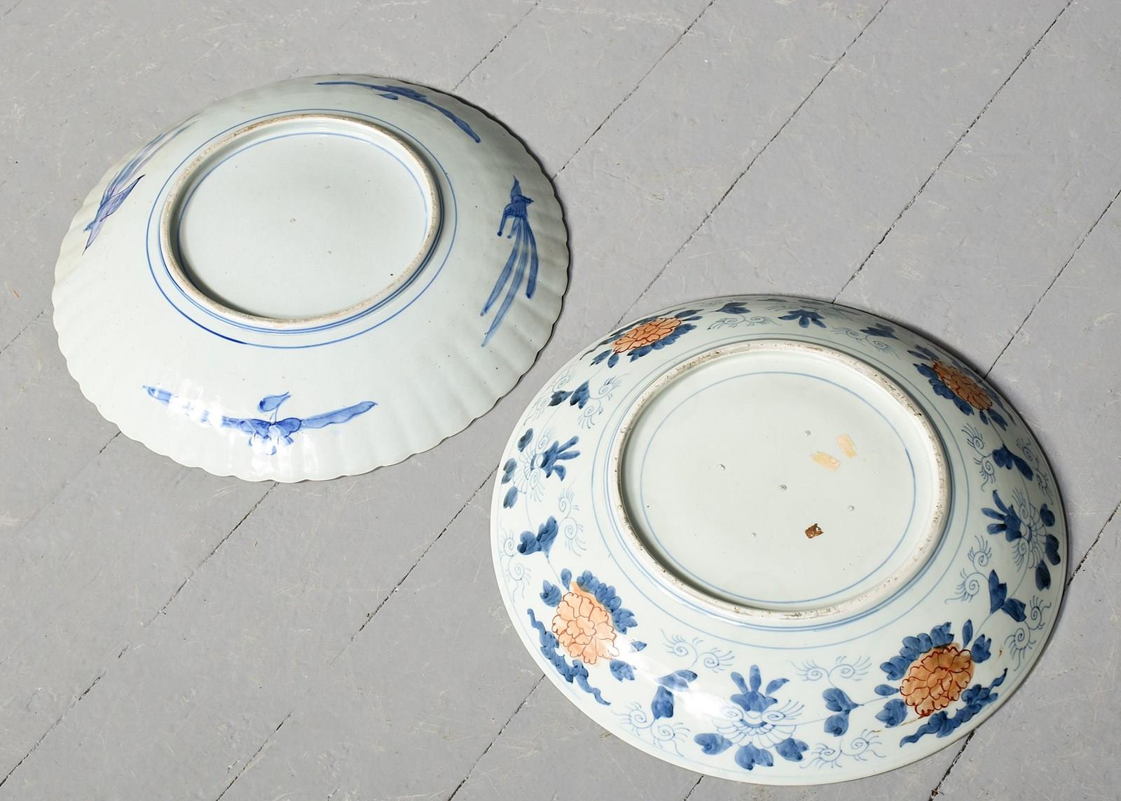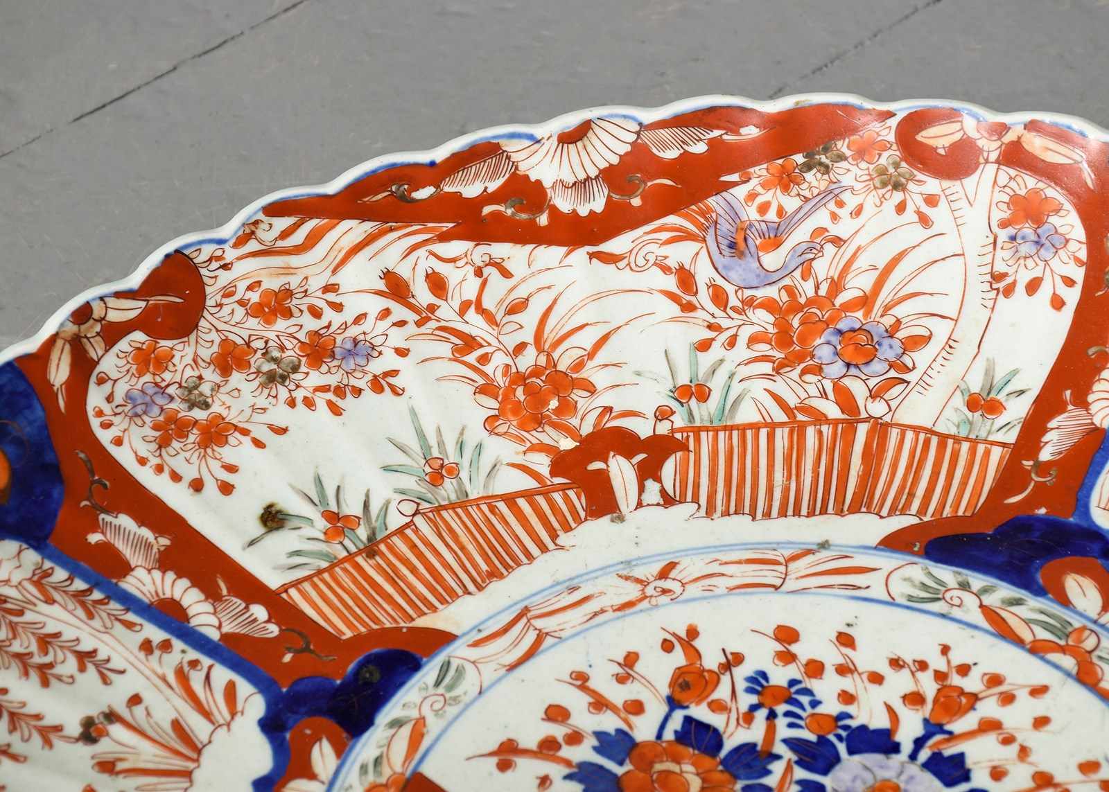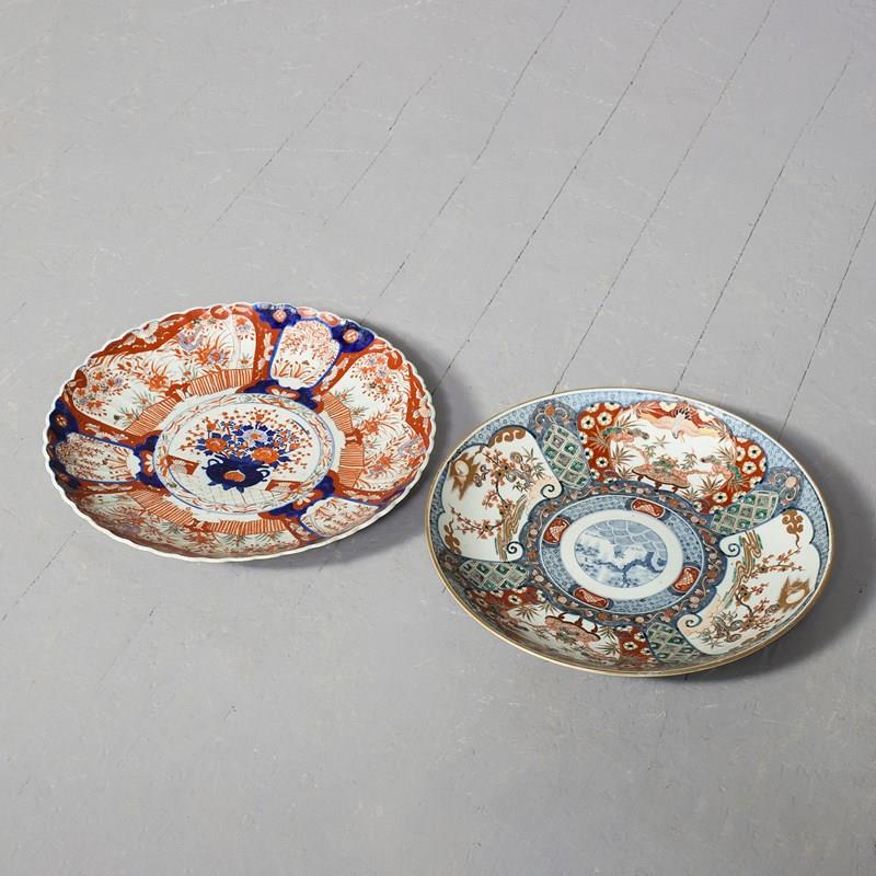 Circa 1890. Two similar Meiji period Japanese Imari platters, one with a wavy edge and ribbing to the body, painted with the classic Imari colours of cobalt blue and red with small patterns throughout, the other with simple rim with painted panels including birds, flowers, and trees in mellow colours.