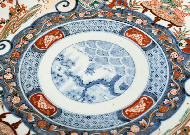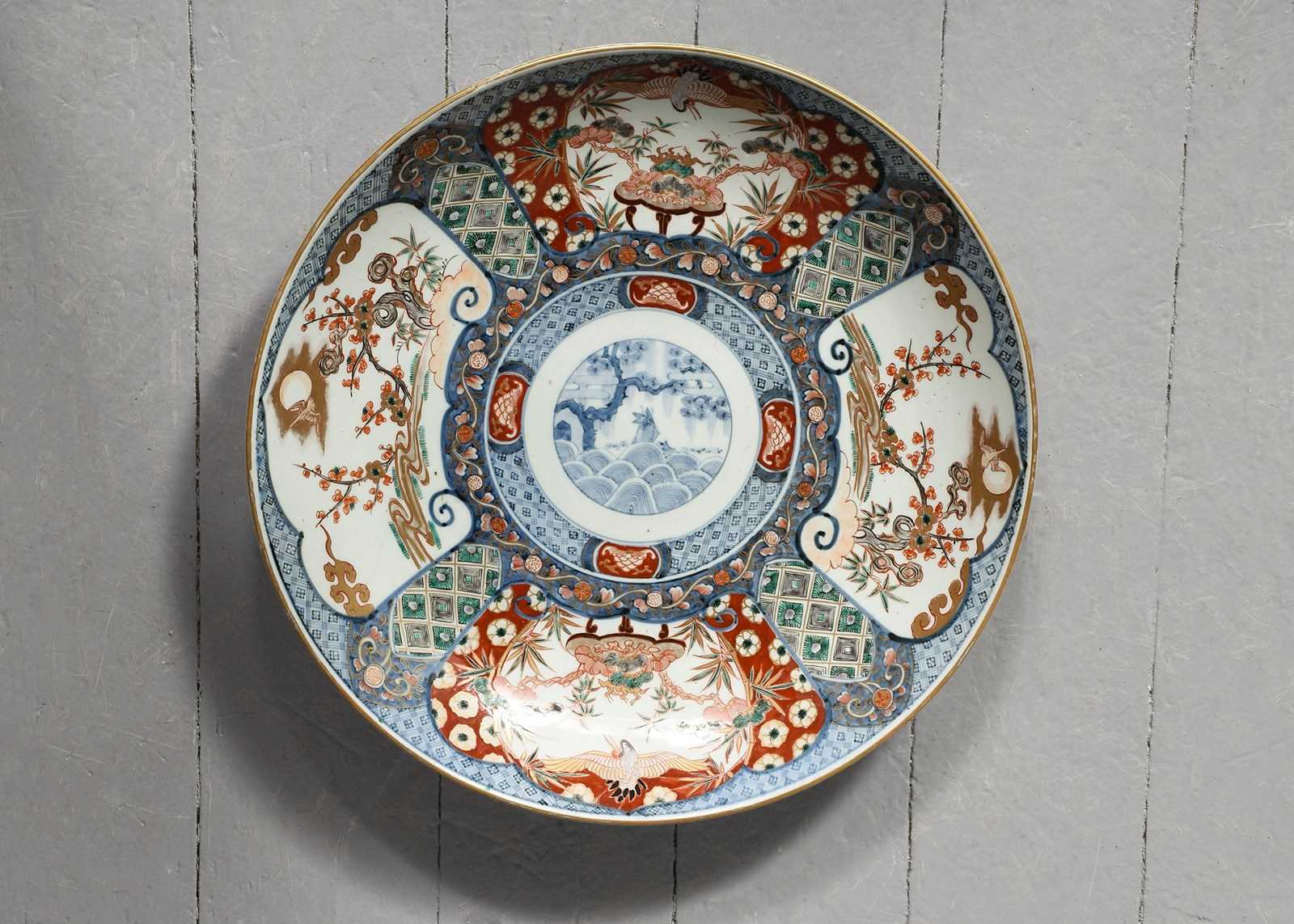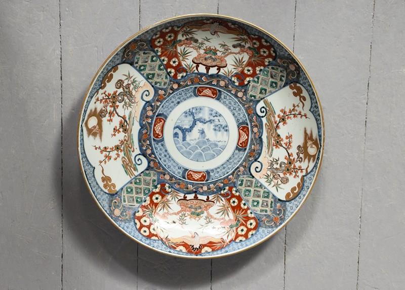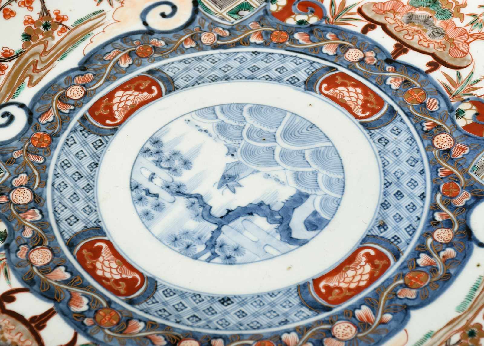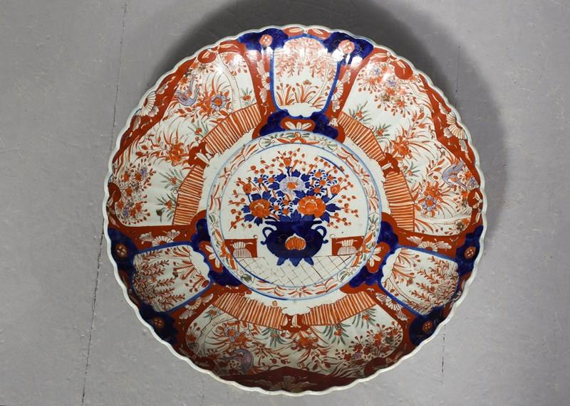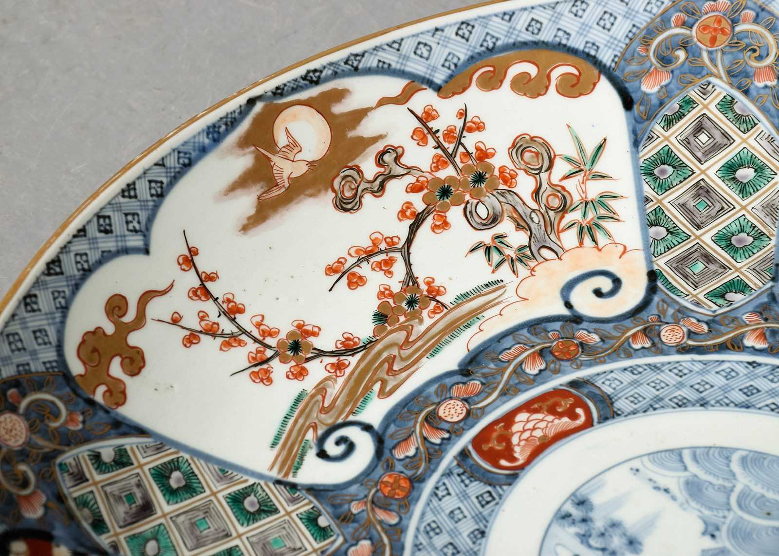 Circa 1890. Two similar Meiji period Japanese Imari platters, one with a wavy edge and ribbing to the body, painted with the classic Imari colours of cobalt blue and red with small patterns throughout, the other with simple rim with painted panels including birds, flowers, and trees in mellow colours.