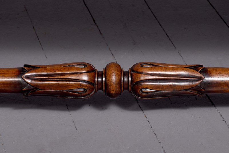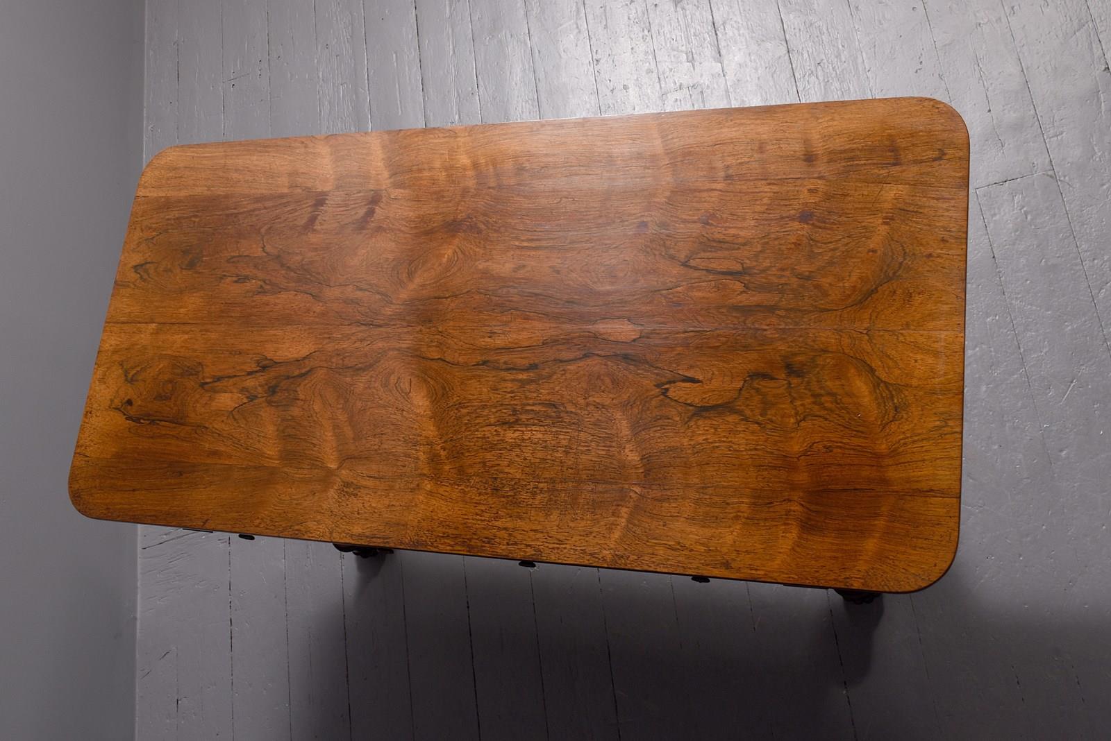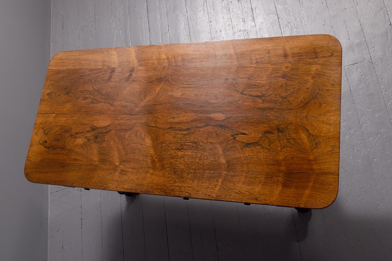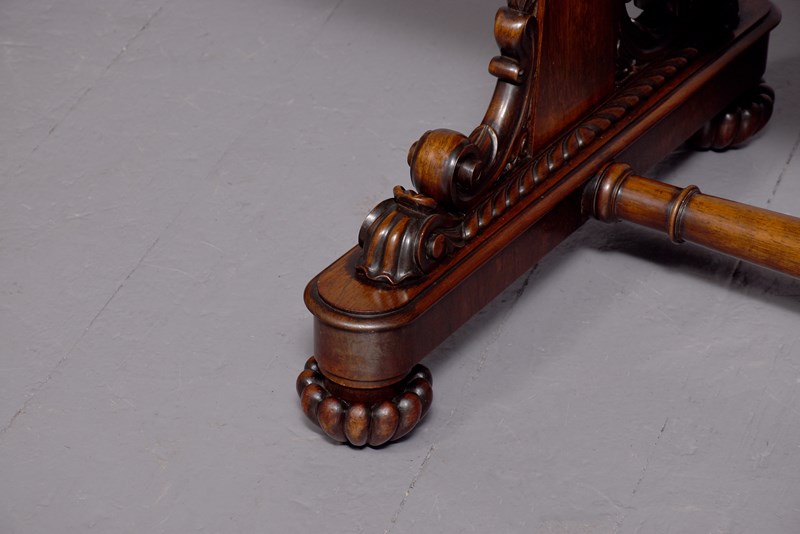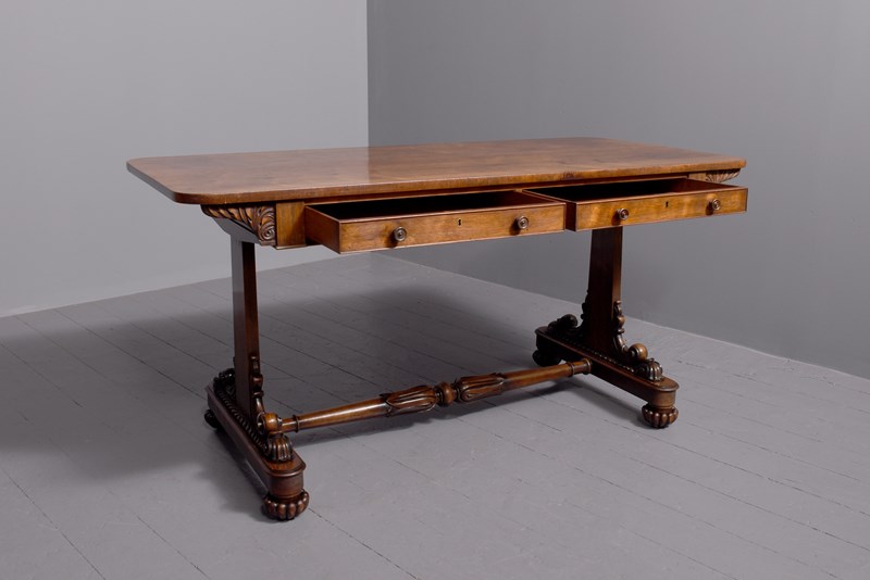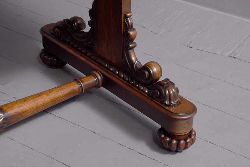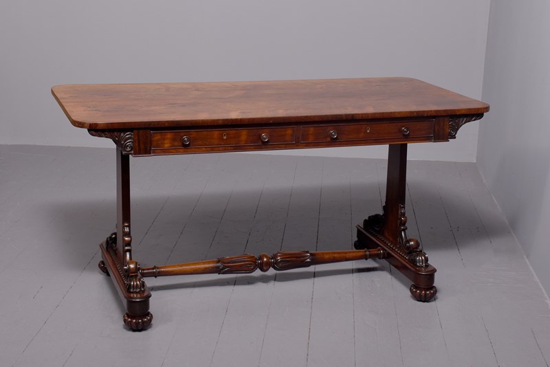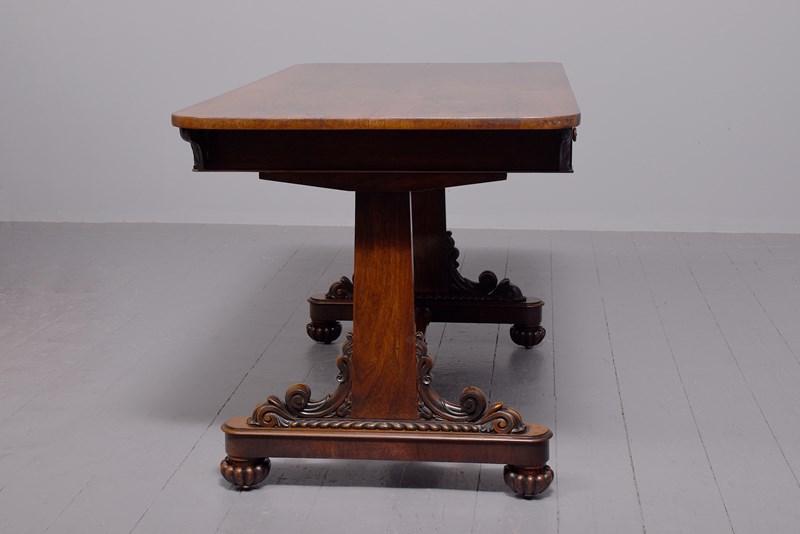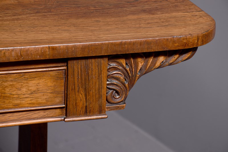 Circa 1815. A rosewood freestanding library table probably by ‘James Mein of Kelso’, the rectangular top with rounded corners in book matched rosewood, the frieze with a pair of drawers on one side and faux drawers on the other side, the overlapping top with foliate carved brackets, supported on a pair of tapering trestles with foliate carving, with buttresses and classic dragooning, all resting on a platform base with rounded corners, simple moulding with a polished frieze sitting on four fluted feet with original concealed castors.