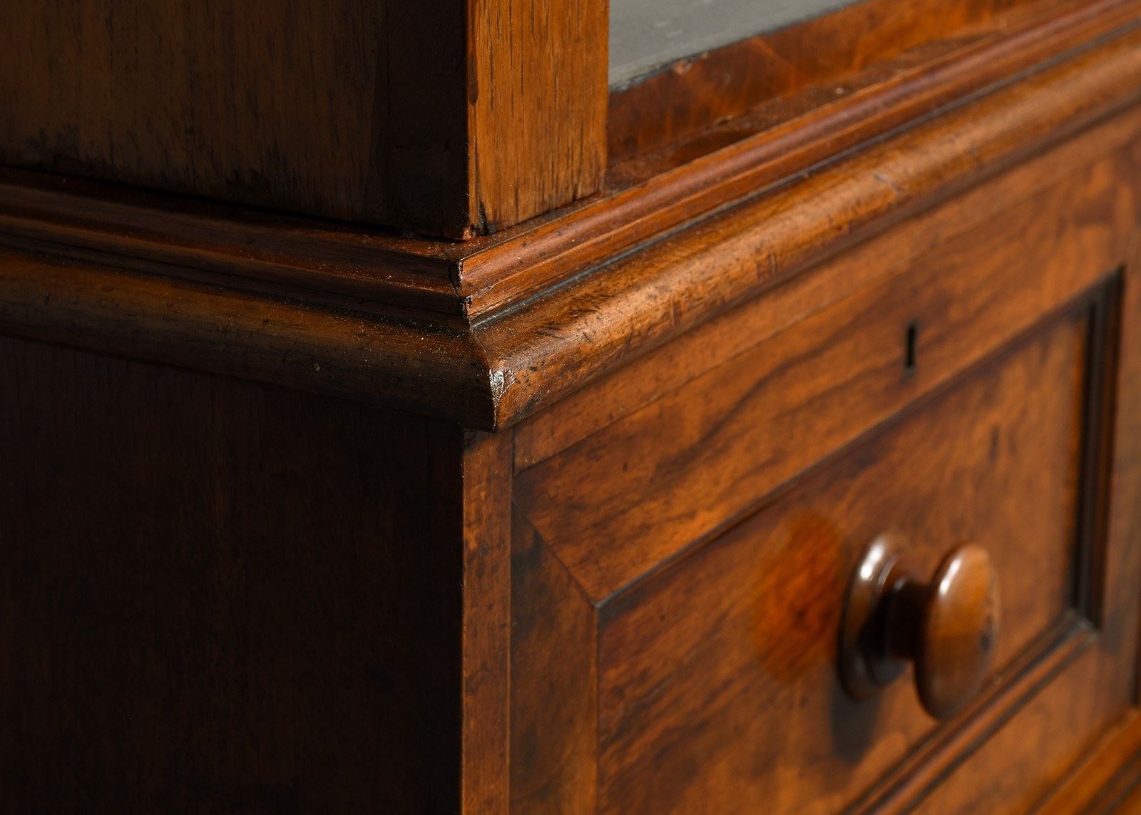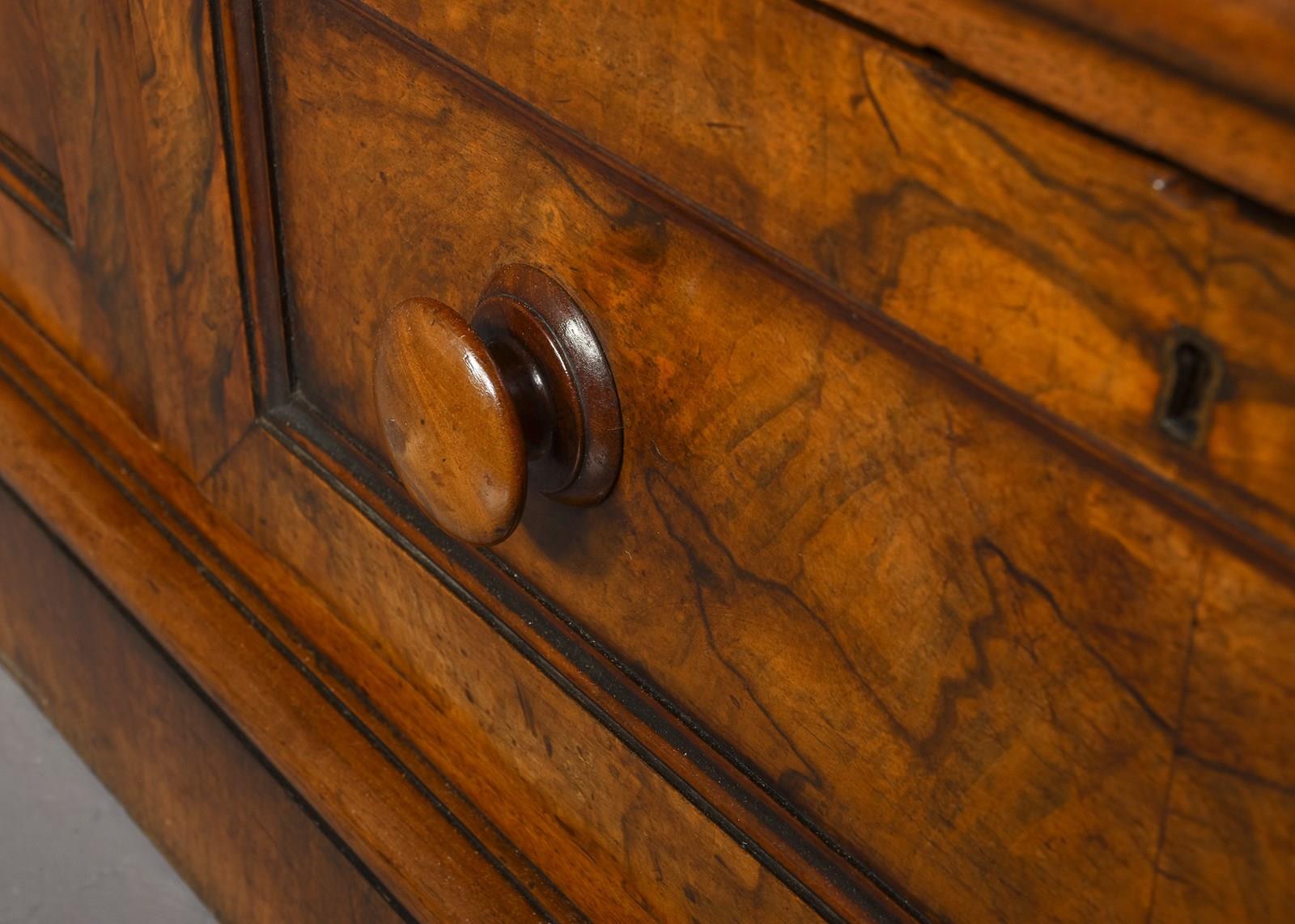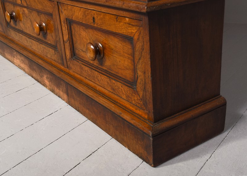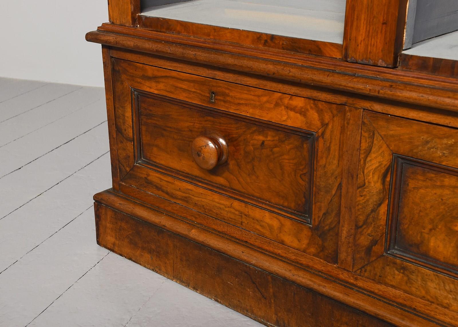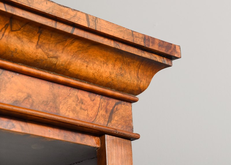 Circa 1860 with adaptations. Mid Victorian figured-walnut tall, three-section open bookcase. Surmounted by a classical moulded (“cushion”) Victorian cornice above a beaded frieze in figured walnut. The three bookcase sections, each has five adjustable shelves with walnut facings and are flanked and separated by figured walnut columns. The base with a moulded fore-edge, with three drawers with panelled walnut fronts and original turned wooden knobs. All sitting on a moulded and enclosed plinth base. In excellent condition with a mellow golden colour.