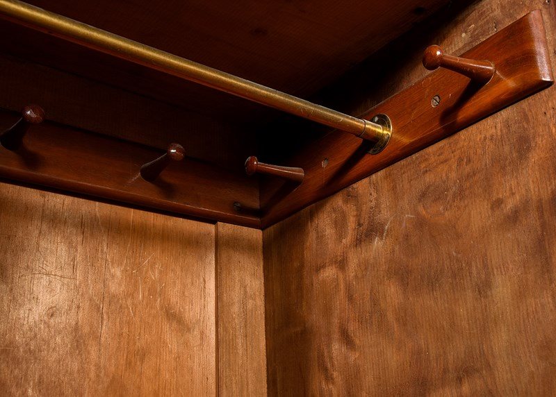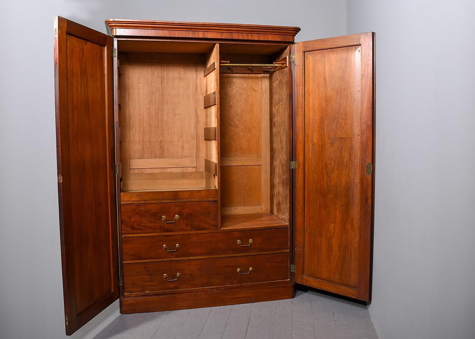 Circa 1860. A mid Victorian two door mahogany wardrobe, the classic cornice with rounded corners, the front with two full length panel doors with elegant beading and a proud brass escutcheon, inside on the right there is space for hanging and on the left-hand side a mixture of hanging, slides and drawers, the wardrobe rests on an enclosed mahogany plinth following the form of the cornice, the wardrobe breaks into three sections – the cornice, the base and the body.