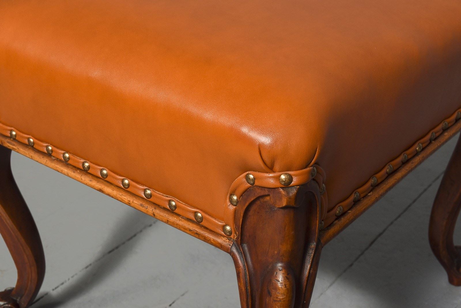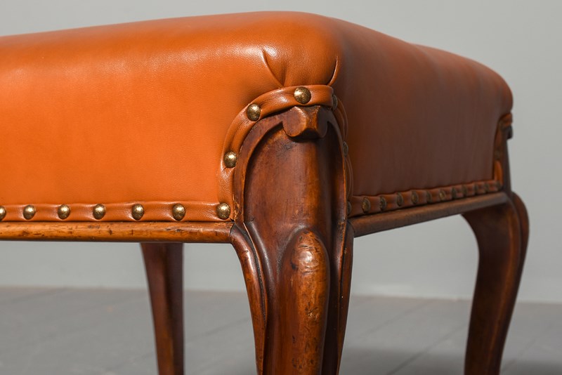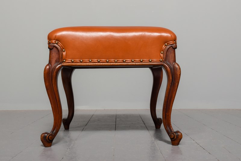 Circa 1860. Mid-Victorian mahogany leather upholstered stool on cabriole legs. The stool with a newly upholstered top and sides in finest quality tan leather with brass studding and supported on fluted cabriole legs with scrolled knees and toes. Lovely colour and patina.