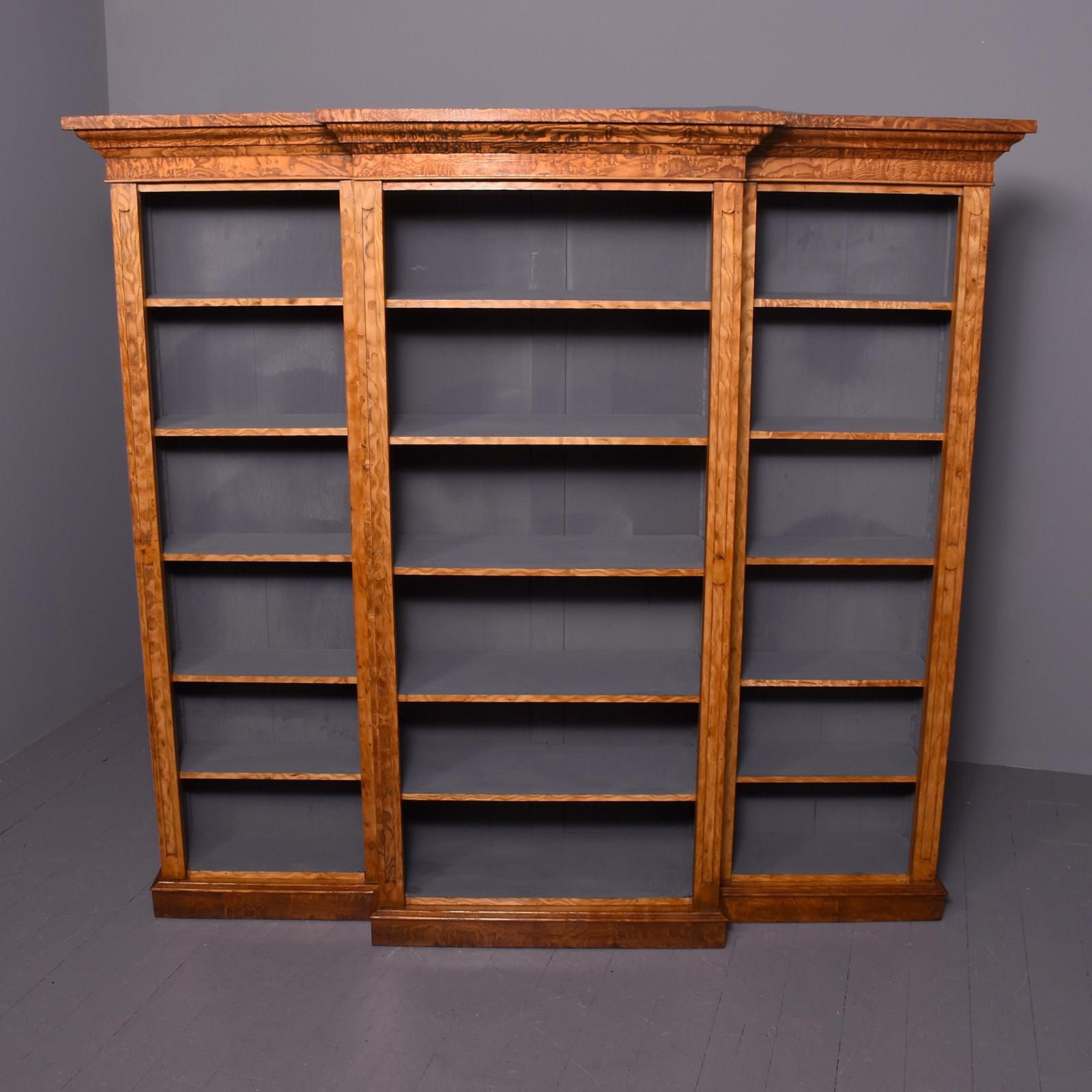 Mid Victorian Tall, Figured Golden Elm Breakfront, 3-Section Open Bookcase