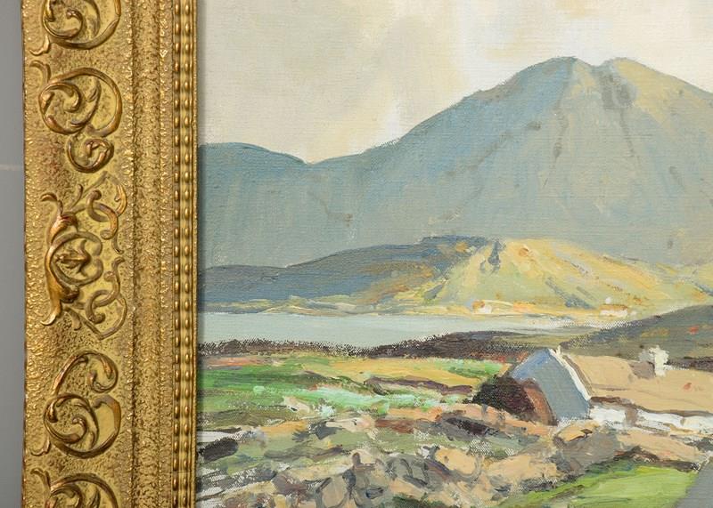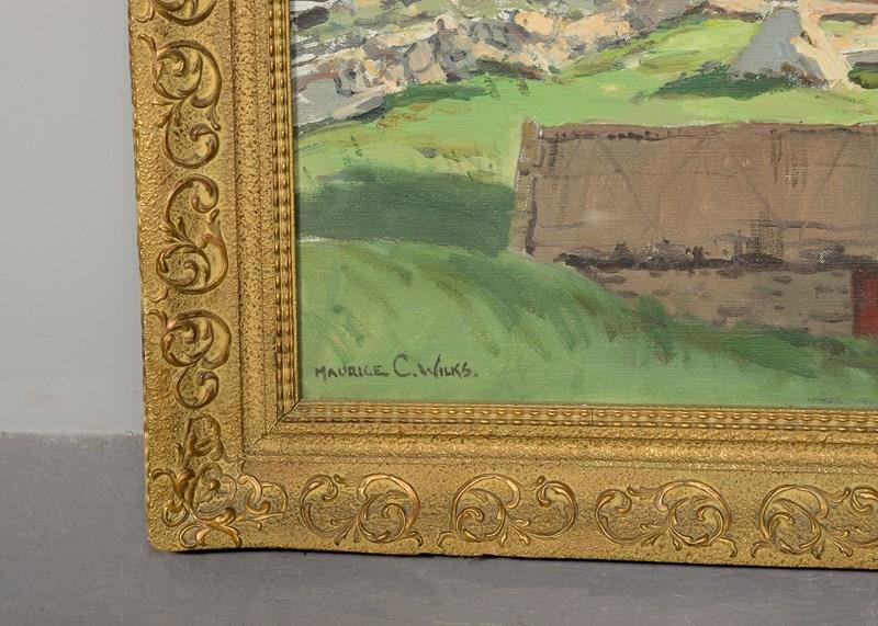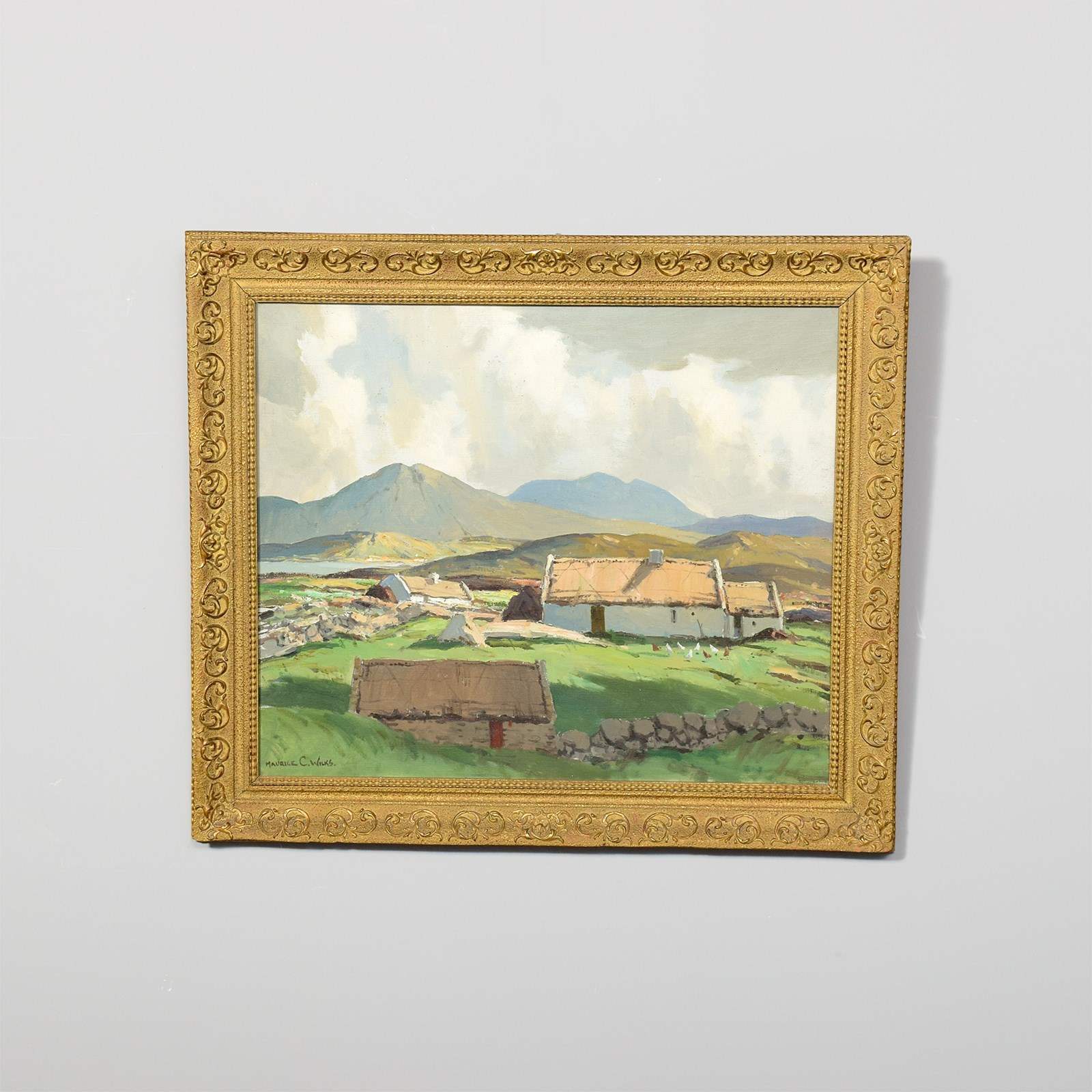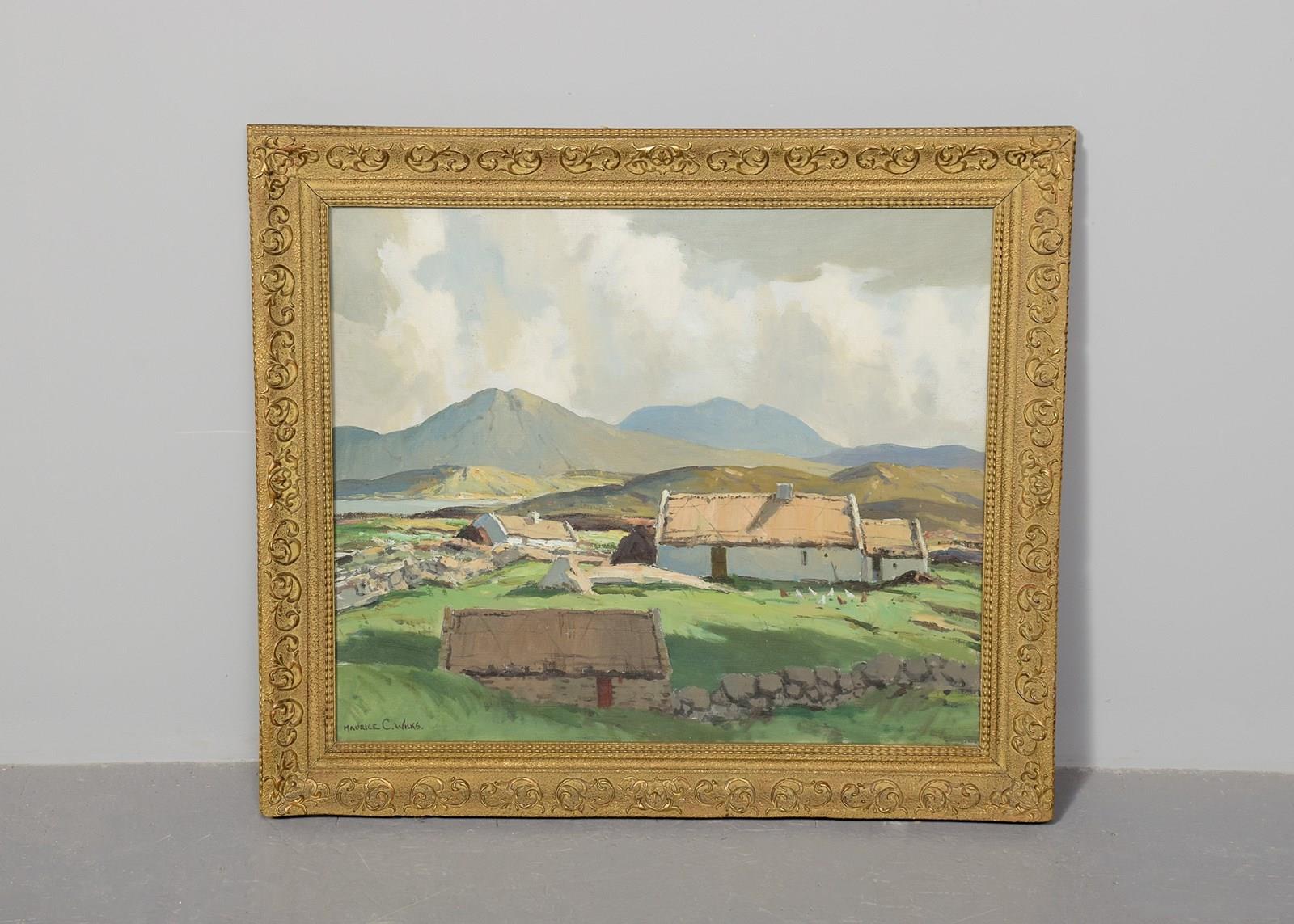 Circa 1960s. An oil on canvas by Morris Canning Wilks, with the inscription on the back 'amongst the Connemara hills, County Galway by Morris Canning Wilks', the painting with cottages in the fore-ground with fields and rocky walls, with the Connemara hills in the background, in a carved and gilded glazed frame, in excellent condition. Maurice Canning Wilks (1910-1984) was an Irish landscape painter.