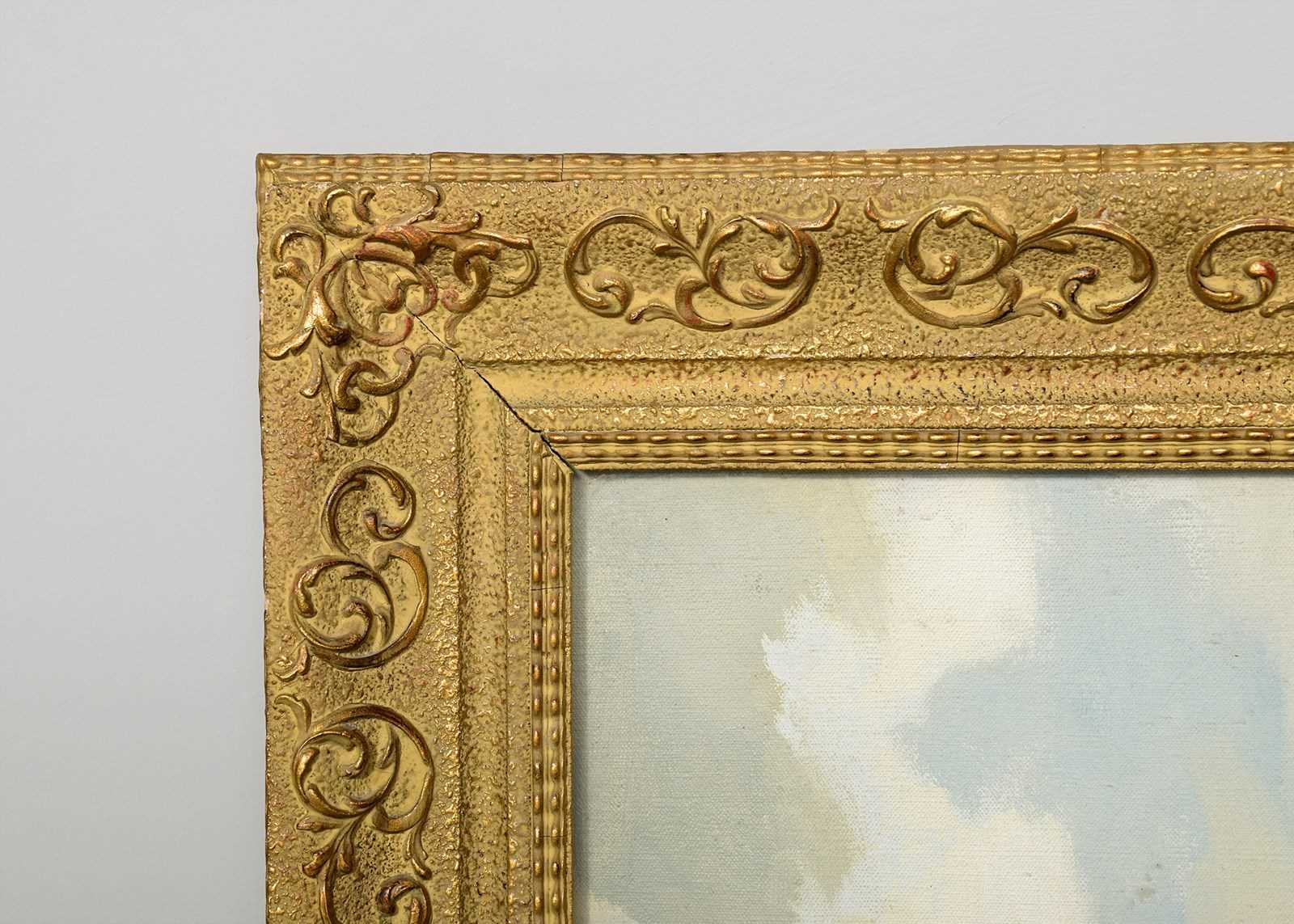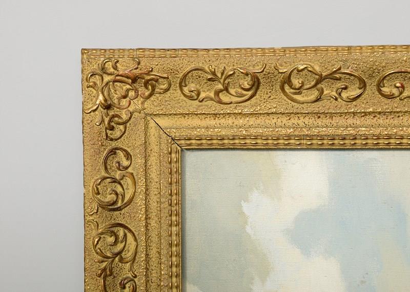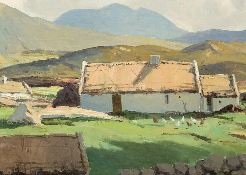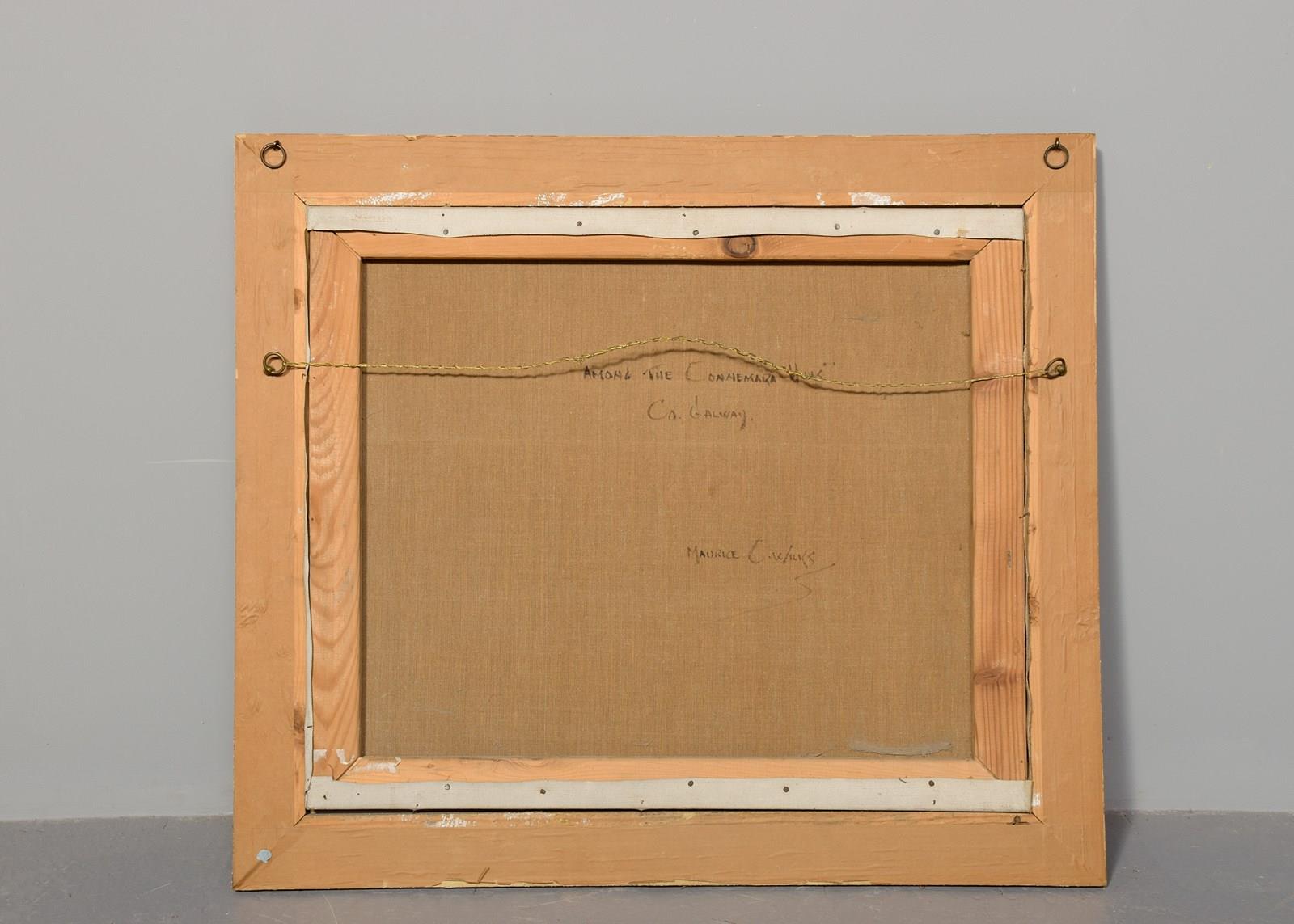 Circa 1960s. An oil on canvas by Morris Canning Wilks, with the inscription on the back 'amongst the Connemara hills, County Galway by Morris Canning Wilks', the painting with cottages in the fore-ground with fields and rocky walls, with the Connemara hills in the background, in a carved and gilded glazed frame, in excellent condition. Maurice Canning Wilks (1910-1984) was an Irish landscape painter.