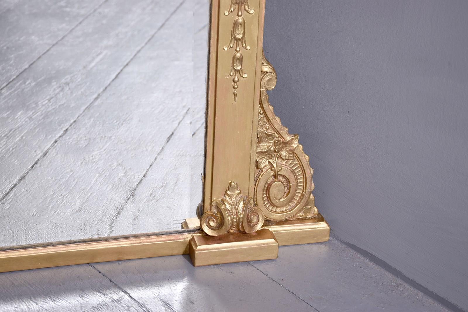 Circa 1850. Neat size Regency Gilded Overmantel Mirror with Neoclassical Decoration. surmounted by a moulded cornice, the frieze with bell flower chains, paterae, and neoclassical torch decorations. The bevel-edged mirror is in excellent condition and flanked by pillars with bellflower chains. The breakfront base with acanthus and scrolled decoration. Traditionally restored by hand and in excellent condition.