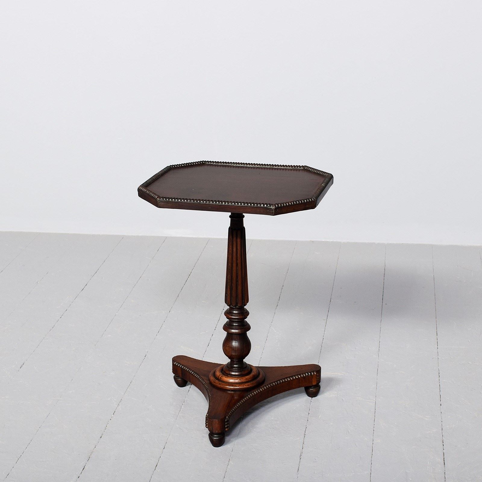 Circa 1830 (with restorations). Neat size Regency rosewood occasional table with beaded rim. The figured rosewood rectangular top with canted corners and a beaded rosewood periphery supported on a fluted tapering ring turned stem and collar over a beaded tripartite base over three neat bun feet.