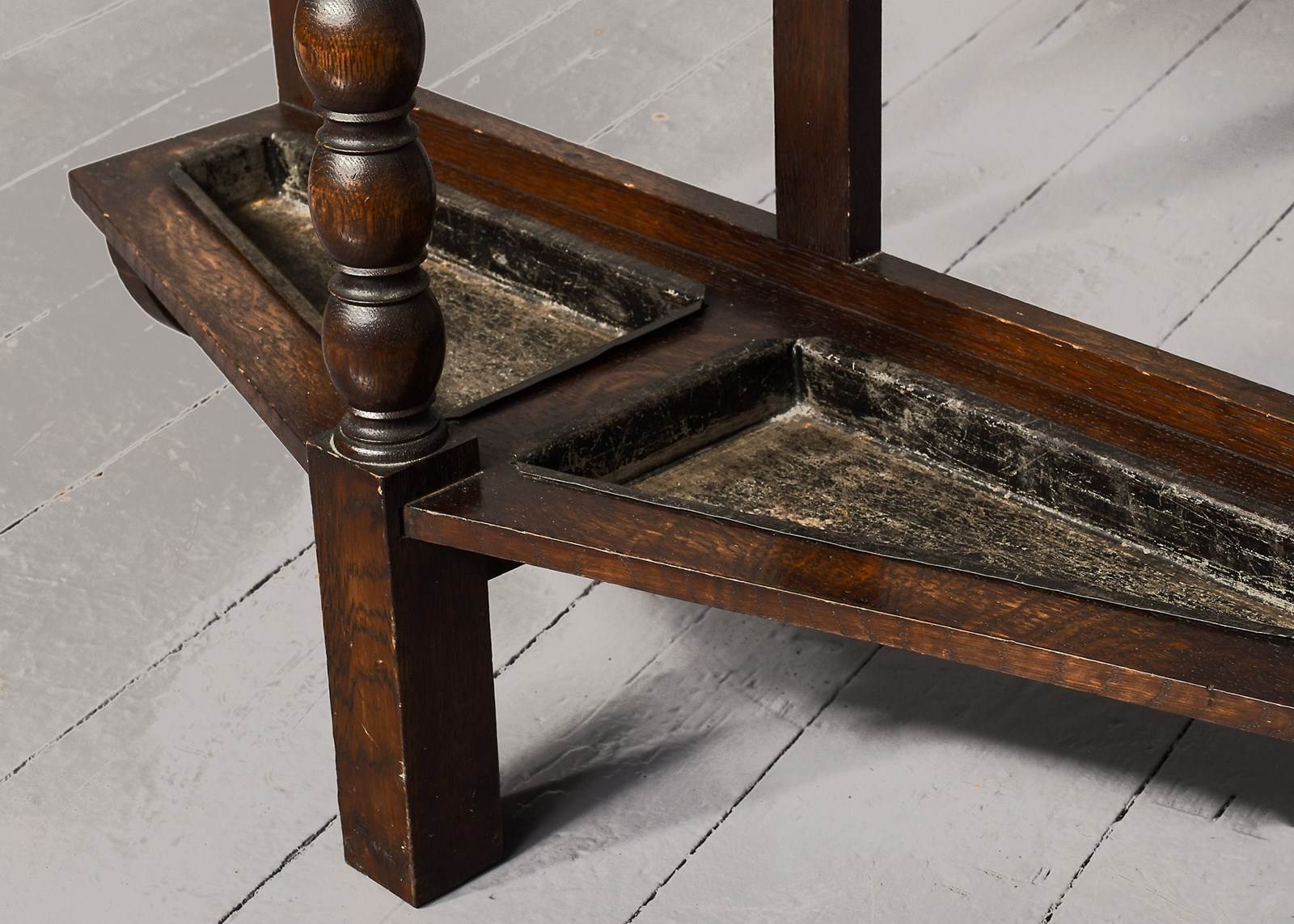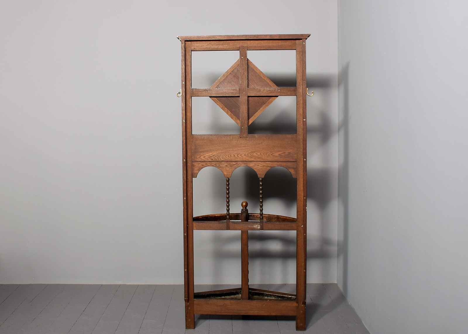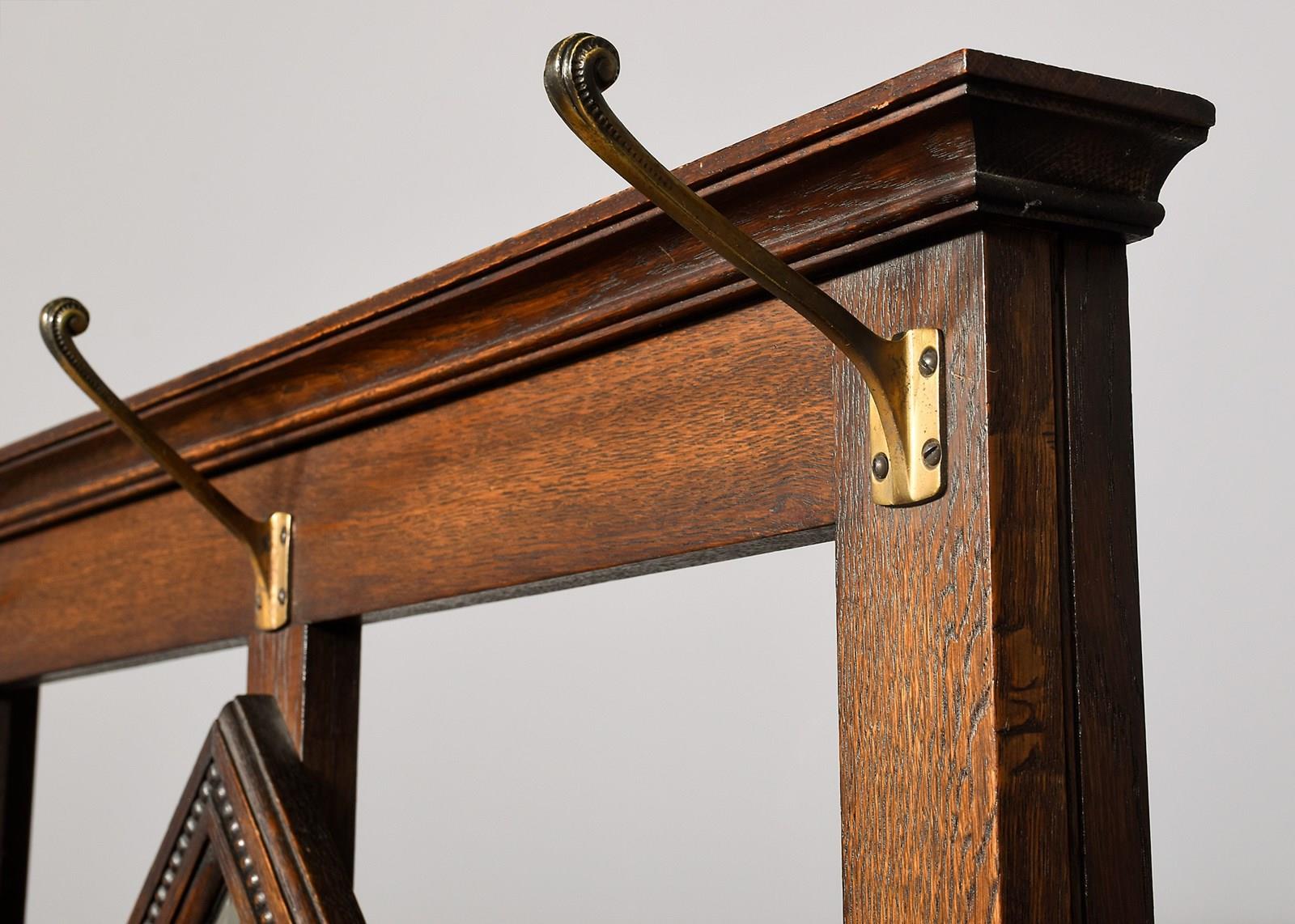 Circa 1900. Neat-sized Arts and Crafts influence mirror-back oak hall stand. The open back with its original Arts and Crafts metal coat hooks and a diamond-shaped bevel-glass mirror above a glove box on ring turned supports above a demi-lune stick/umbrella stand with original metal drip trays.