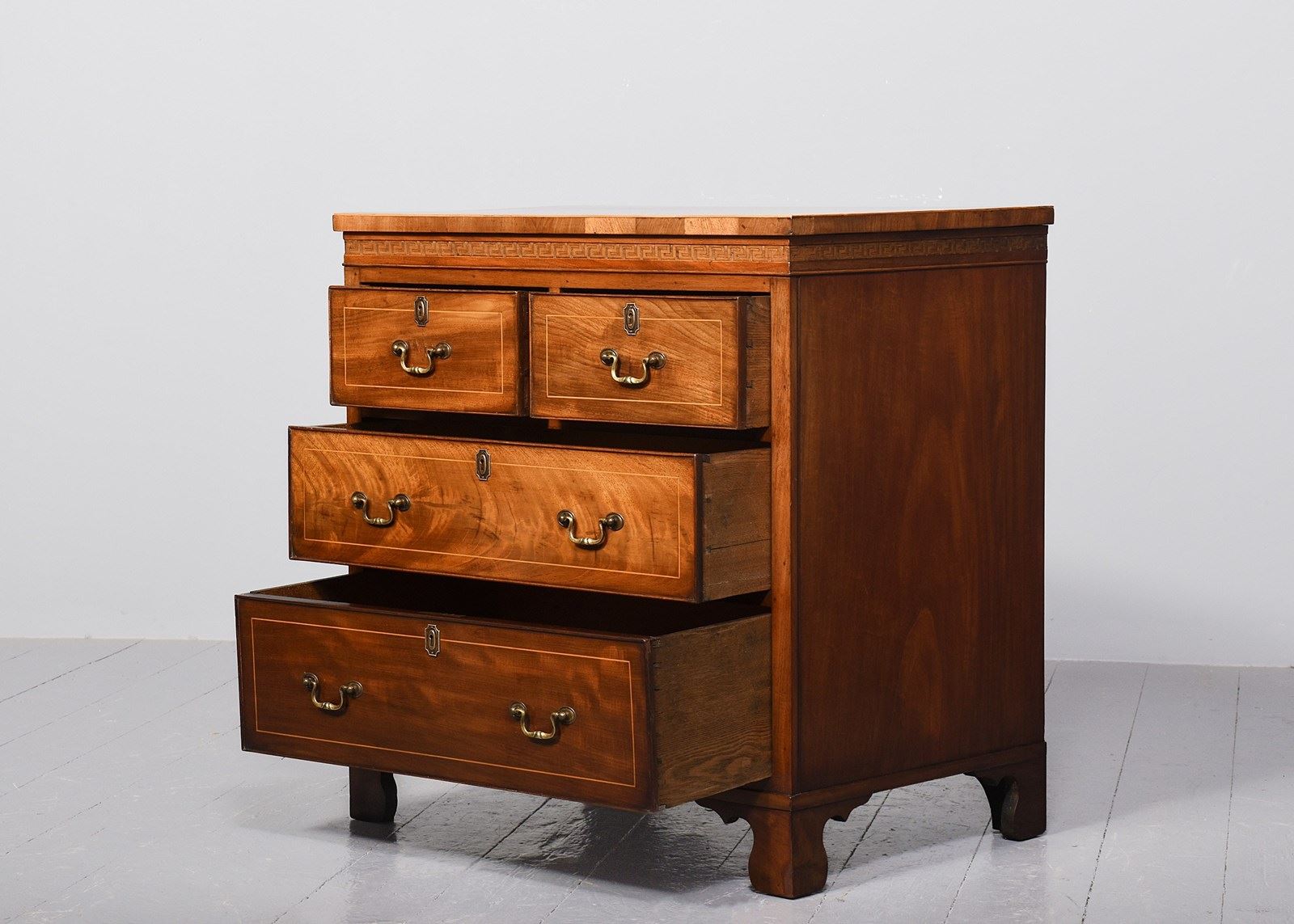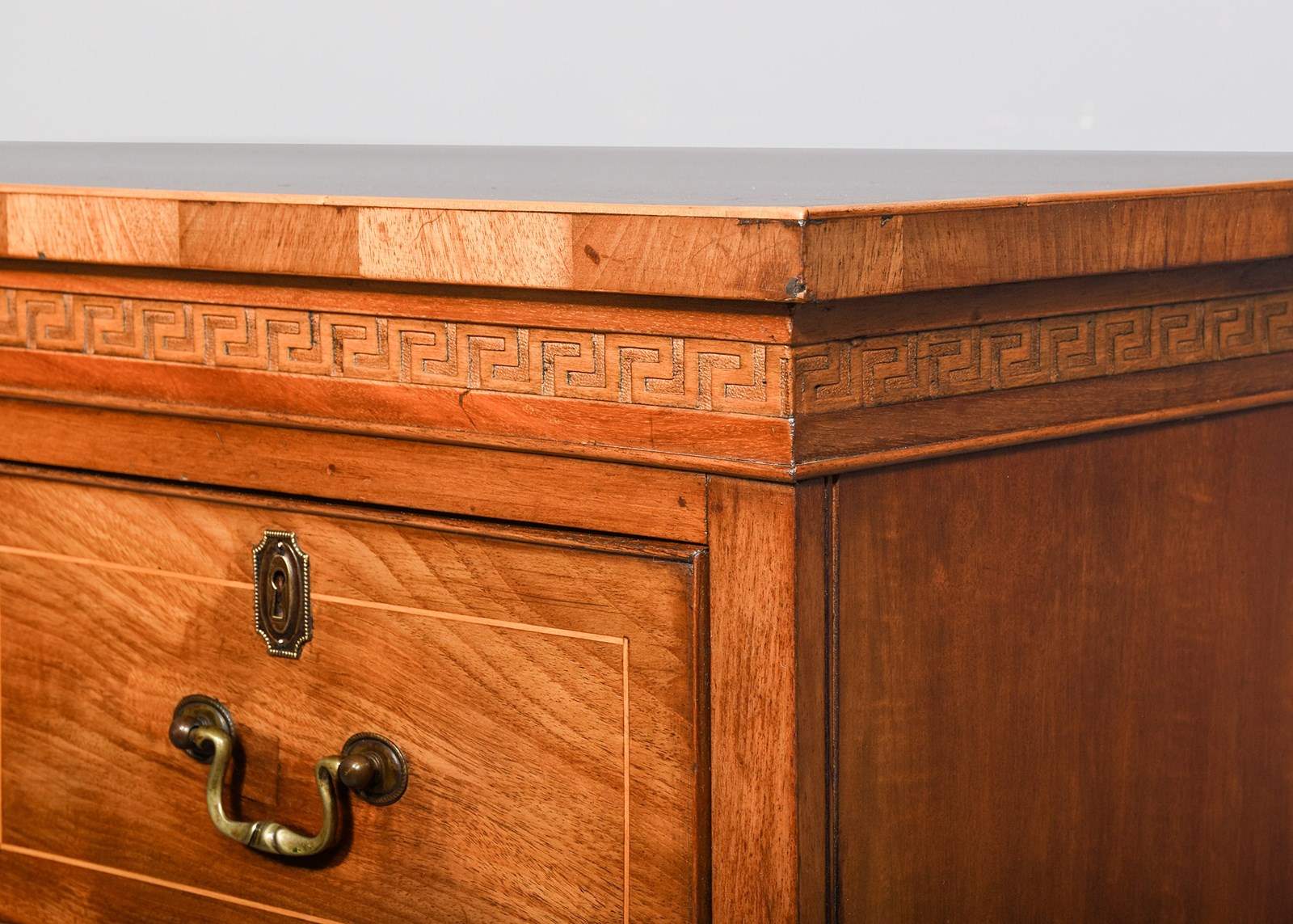 Circa 1880. Neat size inlaid mahogany Regency-style chest of drawers. The rectangular top with boxwood stringing and boxwood edging above a Greek key relief frieze. With two short and two long cock-beaded and inlaid chest of drawers with brass locks, ash linings and brass escutcheons. The sides with matching Greek key frieze and all supported on a neat base with shaped bracket feet.