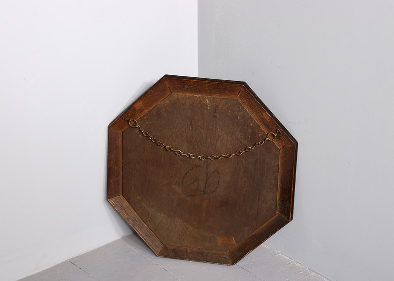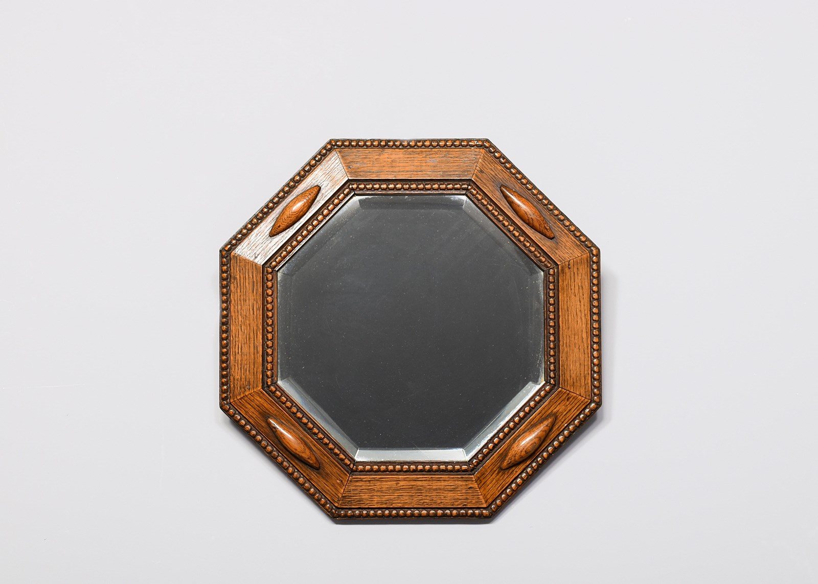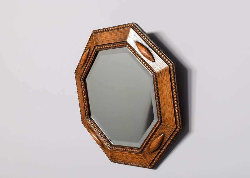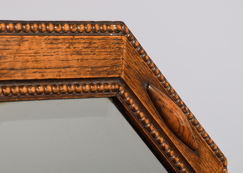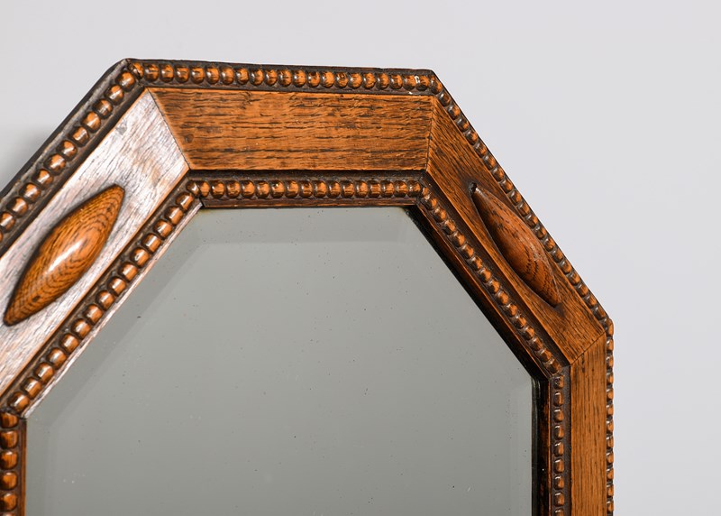 Circa 1920. A Jacobean style oak-framed octagonal mirror of desirable proportions, the bevel-edged mirror contained in an oak frame with beading around the mirror and the outside edge, the frame is set at a slight angle with elongated lozenge shapes in four positions, the mirror is clean without foxing.