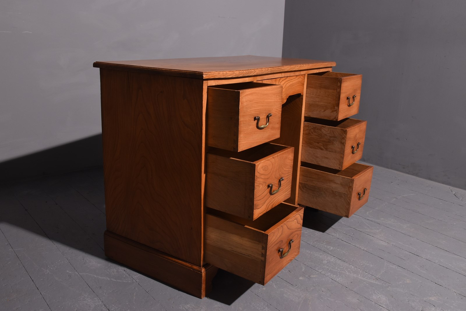 Circa 1930 Neat-sized Quality Figured Oak Desk. The rectangular polished top in figured oak above a kneehole with a shaped front drawer. Flanked by banks of three drawers with brass swan-neck handles. All supported on moulded bases with shaped bracket feet. In excellent condition.