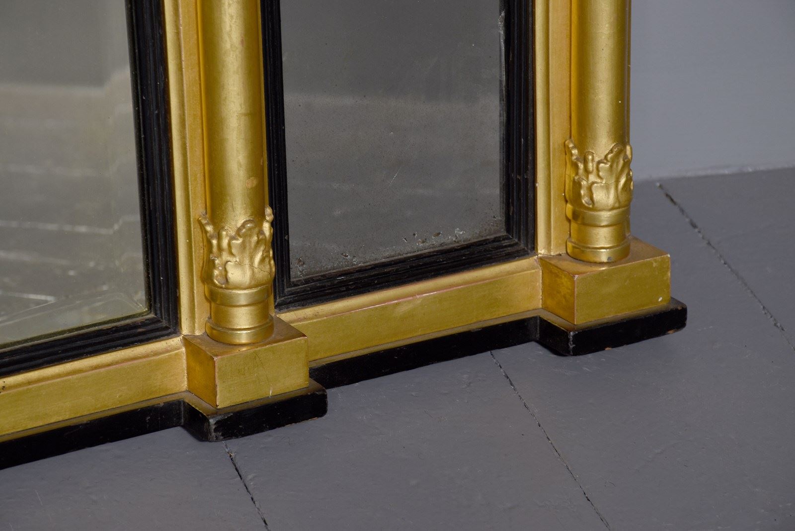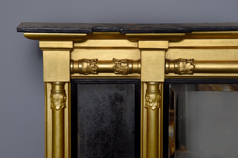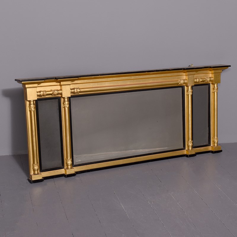 Circa 1840. Neat-sized Regency gilt overmantel beveled-edge mirror. With a part ebonized pediment above a gilded cornice with doubles pillars and horizontal column with acanthus clasps to the sides. The three beveled mirrors with fluted ebonized slips; the glazing in reasonable condition (some “foxing” to the side mirrors) over a matching double breakfront base on a small, ebonized plinth. Retains original gilding and overall, in excellent condition.