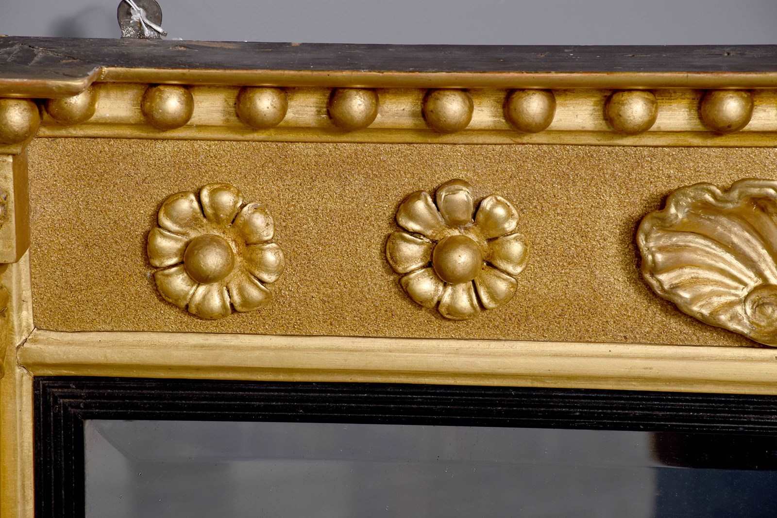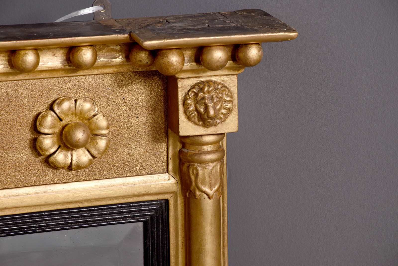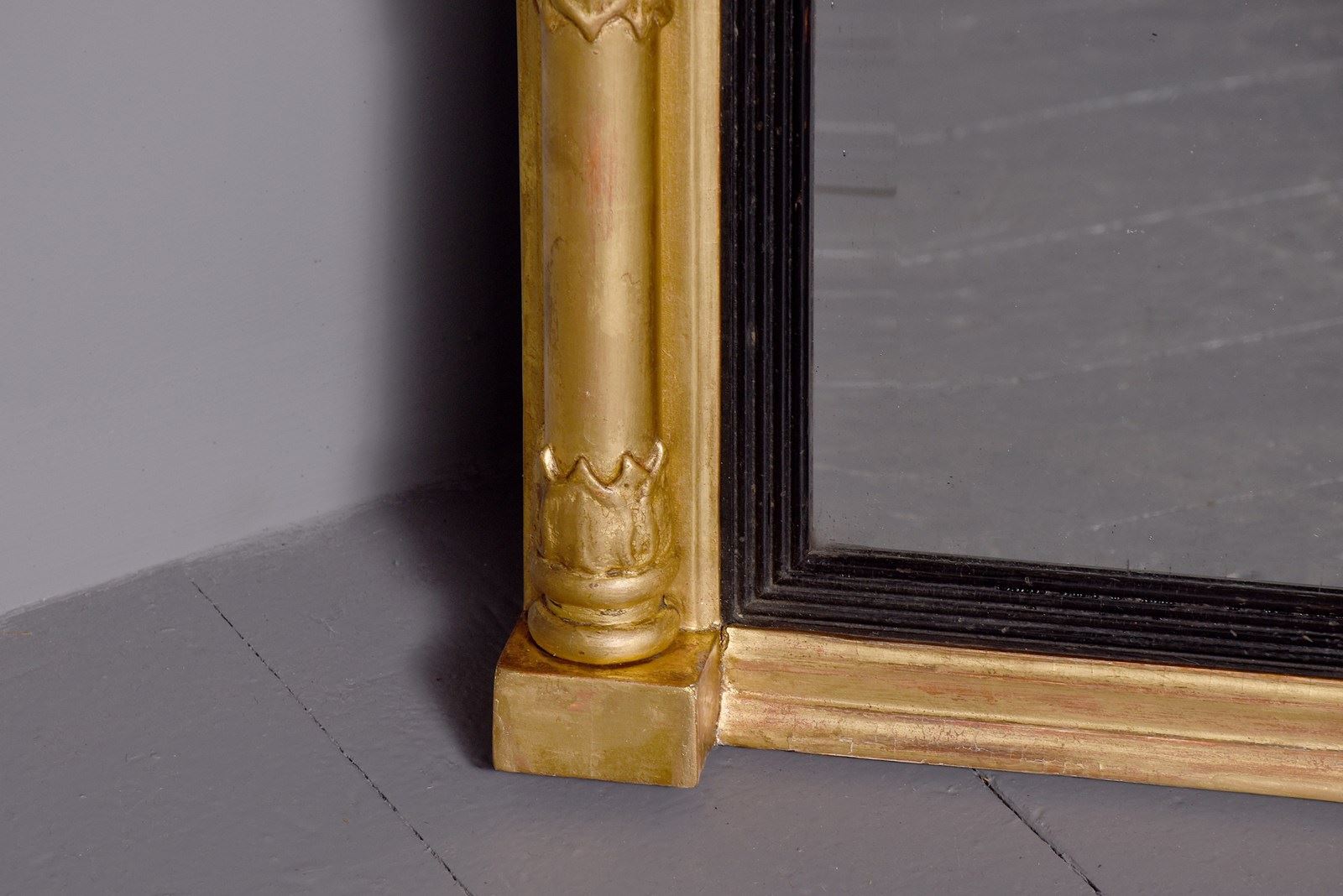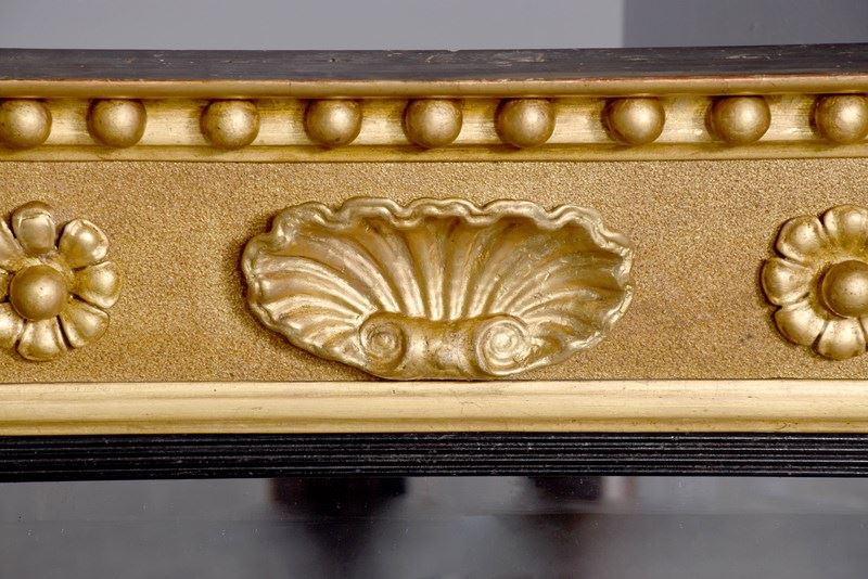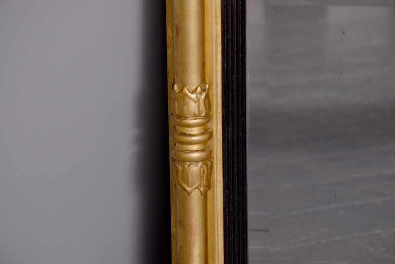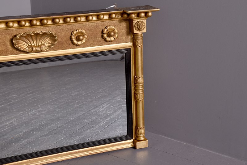 Circa 1830. Neat-sized Regency giltwood rectangular bevelled-edge overmantel mirror. The reverse breakfront cornice with roundel decorations above a frieze with flower head decorations. The rectangular bevelled mirror plate in excellent condition with a fluted ebonised slip and flanked by waterleaf clasped columns.