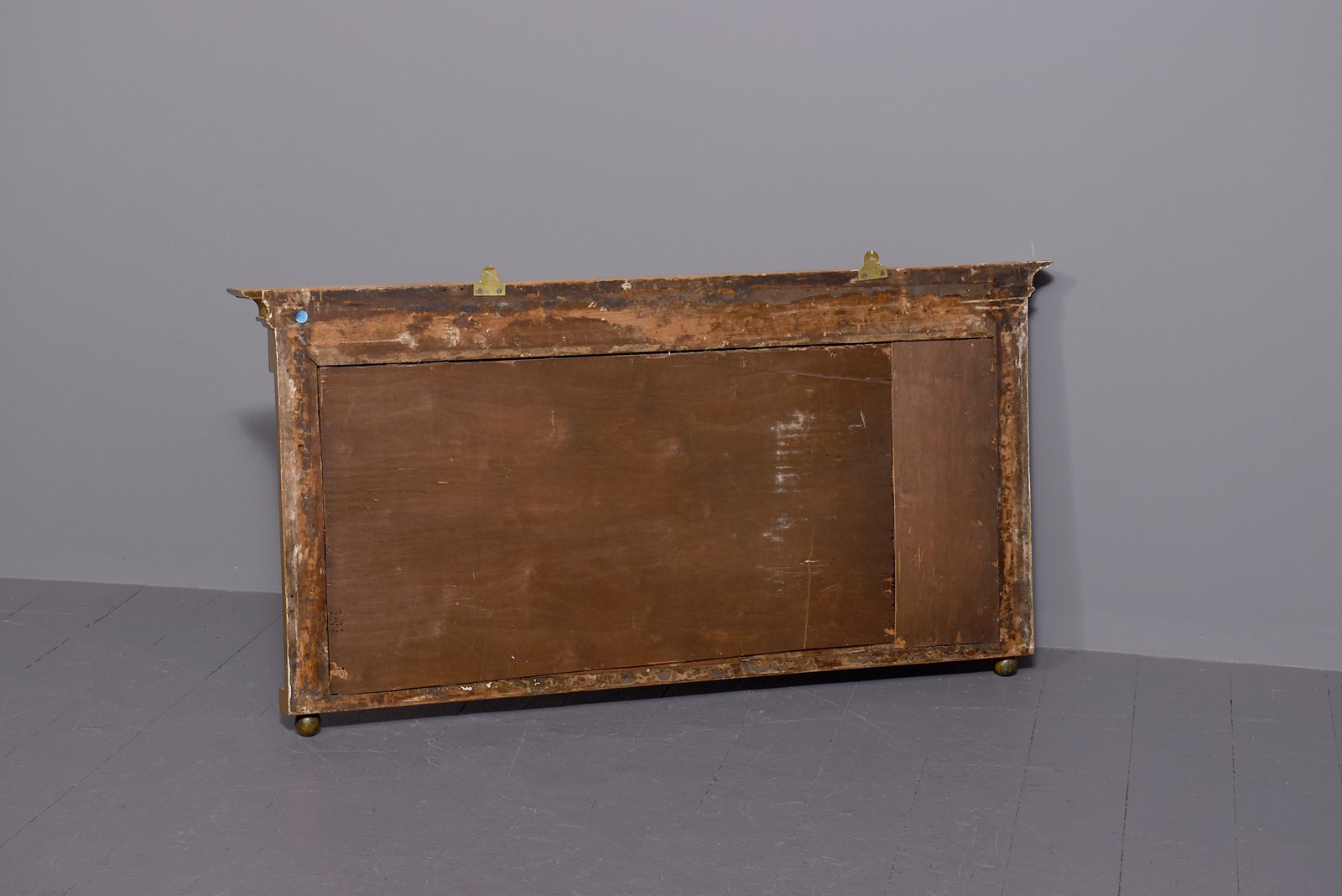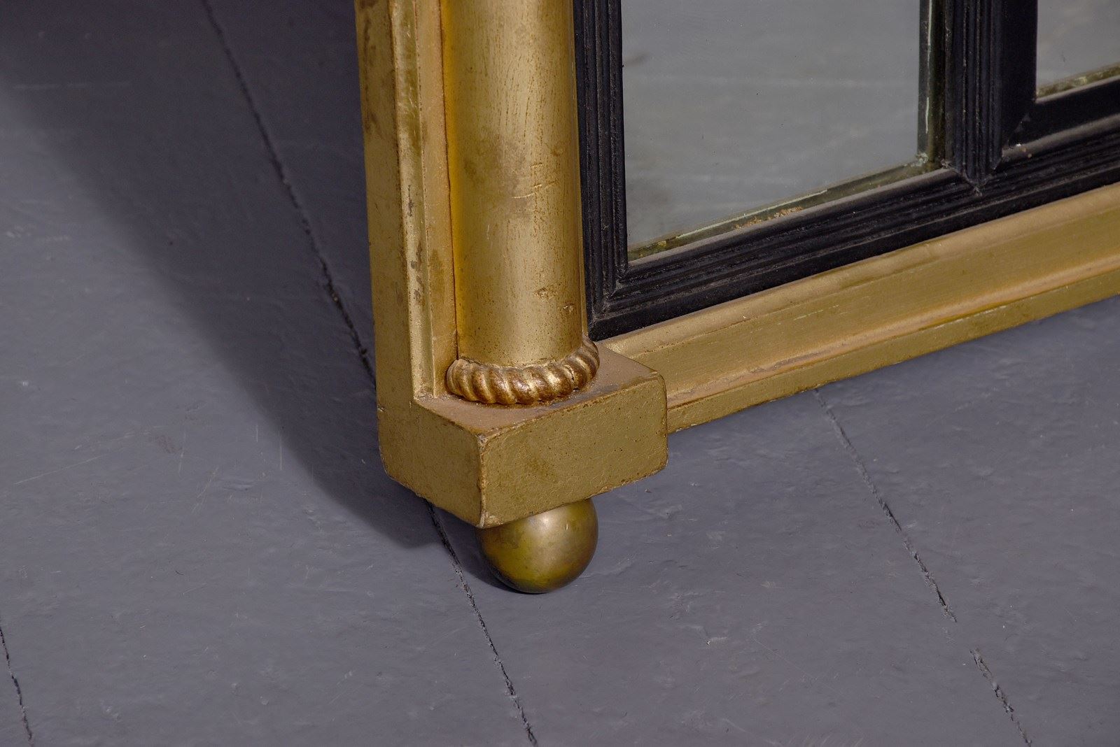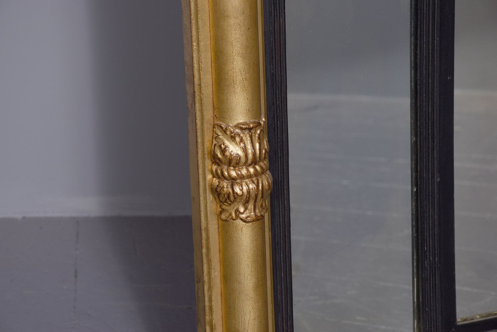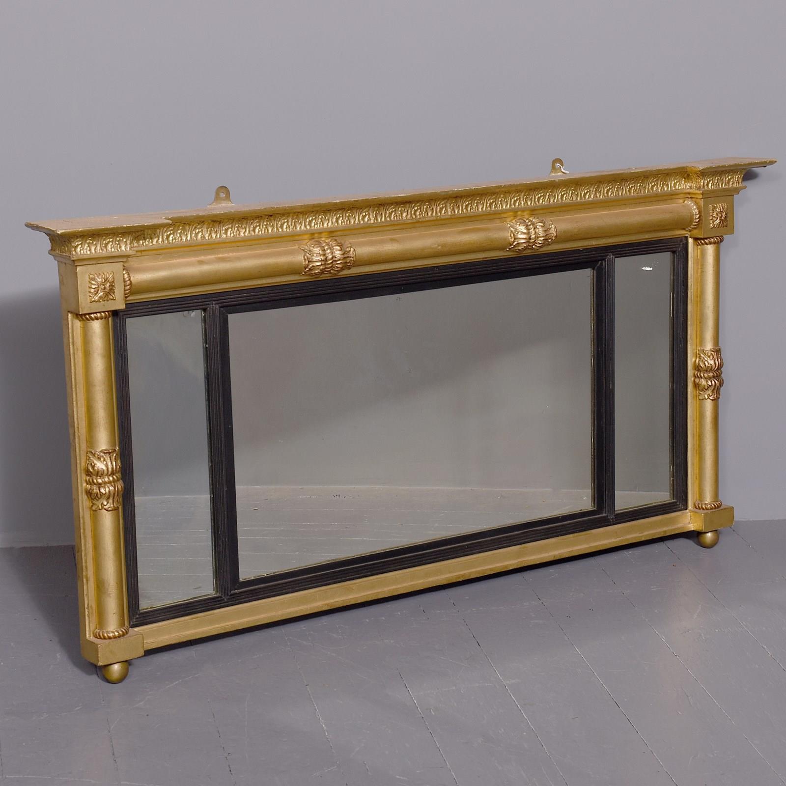 Circa 1830. Neat-sized, Regency period gilded triptych overmantel mirror with acanthus decorated columns. Surmounted by an acanthus decorated cornice and frieze with horizontal columns with acanthus clasps. The sides with matching vertical acanthus clasped columns. With a central larger mirror, flanked by two smaller mirrors with fluted gilt slips above a simple architectural base with roundel decorations. The mirror has much of its original gilding and the mirror plates are in excellent condition.