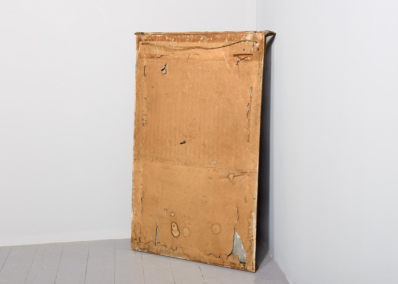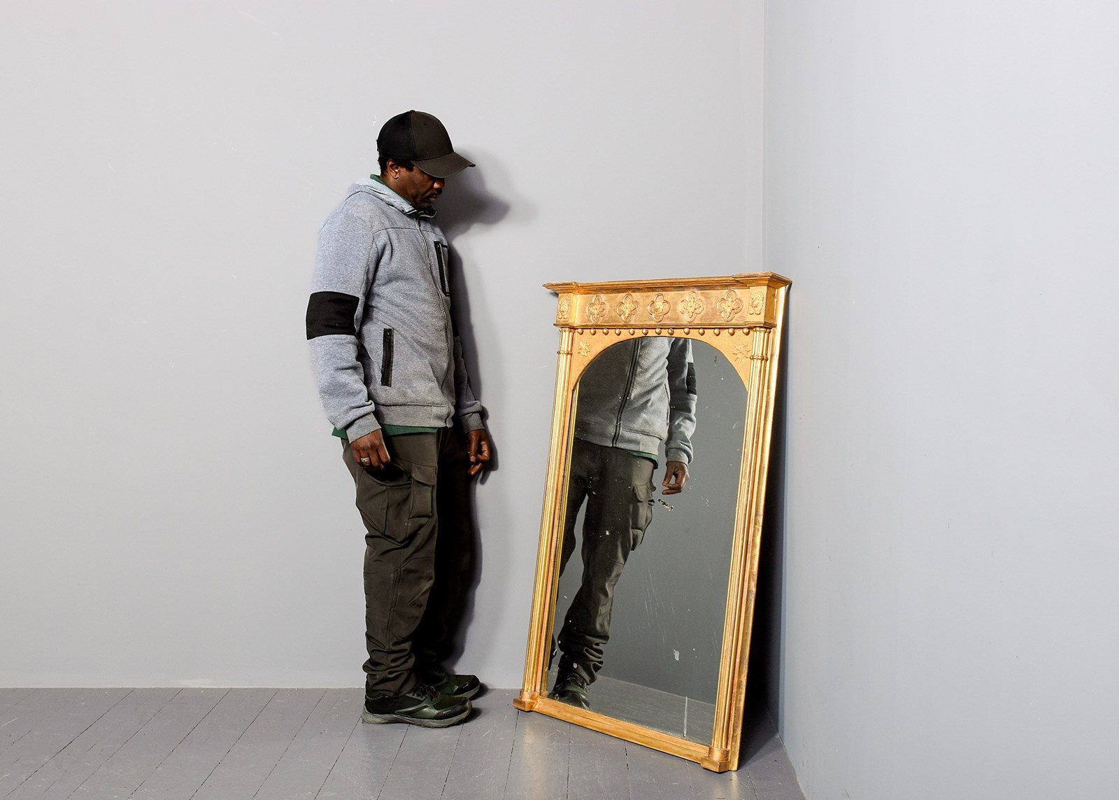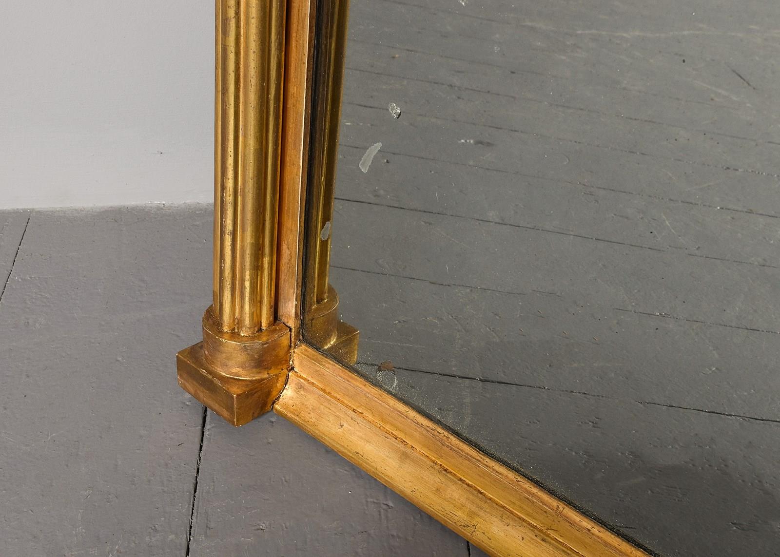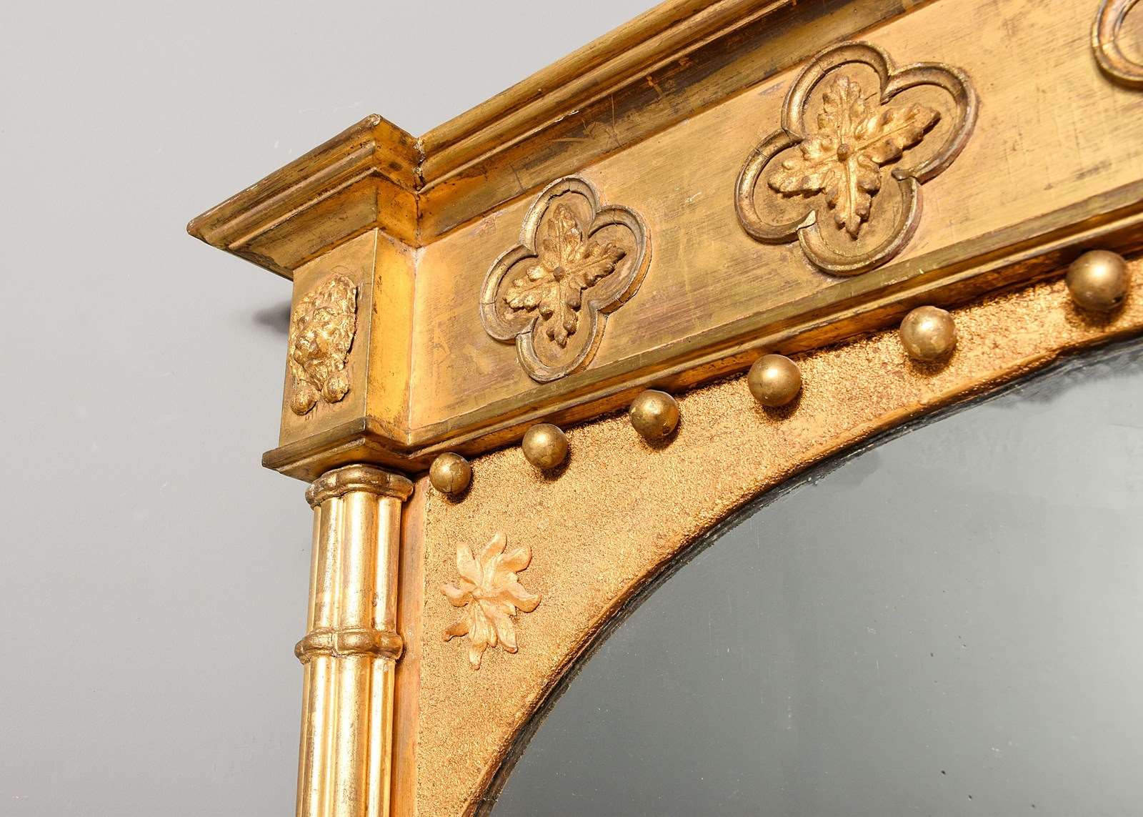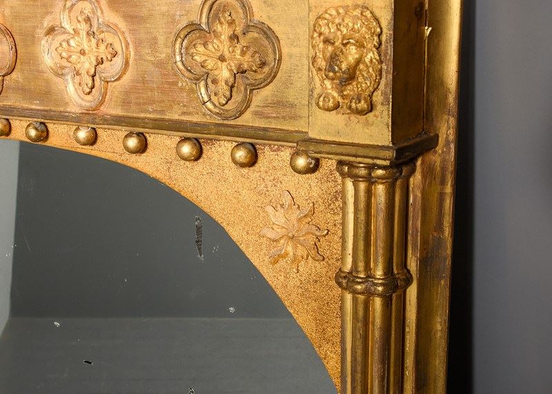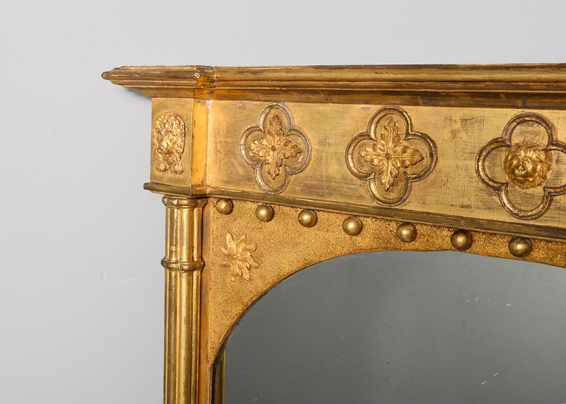 Circa 1820. Neat-sized Regency period gilt pier mirror. The moulded breakfront cornice above a frieze with quatrefoil foliate mounts and lion mask decorations. The arched mirror plate is flanked by gothic reeded columns above a fluted breakfront base.