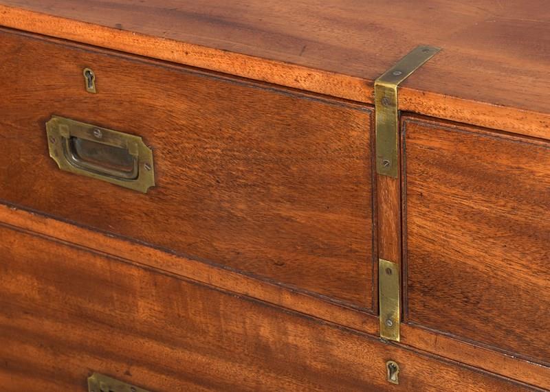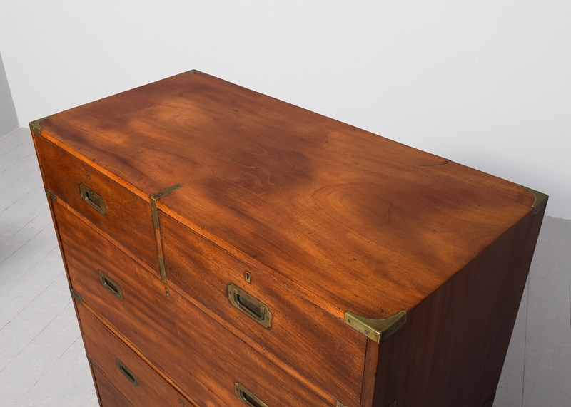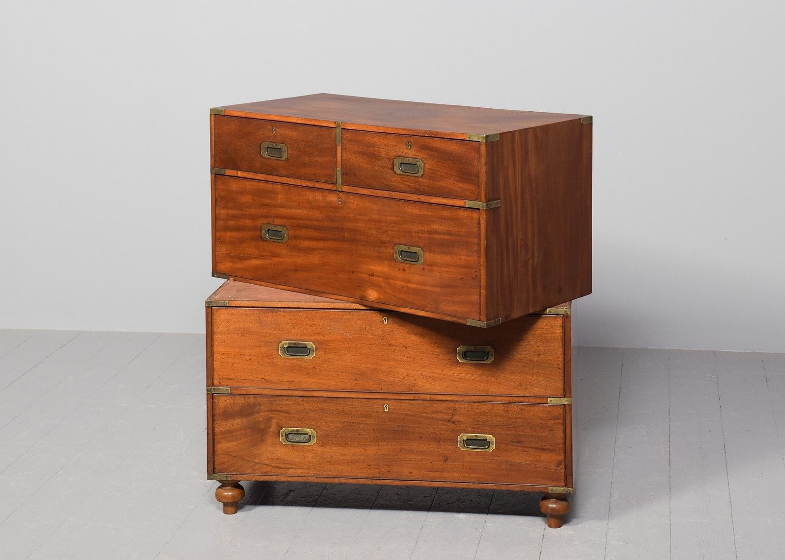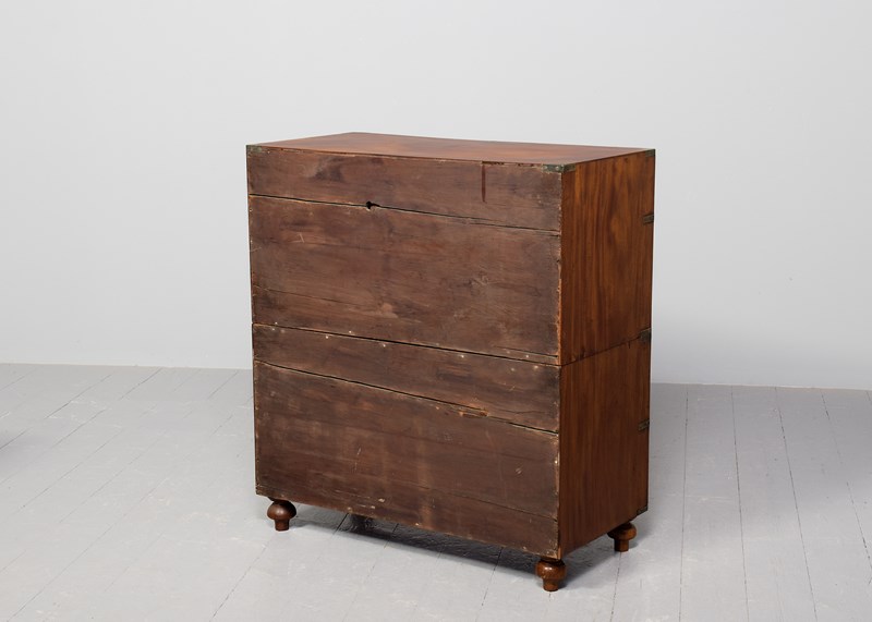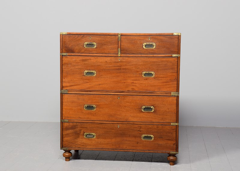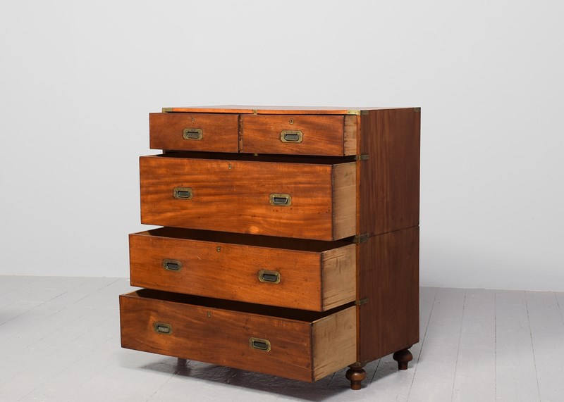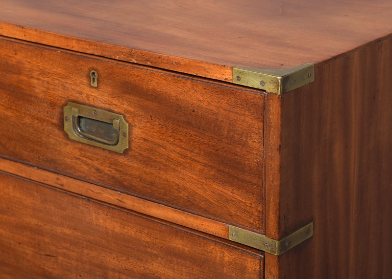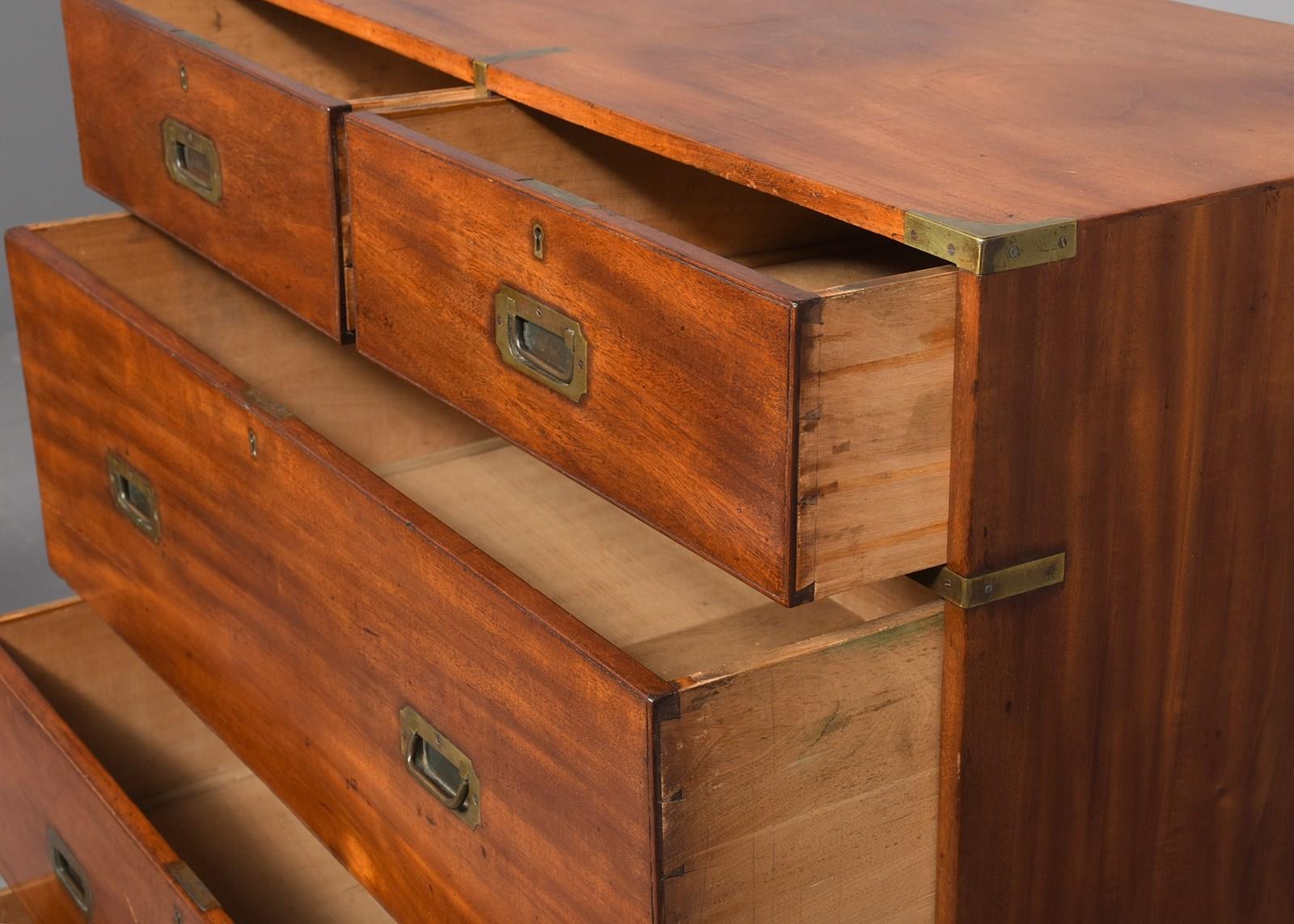 Circa 1860. Two-part, neat-sized Victorian mahogany brass-bound military chest. The top in a lovely, figured mahogany with brass strapping and brass corners above two short and one long deep drawer in the upper section, all with ash drawer linings (sign of quality) and inset brass military handles, and brass escutcheon and locks. The lower section with two long drawers. All supported on neat turned feet. In lovely condition with a nice mellow colour and lovely patina.