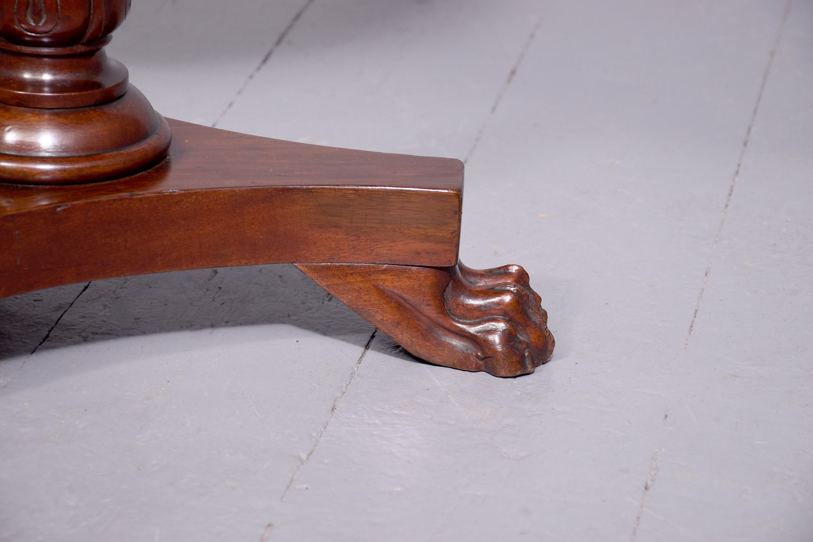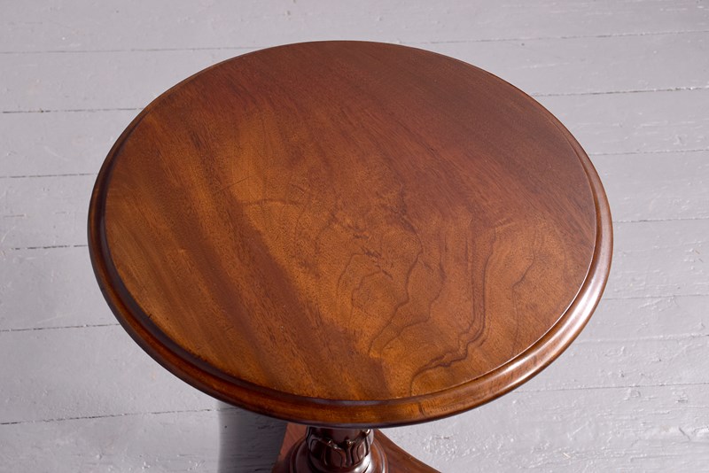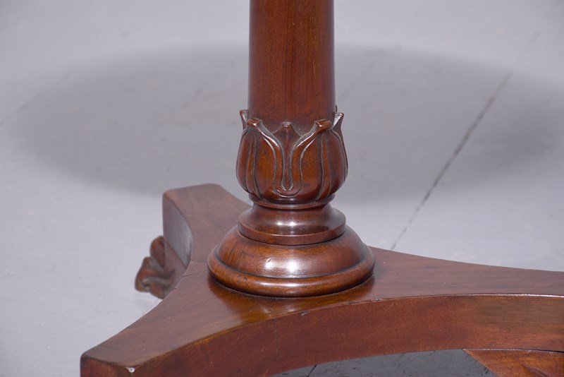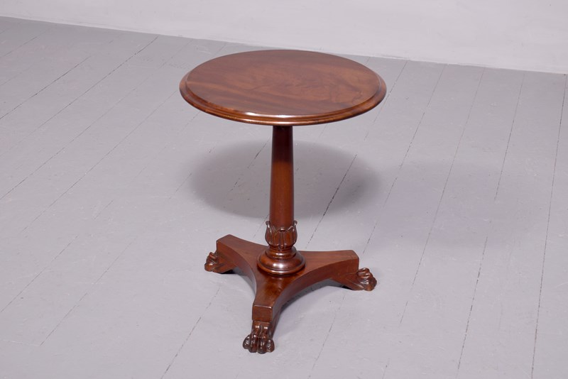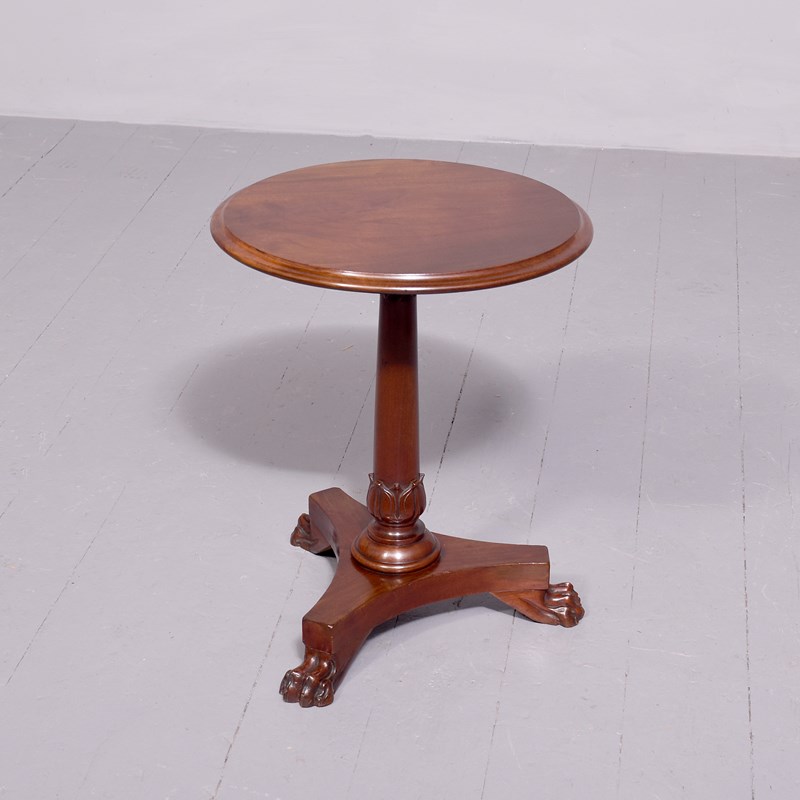 Circa 1830 with alterations. Neat-sized William IV mahogany wine/occasional table on platform base. The circular top in figured Spanish mahogany with a molded edge supported on a tapering column with fine acanthus carvings above a turned collar over a tripartite platform base on lion-claw feet. Quality and functional item.