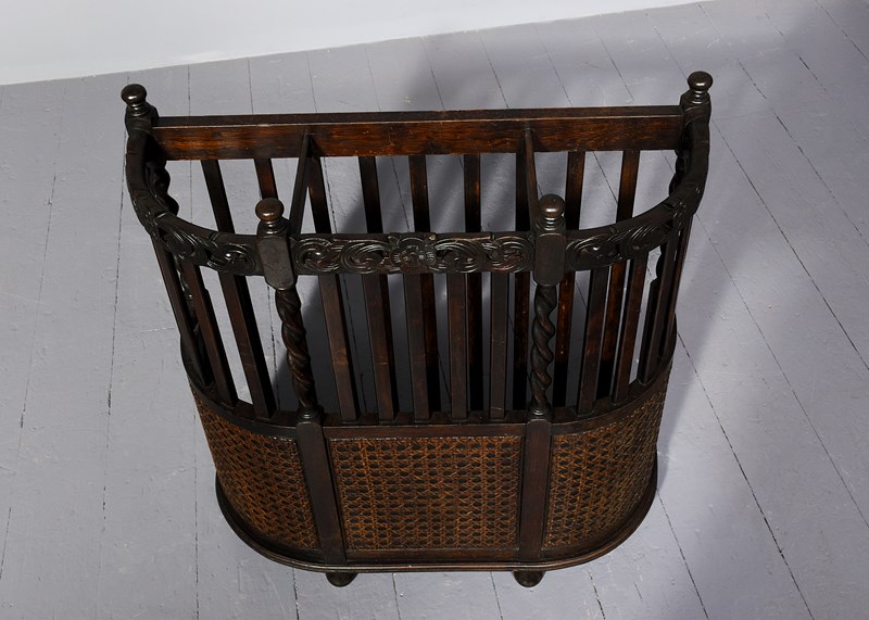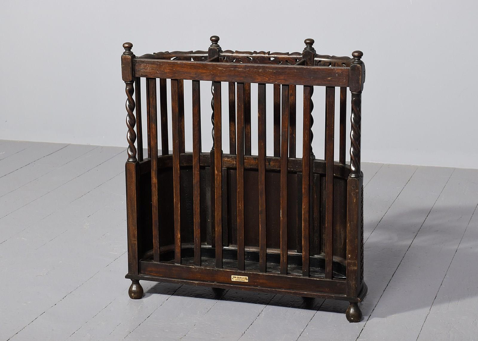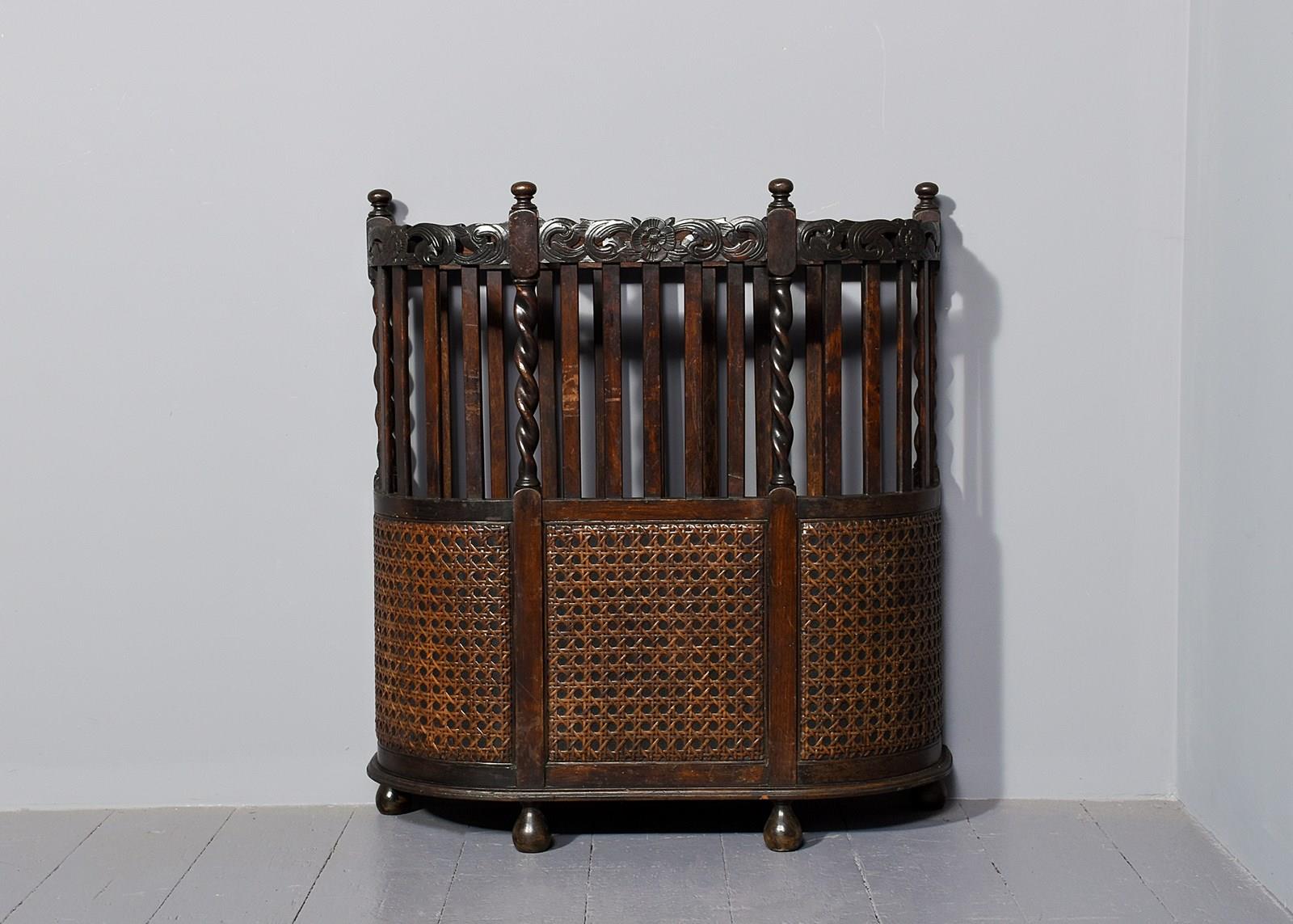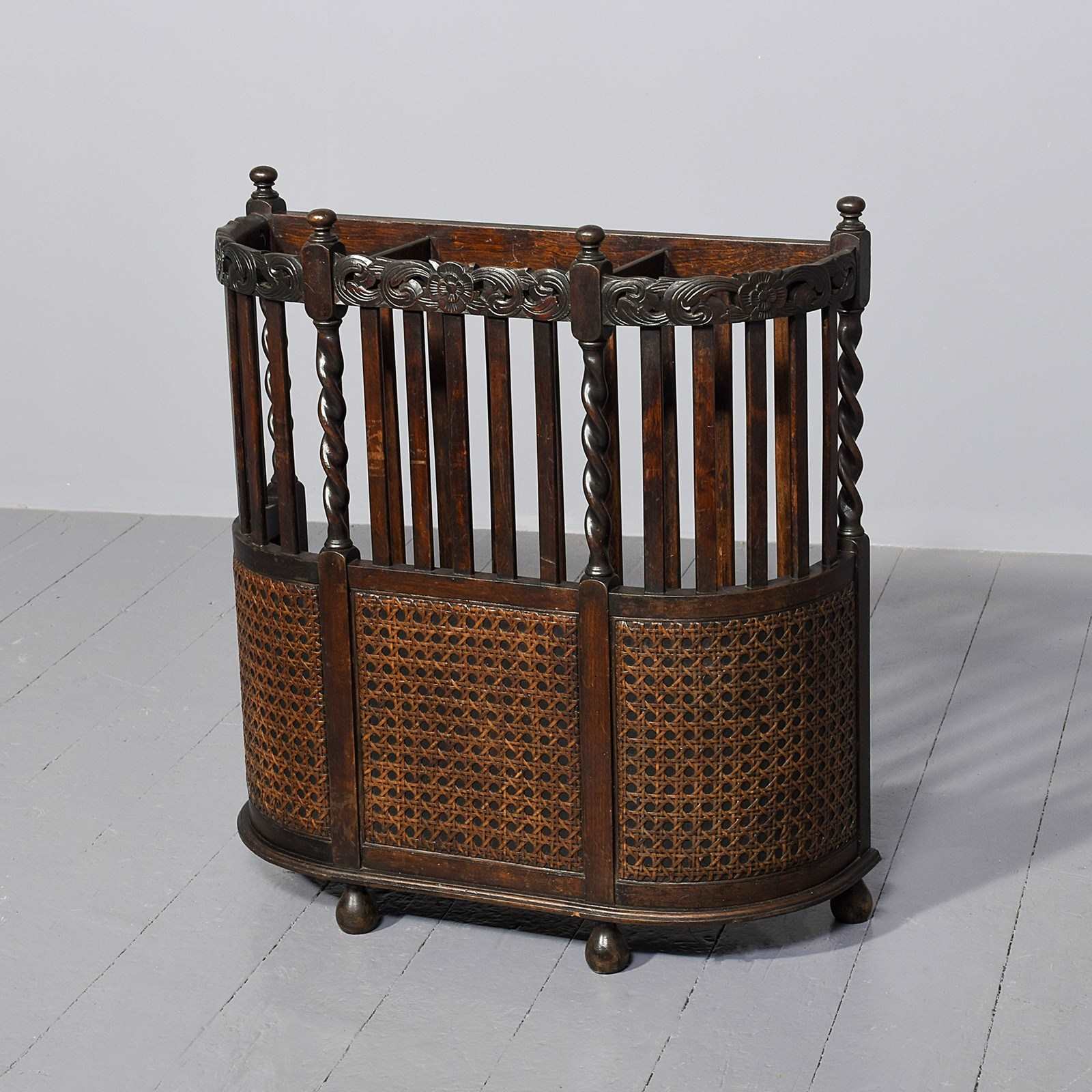 Circa 1900. A stylish Edwardian oak and Bergere 3 division stick stand, the top with curved sides surmounted by 4 finials, the front rail is carved and pierced with flowers and scrolling foliate carving, held in place with barley sugar uprights and a simple spar, the three panels at the bottom in Bergere with a solid back, the base with a lift out drip try, all resting on four stylish tapering bun feet