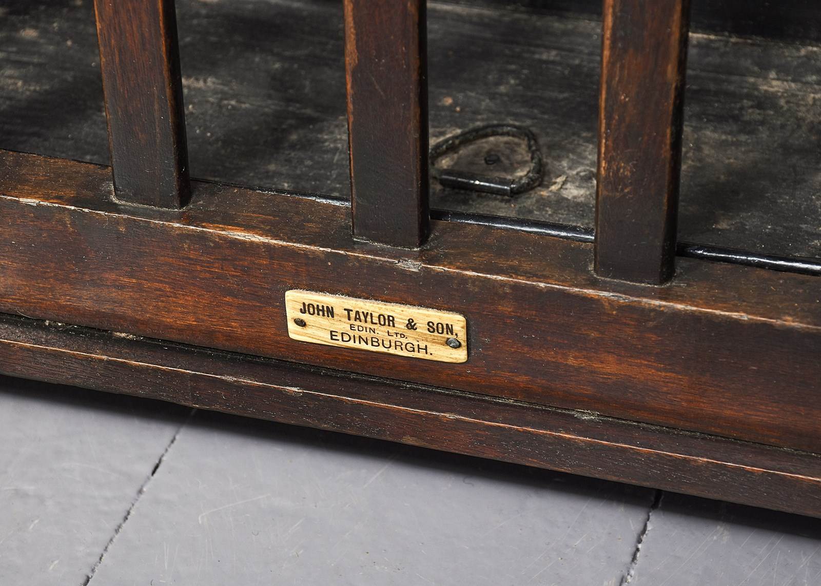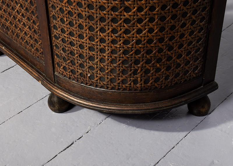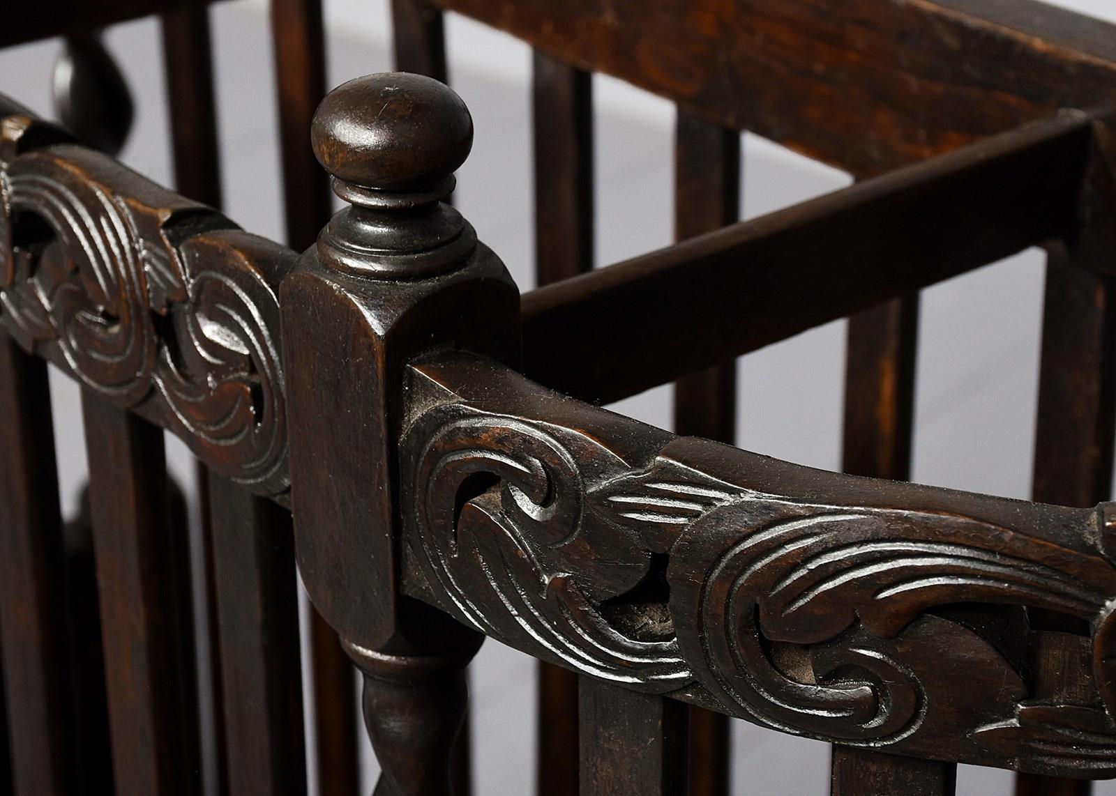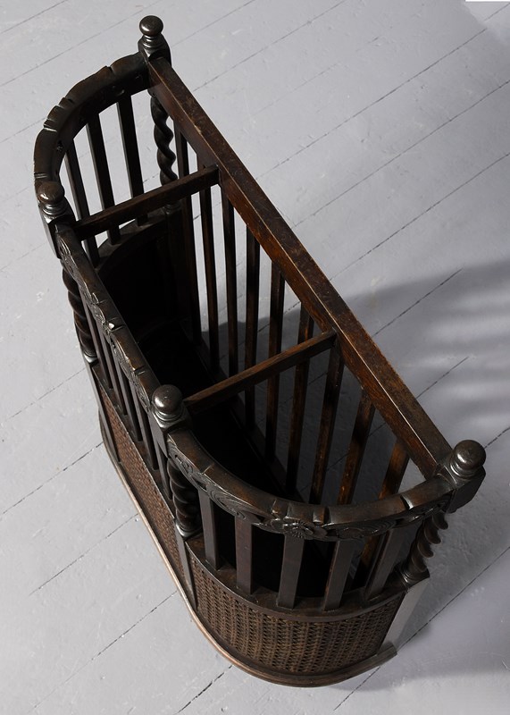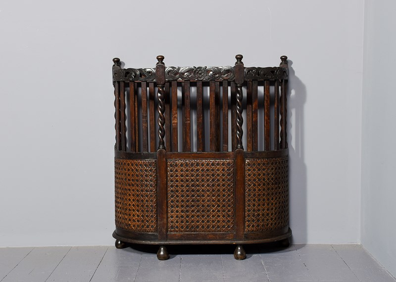 Circa 1900. A stylish Edwardian oak and Bergere 3 division stick stand, the top with curved sides surmounted by 4 finials, the front rail is carved and pierced with flowers and scrolling foliate carving, held in place with barley sugar uprights and a simple spar, the three panels at the bottom in Bergere with a solid back, the base with a lift out drip try, all resting on four stylish tapering bun feet