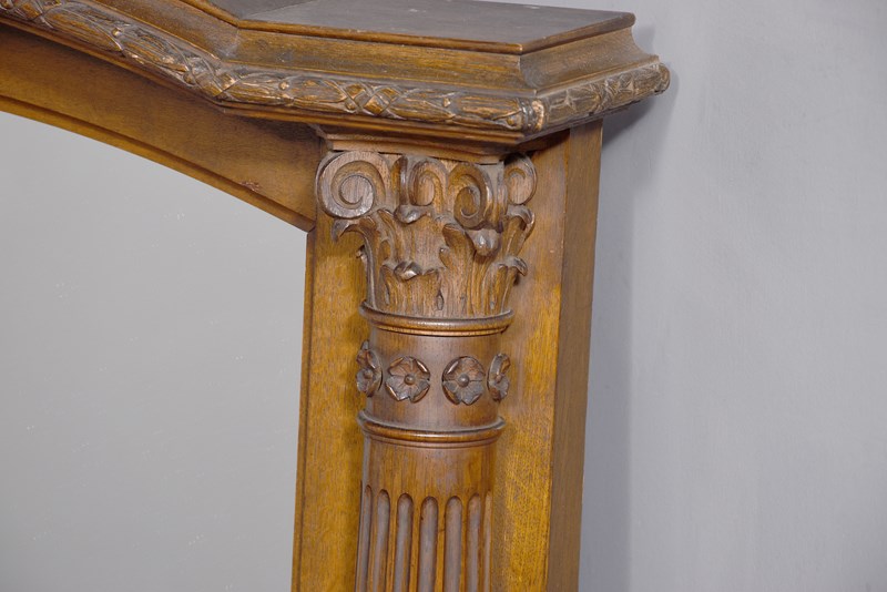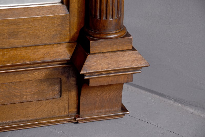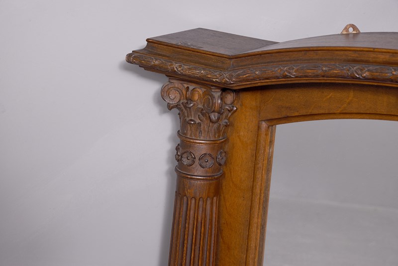 Circa 1880. An unusual, stylish oak-framed mirror, with a domed top with a flat section at each end, stylish moulding with foliate carving to the fore-edge, supported by a carved corbel in the centre. The domed top of the mirror in an oak slip, flanked by a pair of Corinthian columns with carved capitols, flower-heads and fluted stems, resting on platform bases with sloping moulding. Beneath, there are two flat sections and a simple beading.