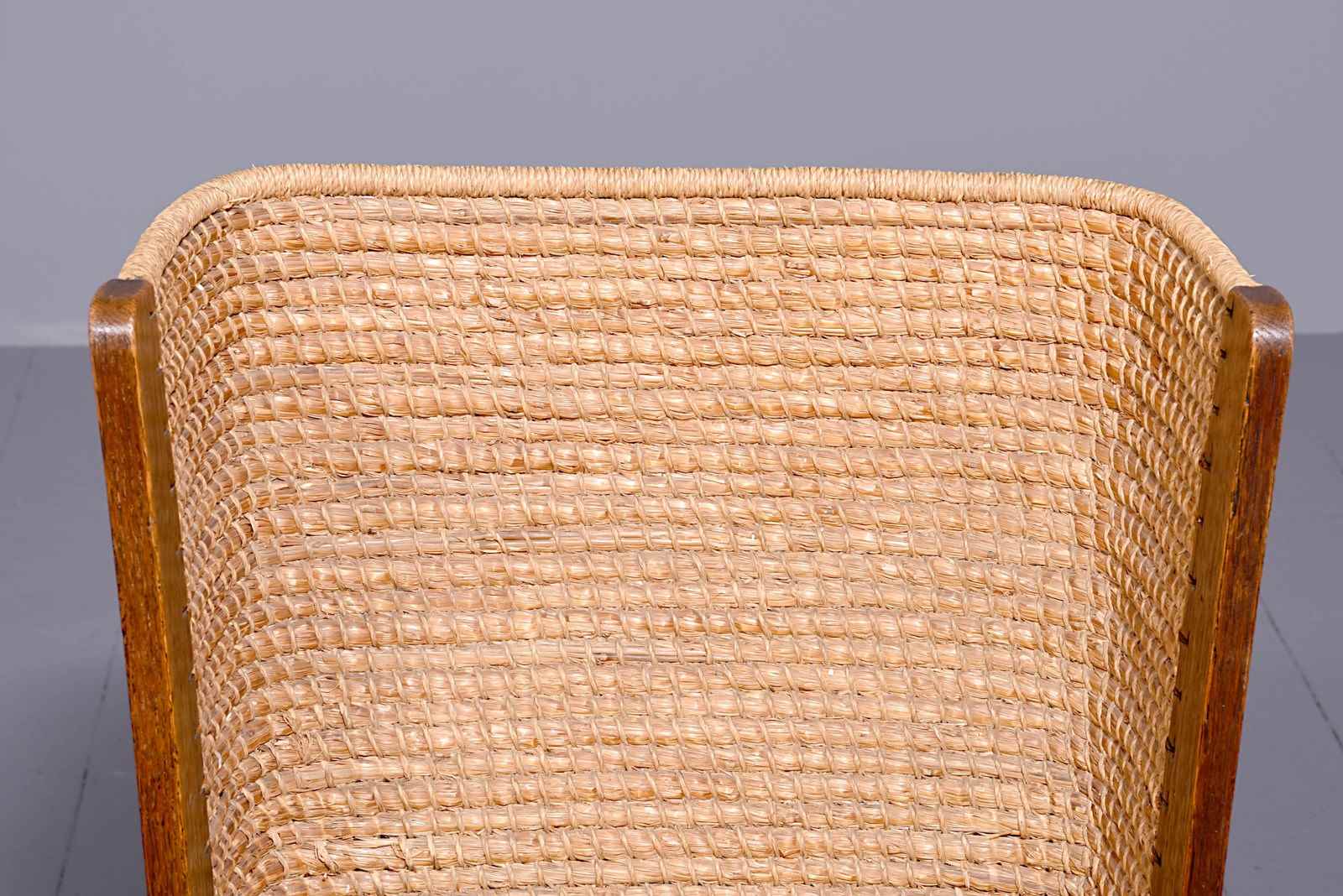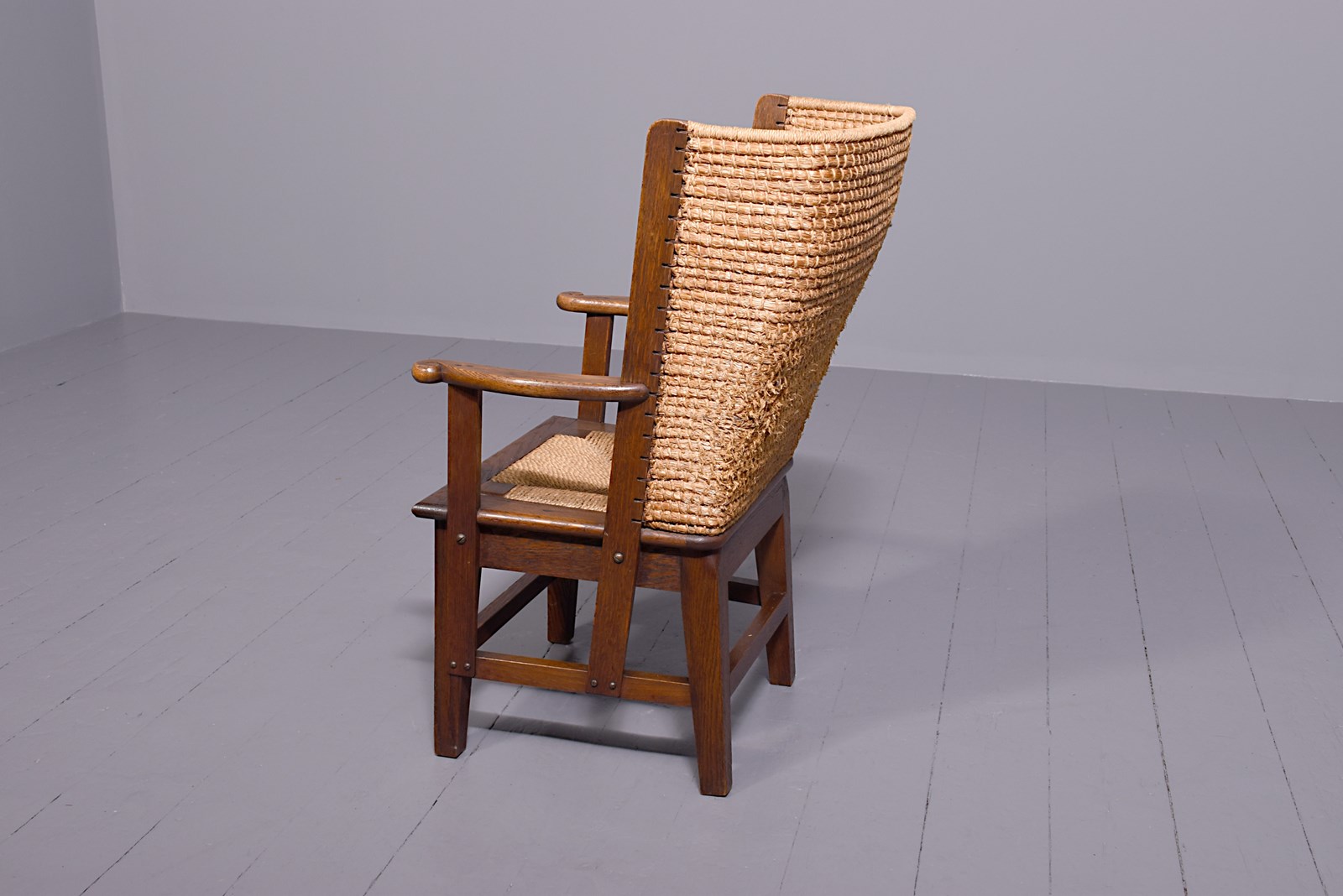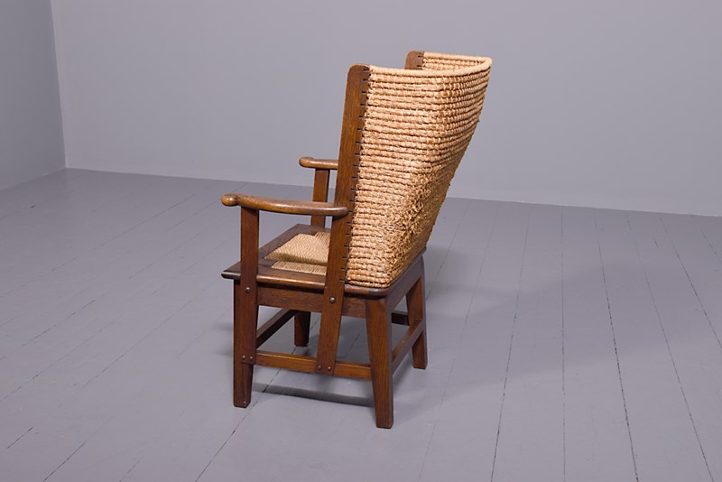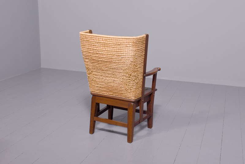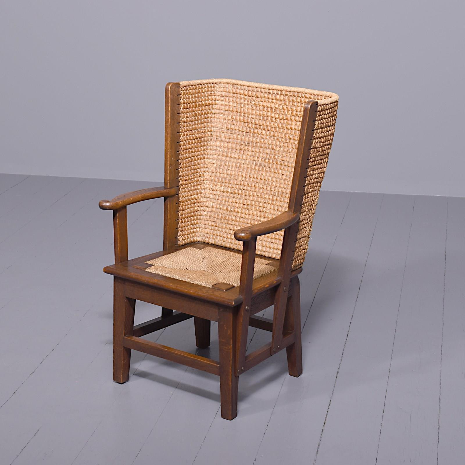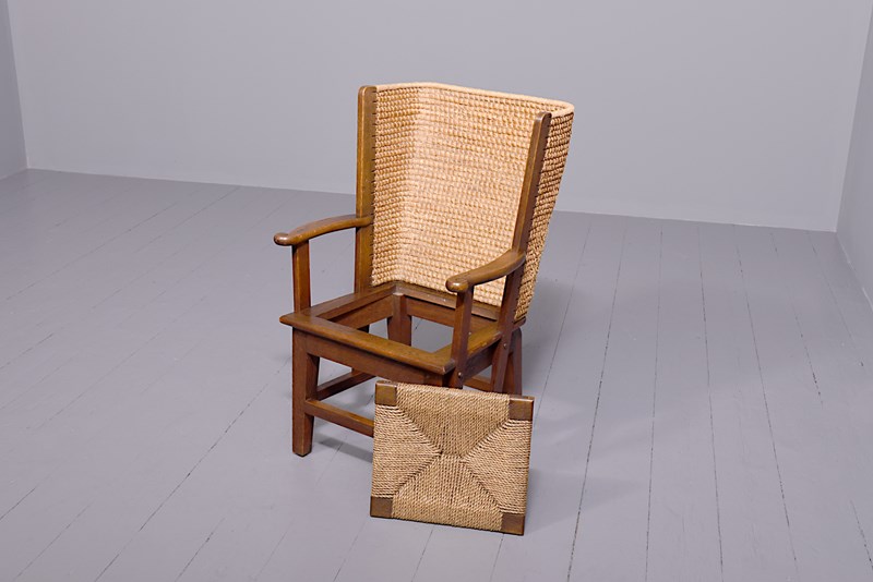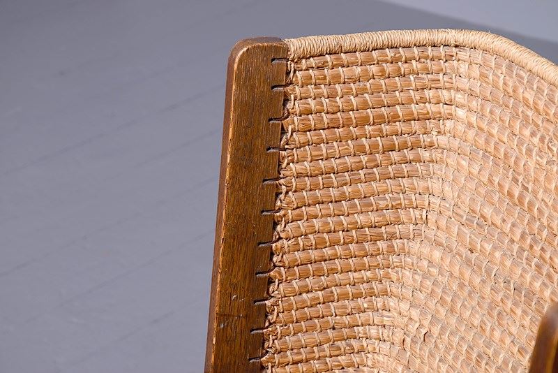 Circa 1950s, oak framed Orkney chair, likely by Kirkness. With a hand woven straw back, and top rail finished in marram grass with an oak framed and rattan weave seat. The chair follows the form by Kirkness, with arms and back screwed to the main body of the chair with brass screws, and shaped arms with small scrolling end. The uprights are in quarter sawn oak and the legs are united by simple square stretchers.
