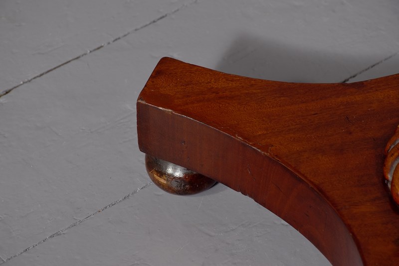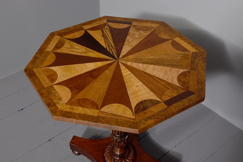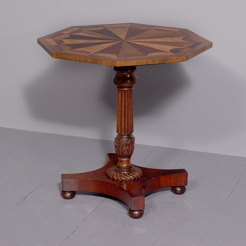 Circa 1820. An unusual and stylish octagonal shaped occasional table, the top with multiple woods including ash, kingwood, walnut and satinwood formed in a sunburst fashion with small lunettes and broad crossbedding in other woods, finishing with burr walnut, supported on a classic turned, ring turned, fluted and carved stem with foliate carving towards the base, with a dragooned collar, resting on a concave quadruple platform base, with four squat bun feet below.