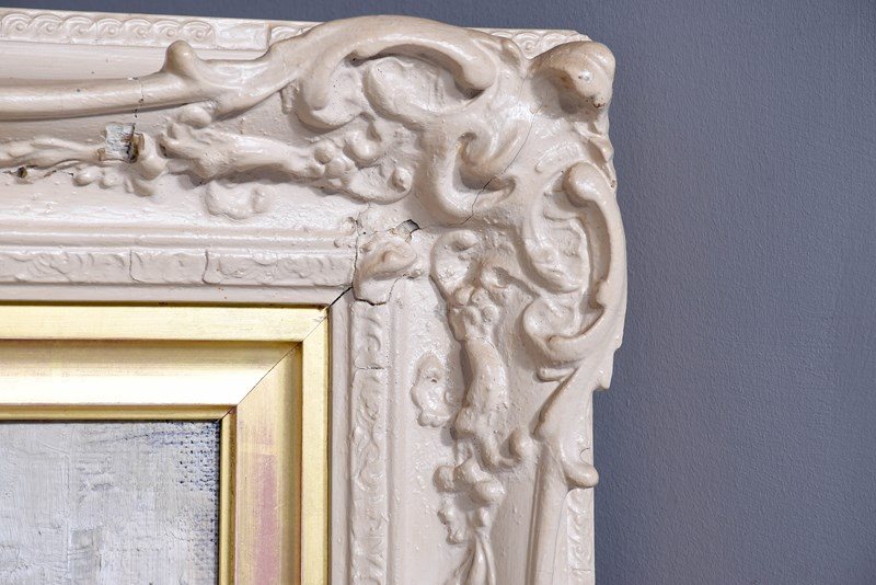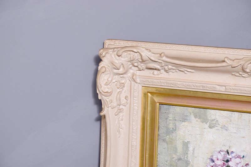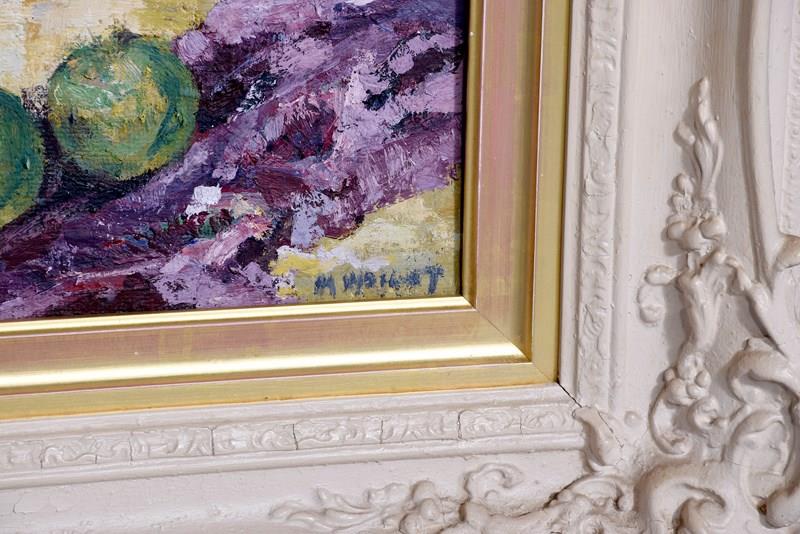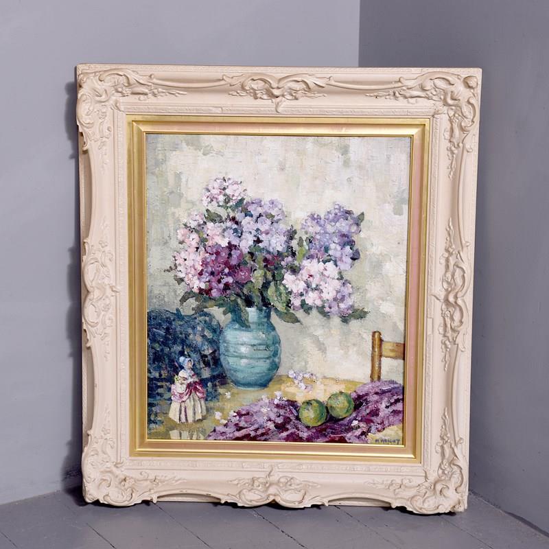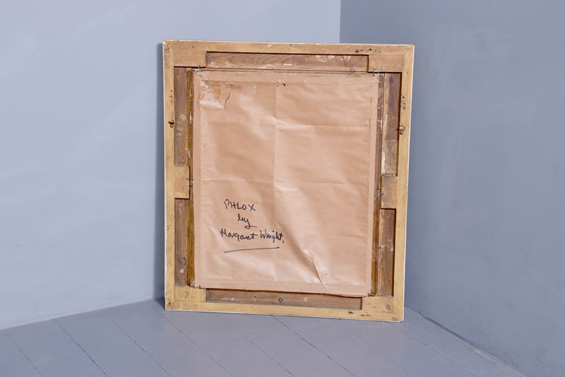 Circa 1930s. A large still oil painting of a vase with Phlox and some fruit, on a table, with stylish gilt slip, all contained in a painted, swept, moulded frame. The painting is signed on the right-hand side, verso, written, ‘Phlox by Margaret Wright’. The painting is well executed and in excellent condition. ‘Margaret Wright was born in Ayr in 1884, studying at the Glasgow School of Art from 1902 – 1908. She was part of the Glasgow society of lady artists and influenced by the Glasgow boys; she exhibited regularly at the Royal Glasgow Institute, Royal Scottish Academy, and the Paisley Art Institute.’