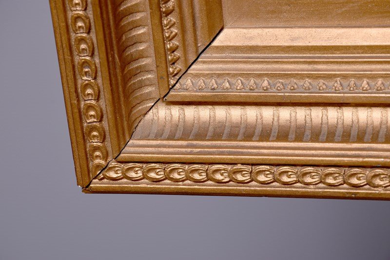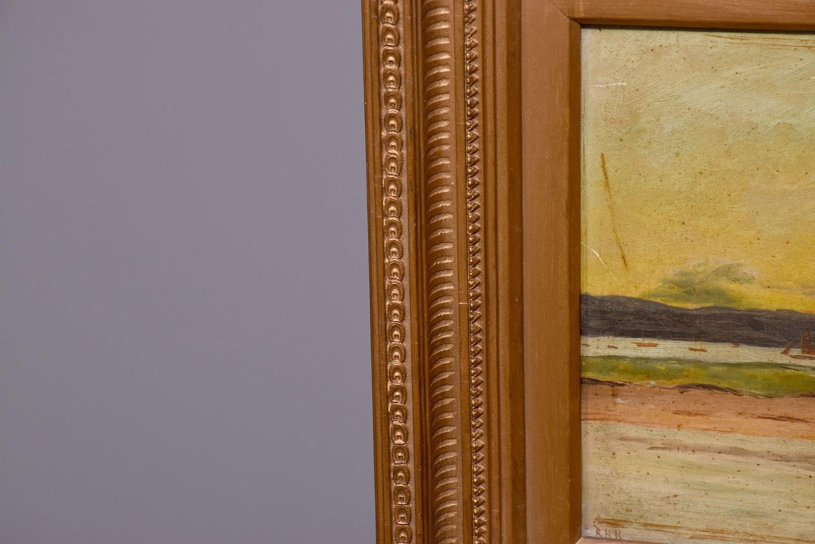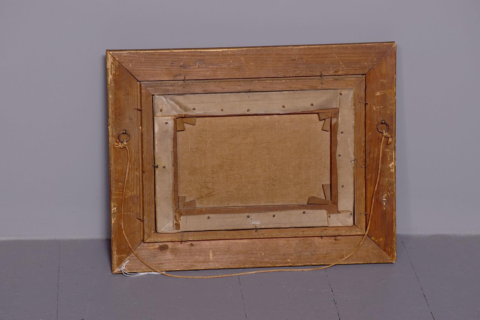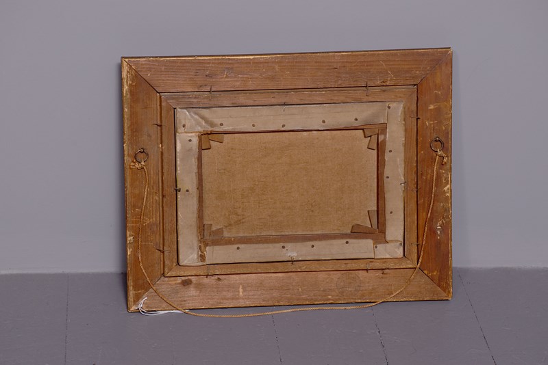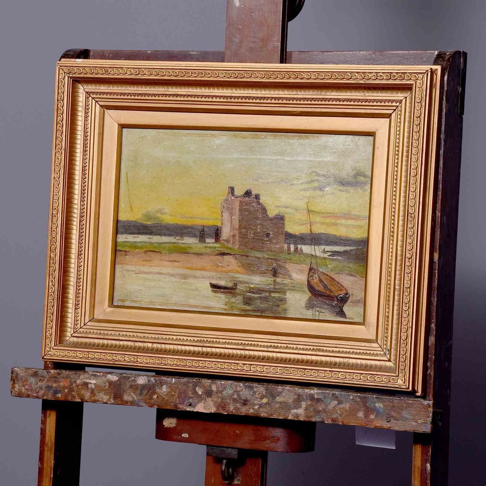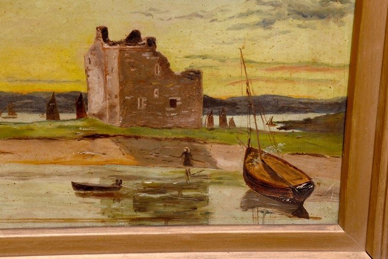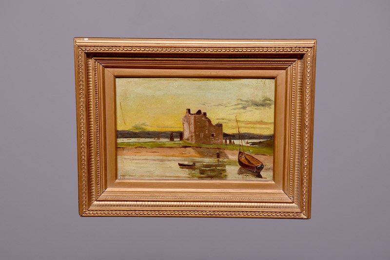 Circa 1900. A small oil on canvas in a gilded frame, the rectangular painting depicting a figure with a ruined castle with sailing boats in the foreground and background, the fort is sitting on a small raised mound, contained in a gilded slip and gilded and moulded gesso frame.