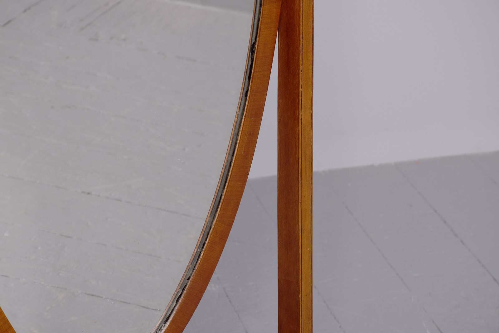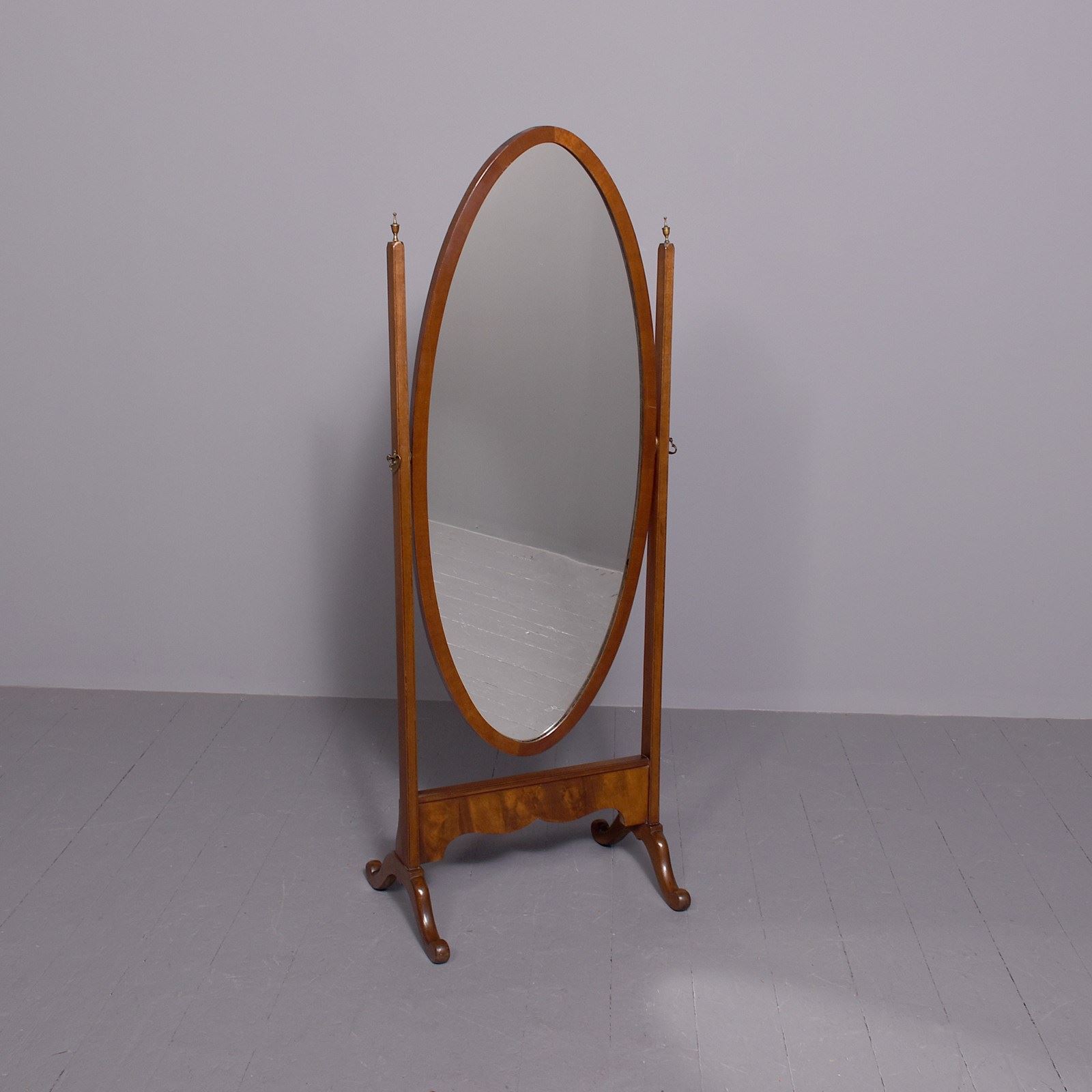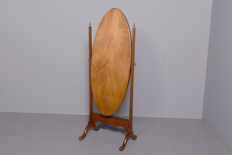 Circa 1920s. A stylish oval mahogany cheval mirror in a mahogany frame supported on two uprights with reeding on the fore-edge surmounted by brass finials in the form of urns, the mirror held in place by a pair of cast brass axe-head drops, beneath the mirror is a shaped frieze, with flame mahogany facing, supported on two uprights, all resting on four trestle feet with curled toes.