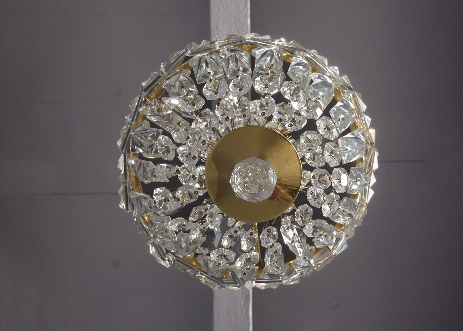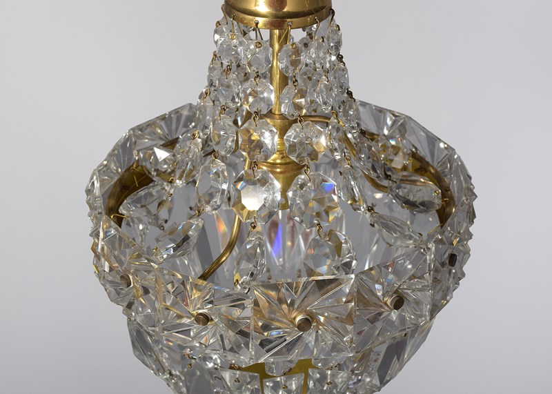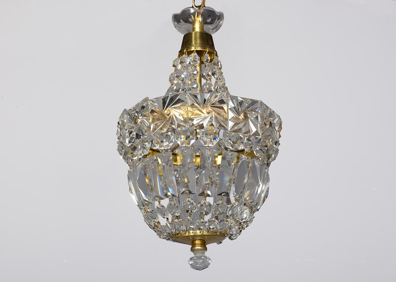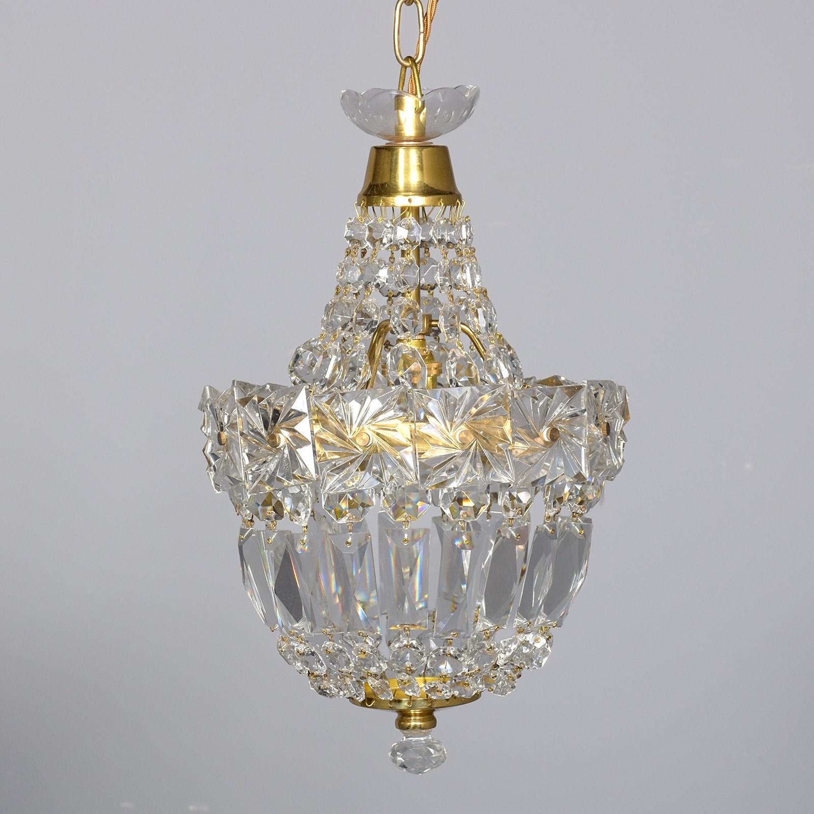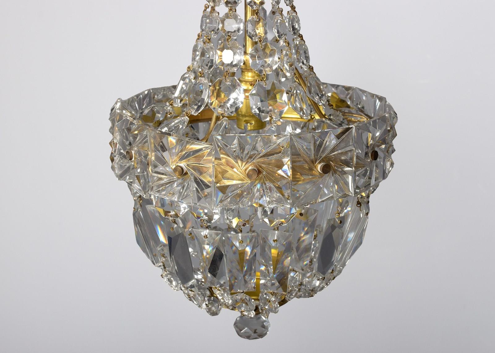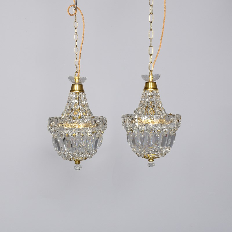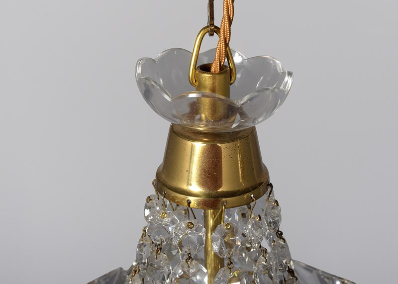 Circa 1930s. A stylish pair of neat sized brass and crystal light fittings, the glass corona with brass downward-facing bezel, the tent and bag chandeliers with single lamp fitting with tapering facets of glass and central brass bezel with large squares of engraved glass, the base hasvarious shaped glass crystals finishing with a brass base with downward facing crystal. (Recently cleaned and re-wired)