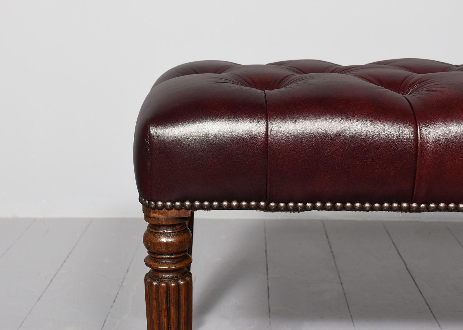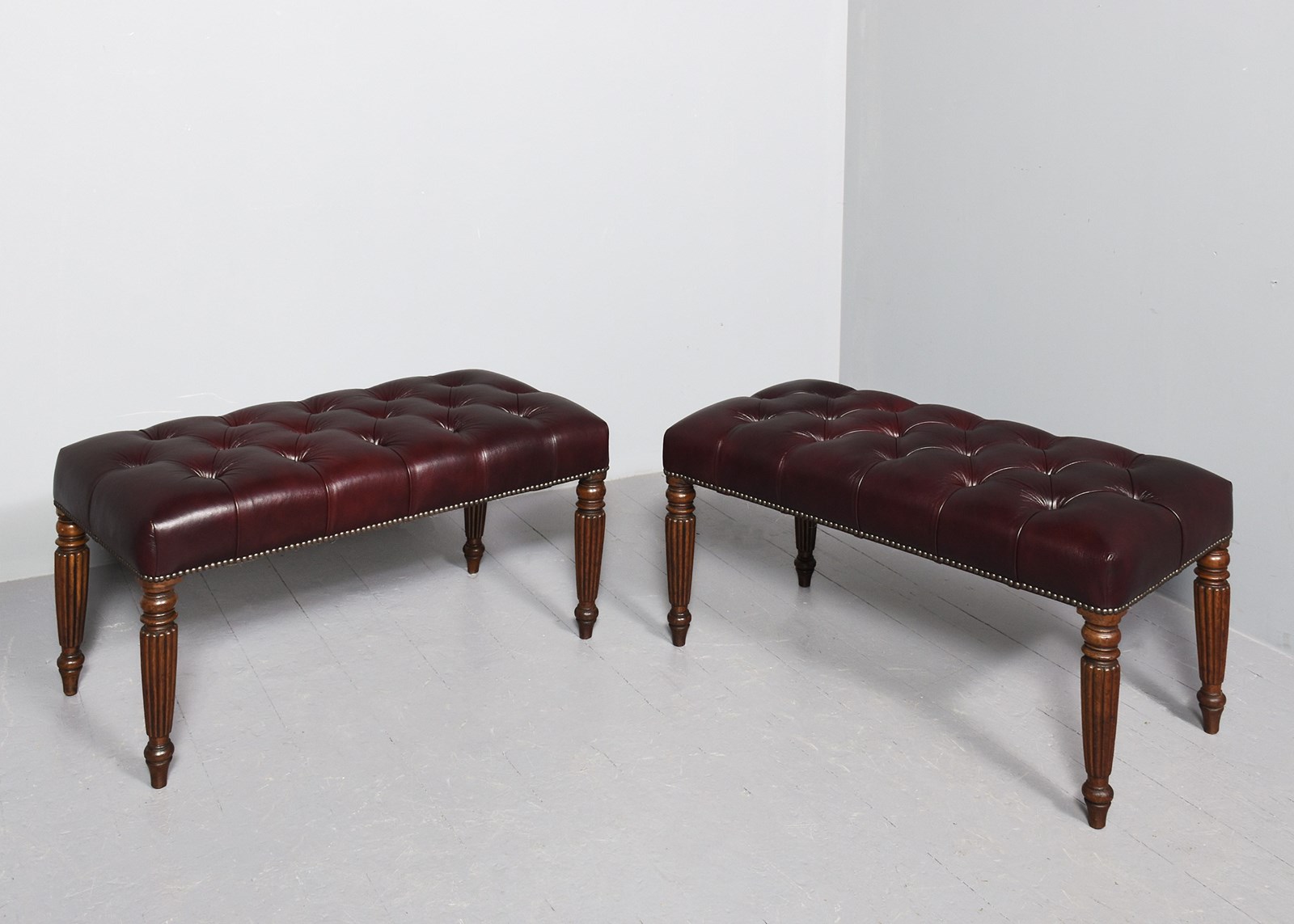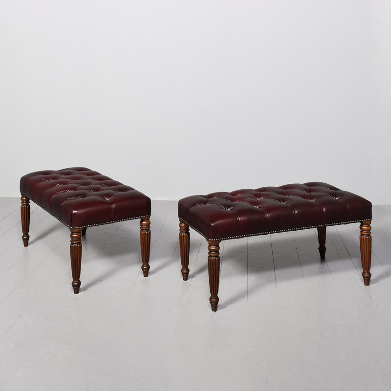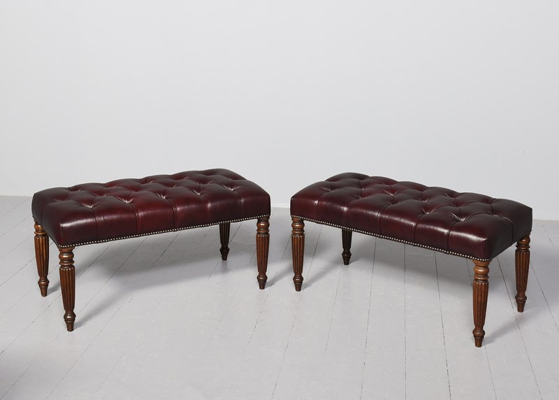 Circa 1820 and later. Pair of George III mahogany buttoned Burgundy coloured leather and brass-studded long stools. The tops in deeply buttoned, quality burgundy hide with brass studding around the edges and supported on tapering fluted George III legs. Sturdy and in excellent condition.