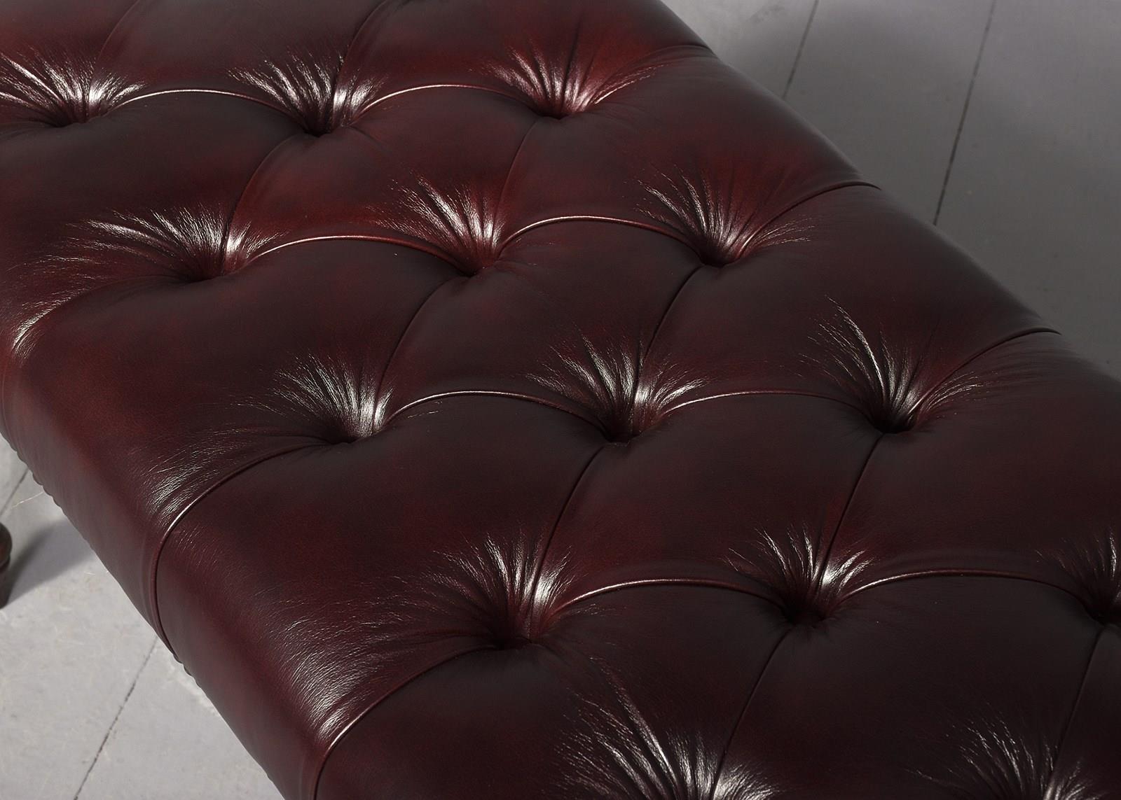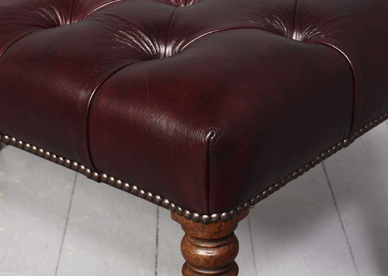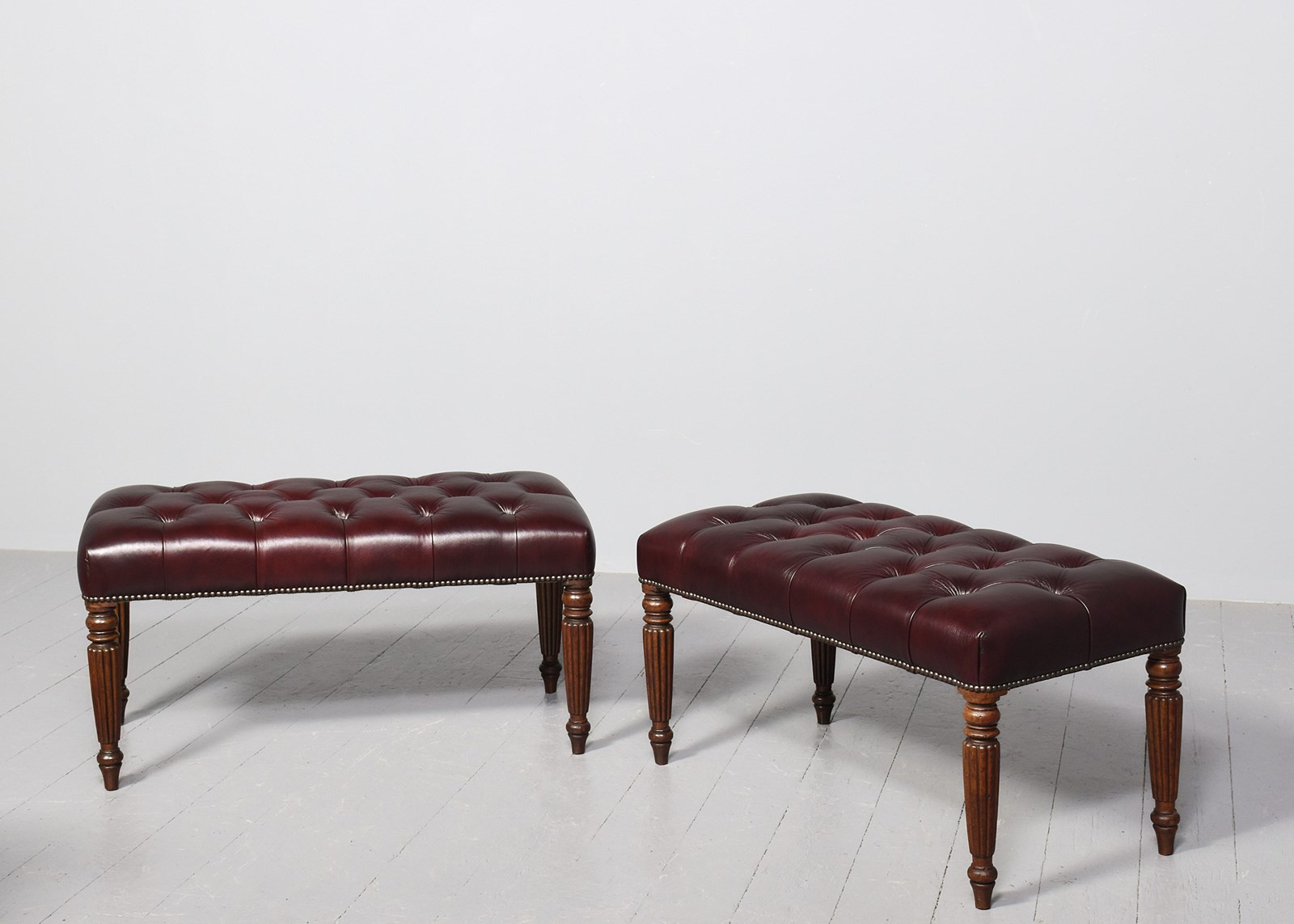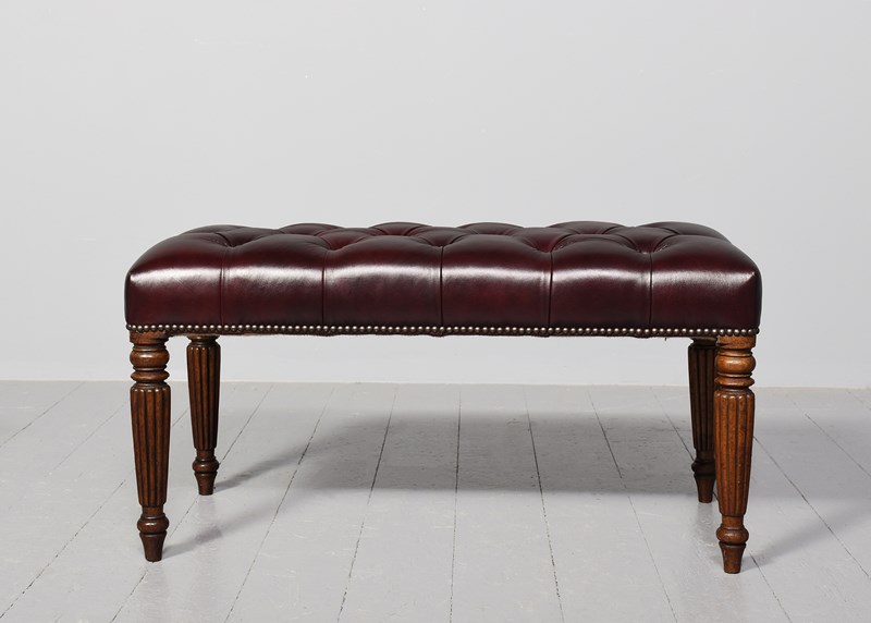 Circa 1820 and later. Pair of George III mahogany buttoned Burgundy coloured leather and brass-studded long stools. The tops in deeply buttoned, quality burgundy hide with brass studding around the edges and supported on tapering fluted George III legs. Sturdy and in excellent condition.