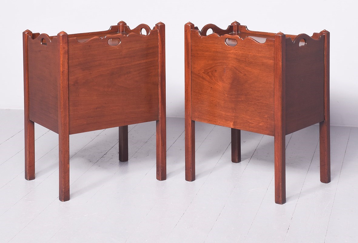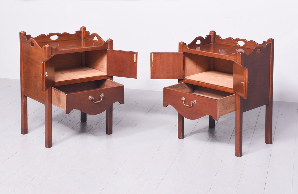 Circa 1990s. A pair of George III style mahogany bedside commodes. The tops with shaped and raised gallery with pierced lifting handles to the sides and back. To the front a pair of cupboards opened with brass ax head drop handles, beneath this a drawer with a swan neck handle and a very stylish shaped frieze. The commodes rest on four square legs with reeding on all facings. Excellent colour and good condition.