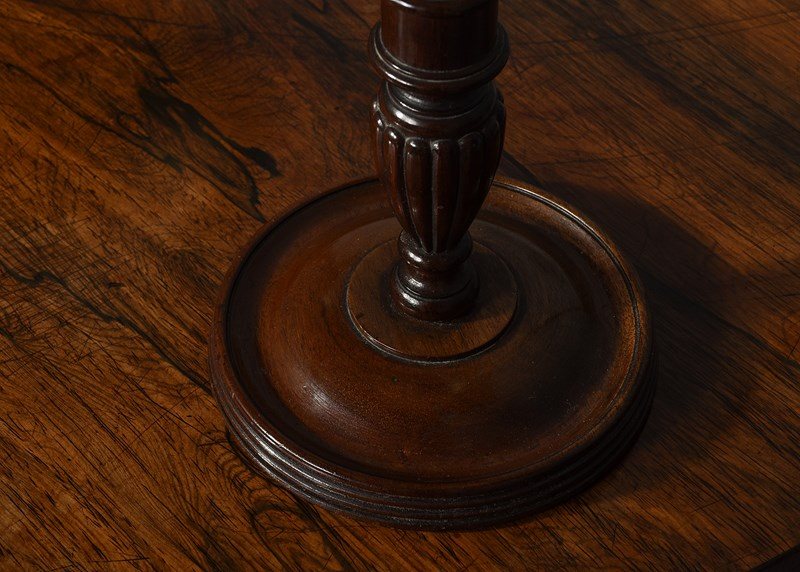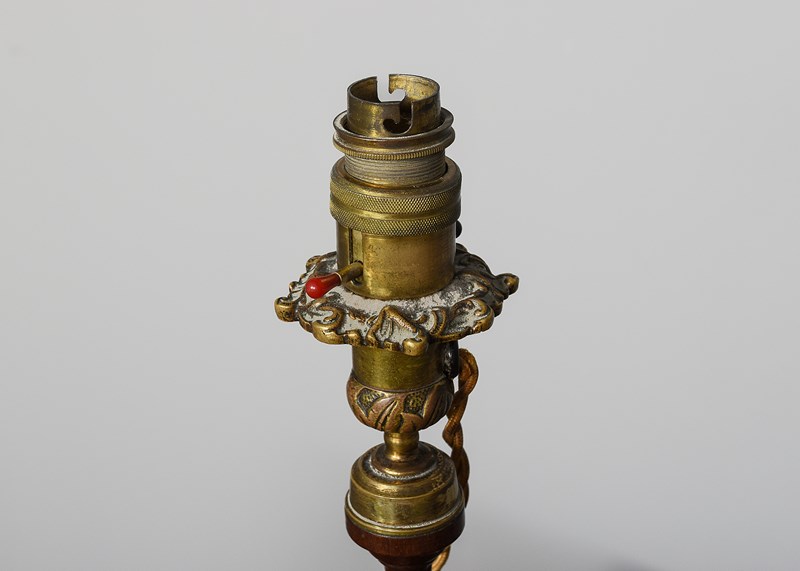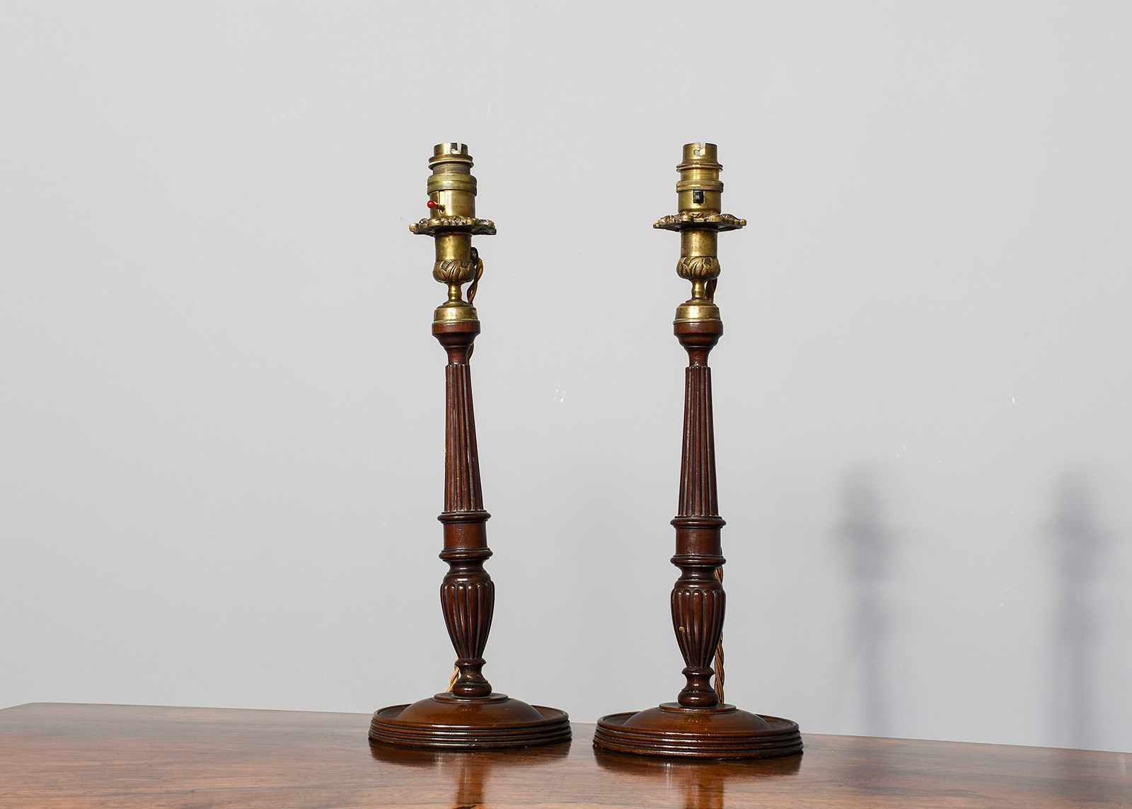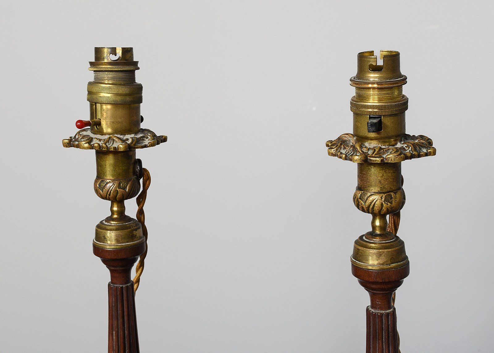 Circa 1880. A pair of George III style mahogany candlesticks (converted to electricity), the tops with brass candle holders and original nozzles decorated on the top and resting on an urn shape, the wooden stem with a brass cap, with carved urn towards the base resting on a dished circular base with ribbing to the fore-edge.