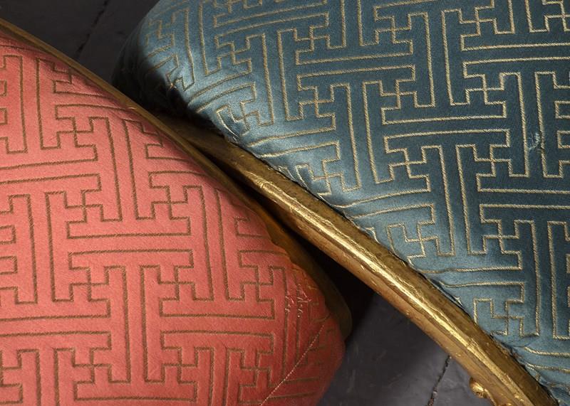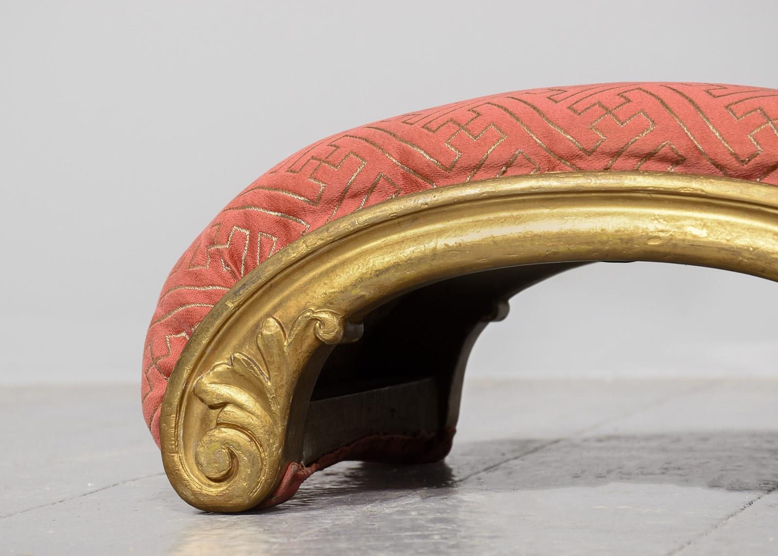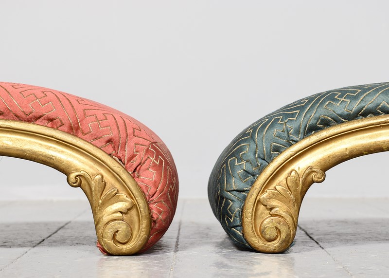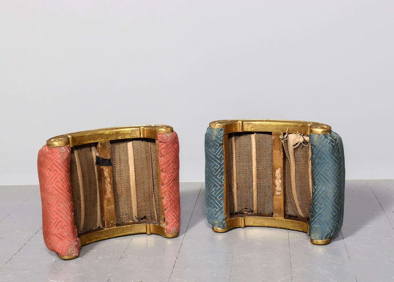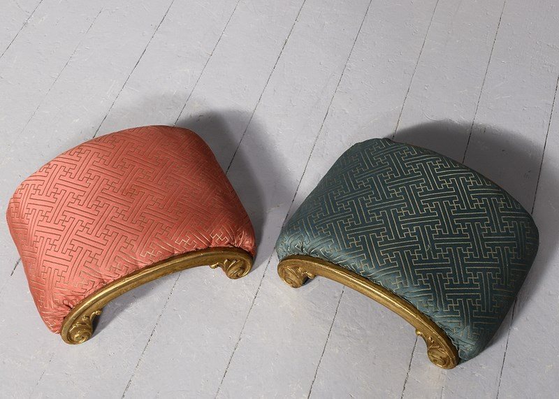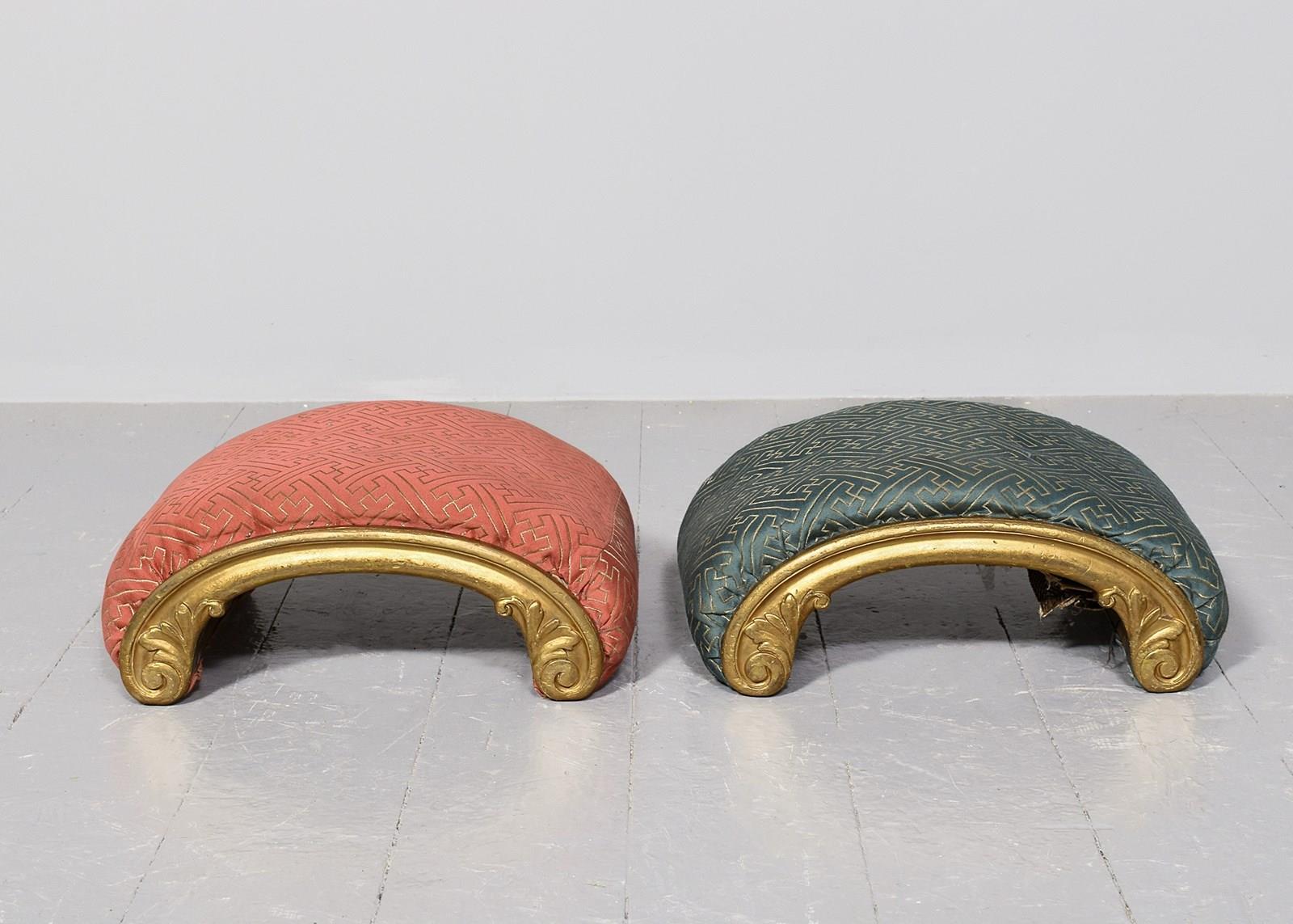 Circa 1825. An unusual and stylish pair of carved and gilded footstools with a stuffed over top, with the curved frame with foliate carving towards the base on each side. The underside of the stools is braced, and both with the remnants of a trade label.